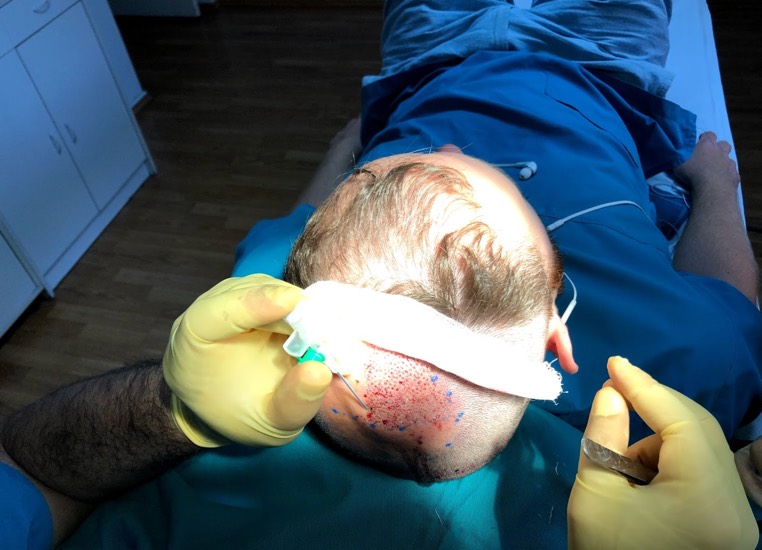 Ablauf exakt wie gestern: 550 Grafts werden vom linken Hinterkopf entnommen. Die Spritzen gehen mir furchtbar auf den Sack.
