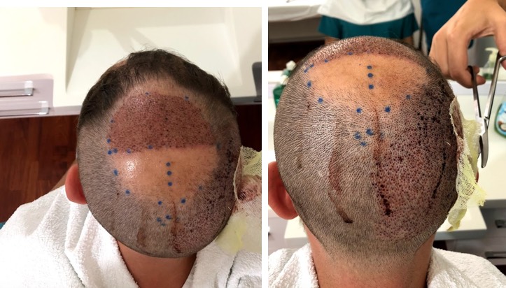 Vor einer Woche hatte ich meine 2. HT: unrasiert, weshalb der Prozess der Entnahme deutlich länger dauert. Daher wurde die OP auf zwei Tage verteilt, 1x 12 Stunden, 1x 8 Stunden.