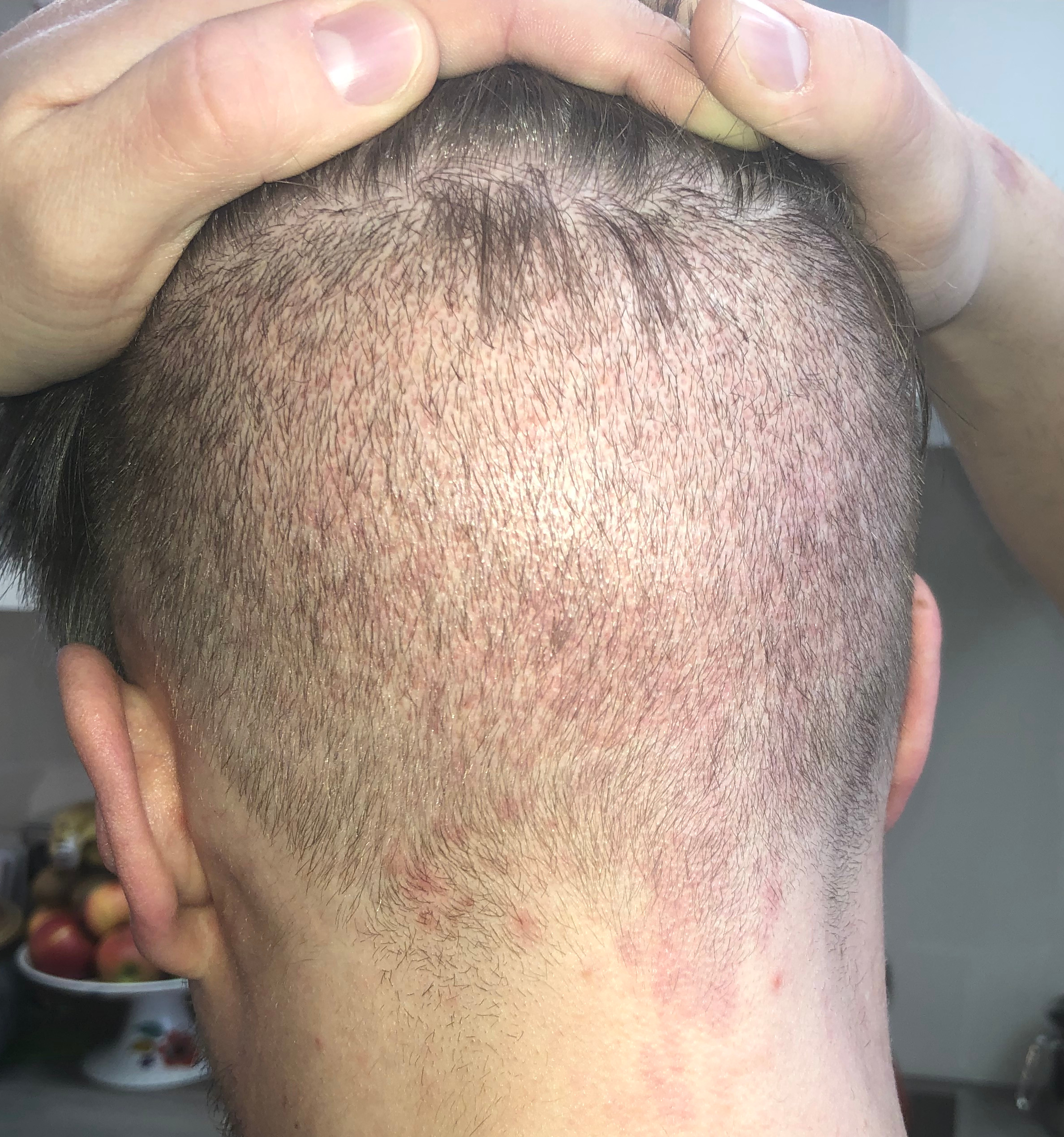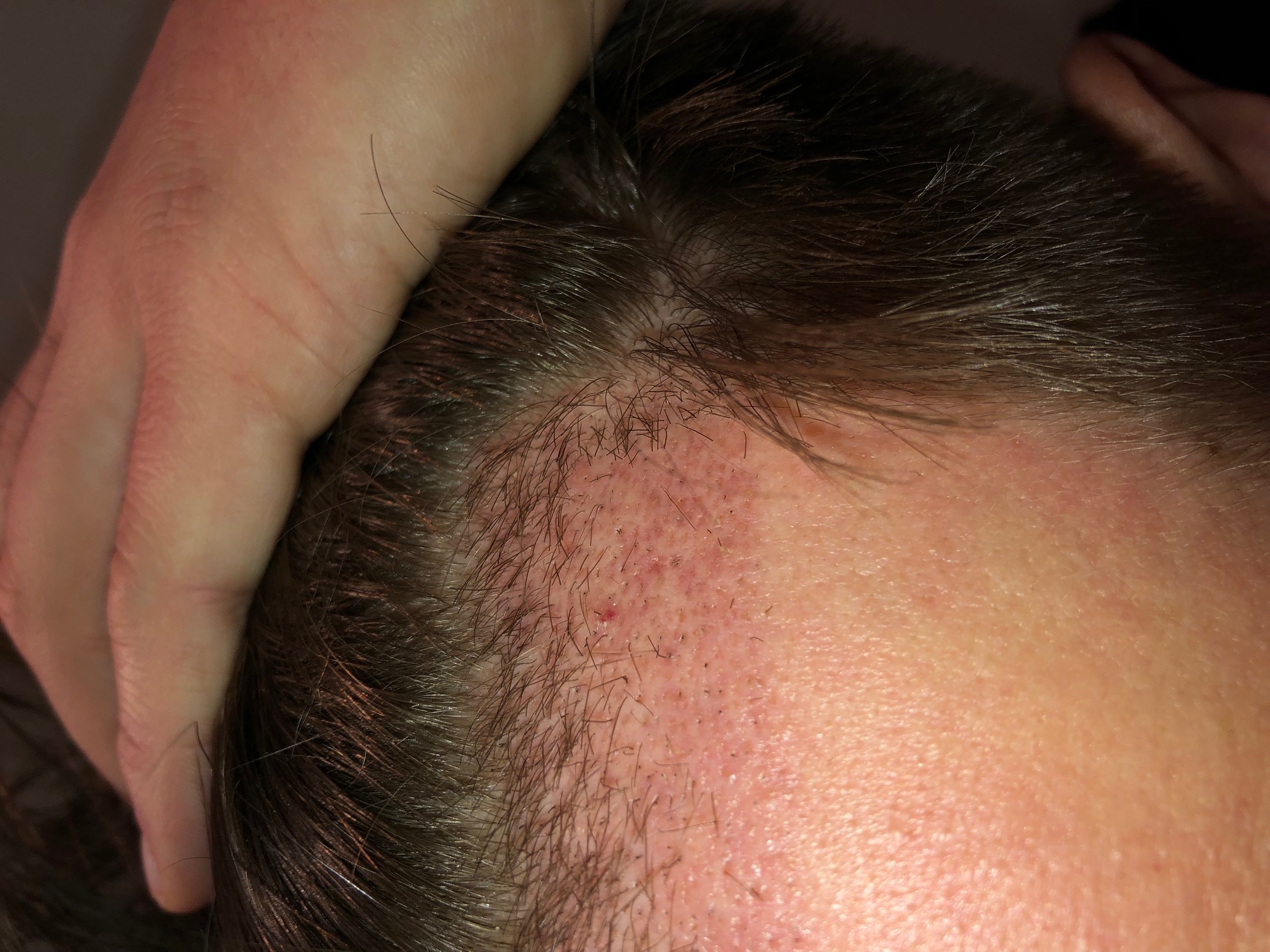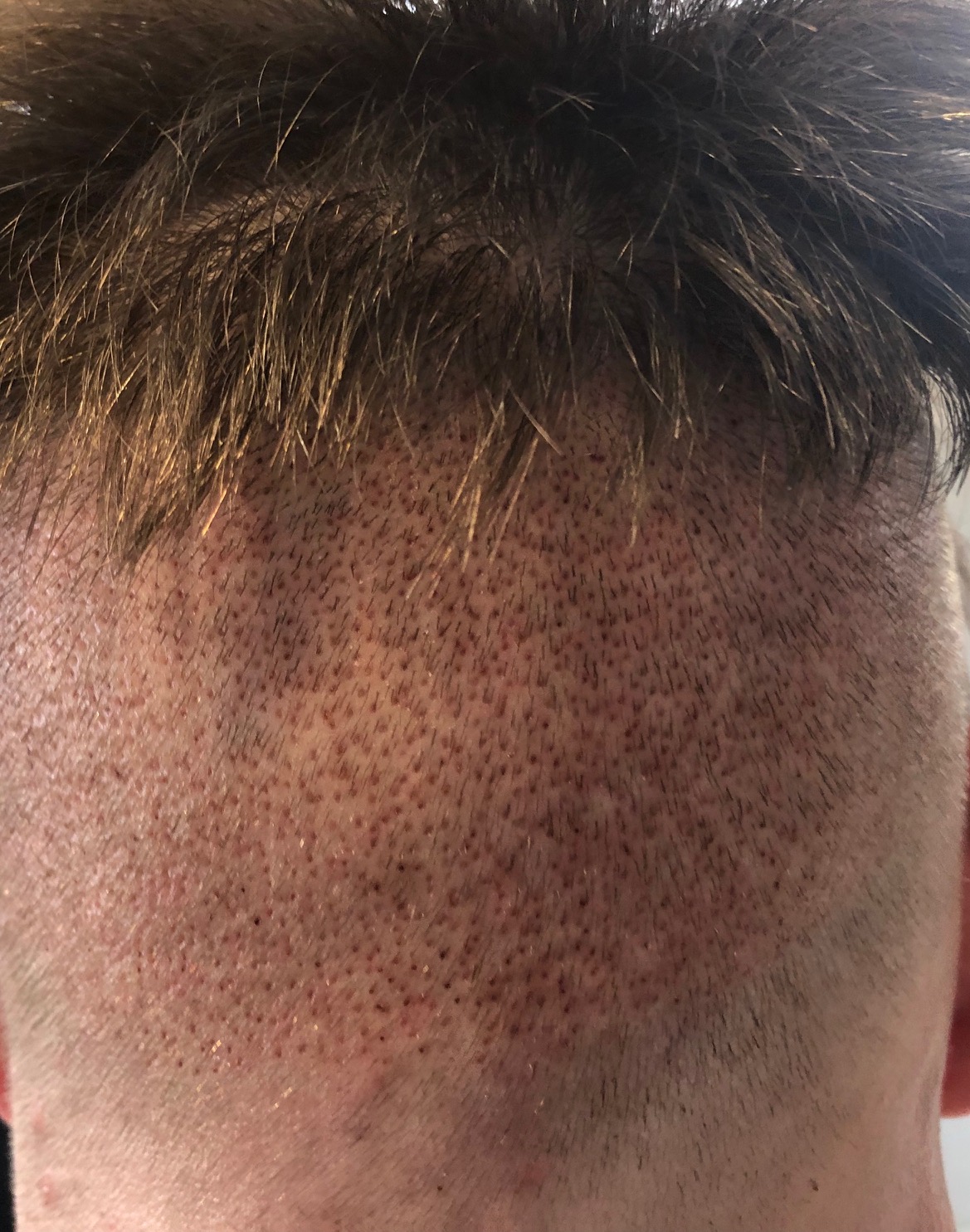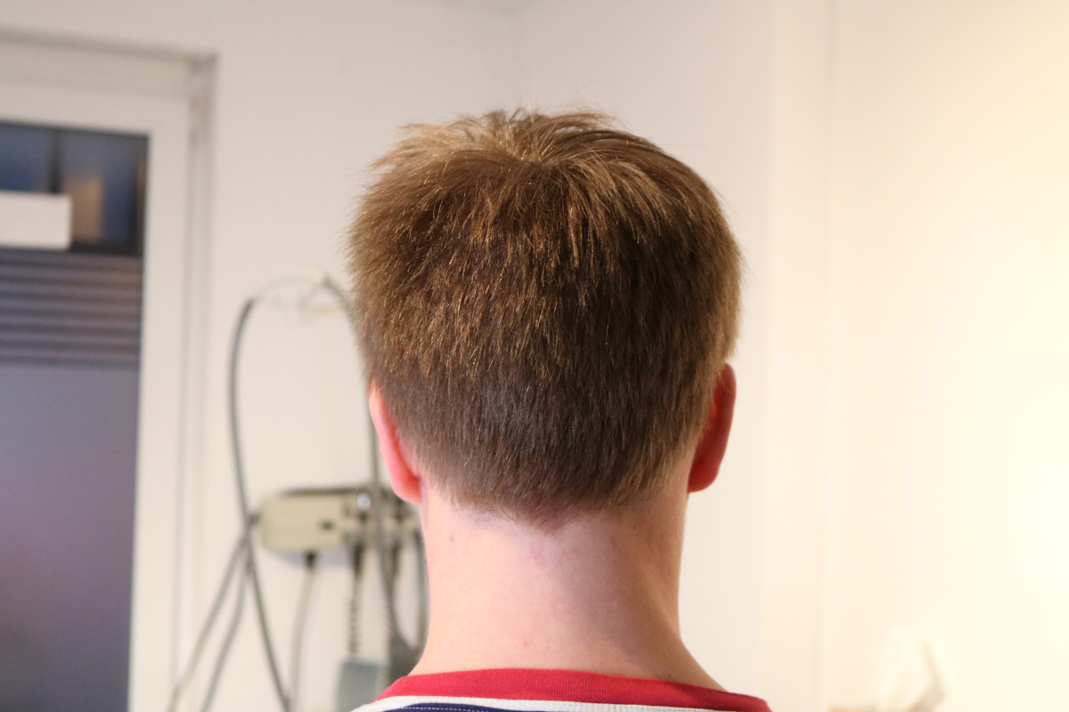 Die Haare im Donor waren sicher paar cm, sind jetzt aber ab, habe gerade schon eine etwas spezielle Frisur am Hinterkopf... Werde aber in ~2 Wochen alles außer das obere Deckhaar auf die gleiche Länge kürzen lassen.