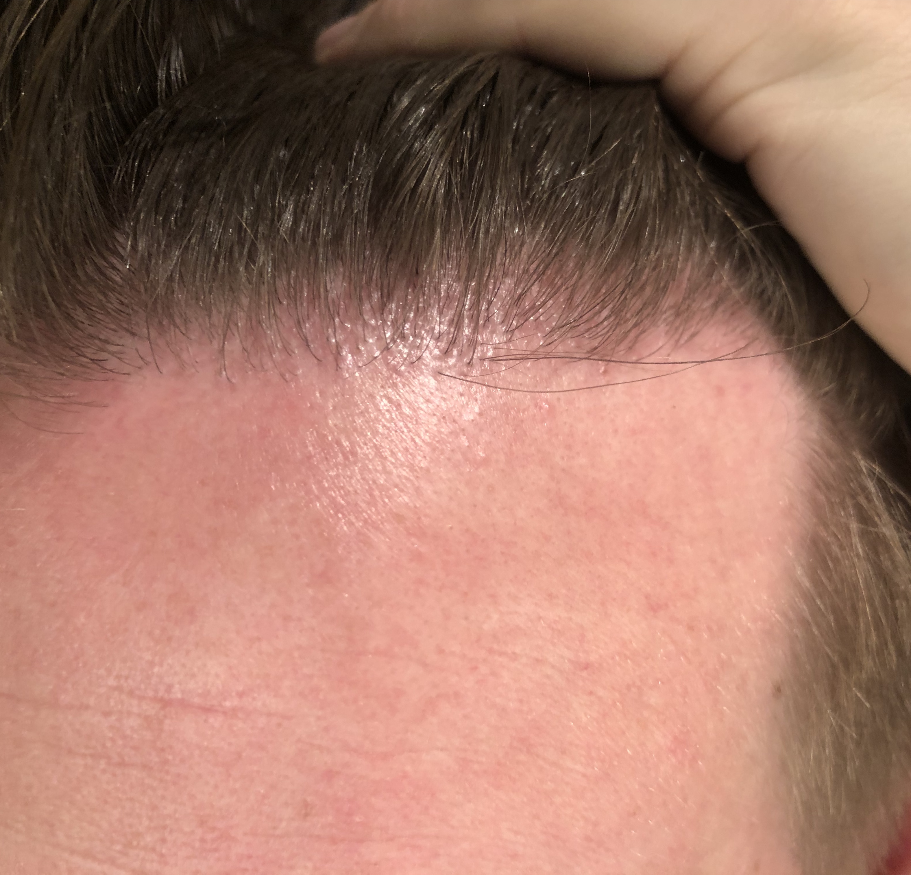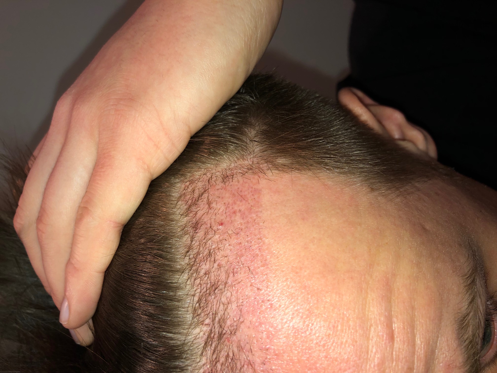 Im Anschluss zeichnete Sabine die gewünsche Haarlinie und es zeigte sich, dass ich unsymmetrische GHE habe (war mir noch gar nicht aufgefallen...). Linie natürlich so gezogen, dass das nachher symmetrisch ist. Bisschen noch dran rumoptimiert und dann war ich bereit für die Behandlung...