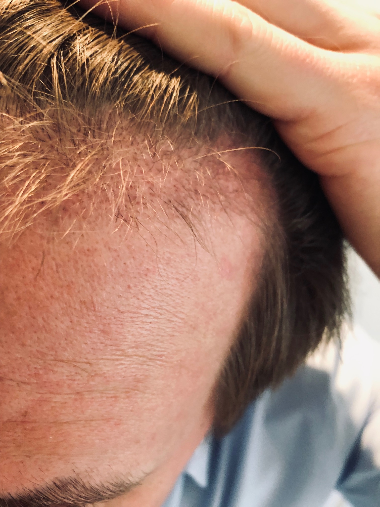 Behandlung: Entnahme und Einsetzen von 2.000 Grafts mittels FUE-Technik um die Stirnlinie/ Geheimratsecken zu begradigen.