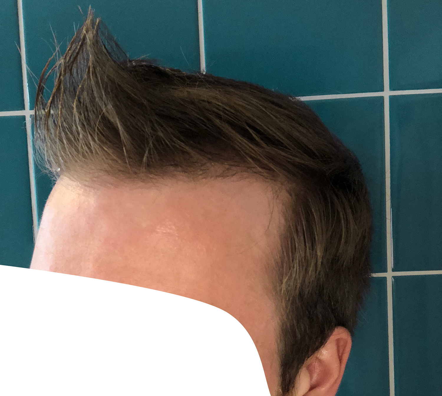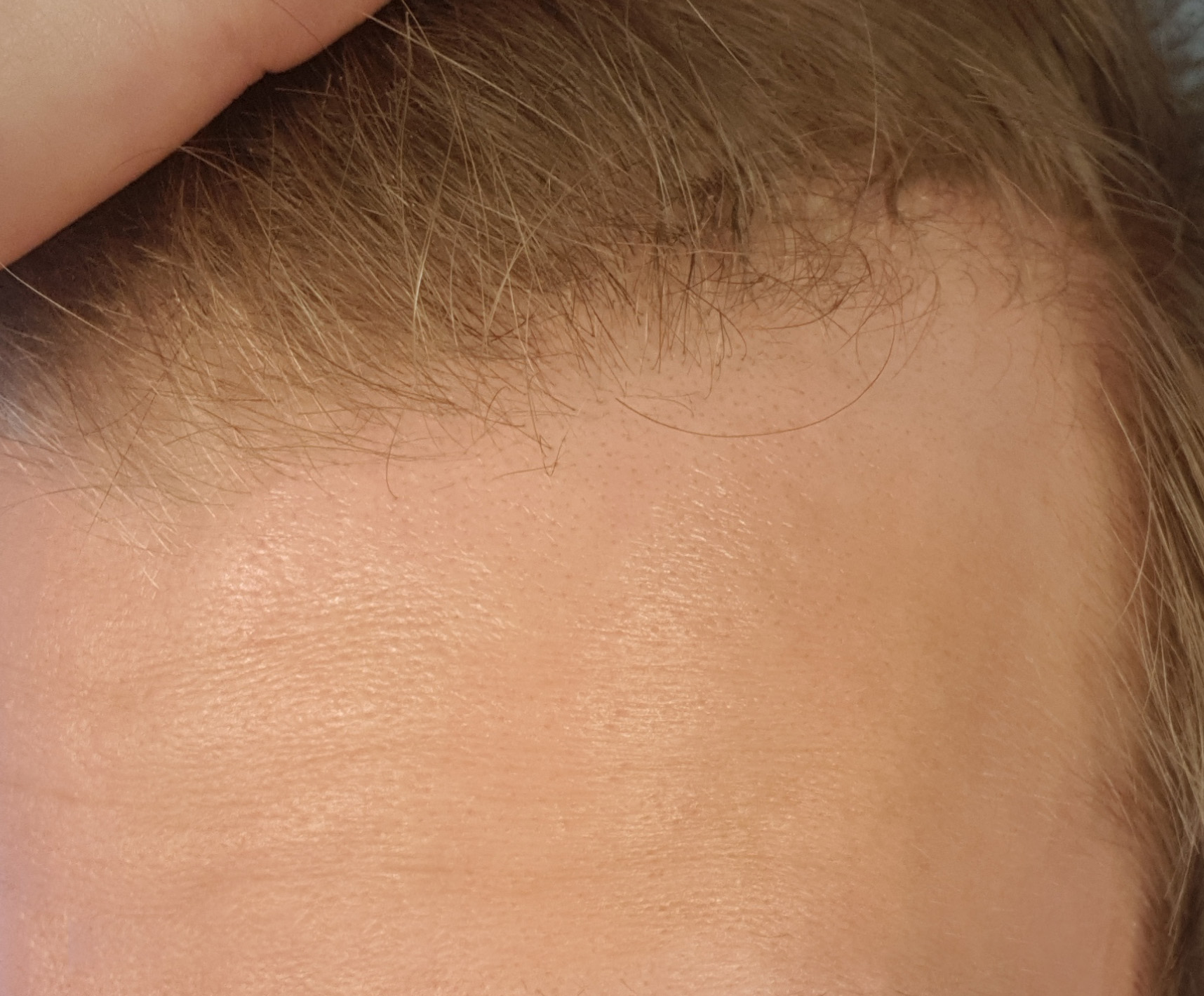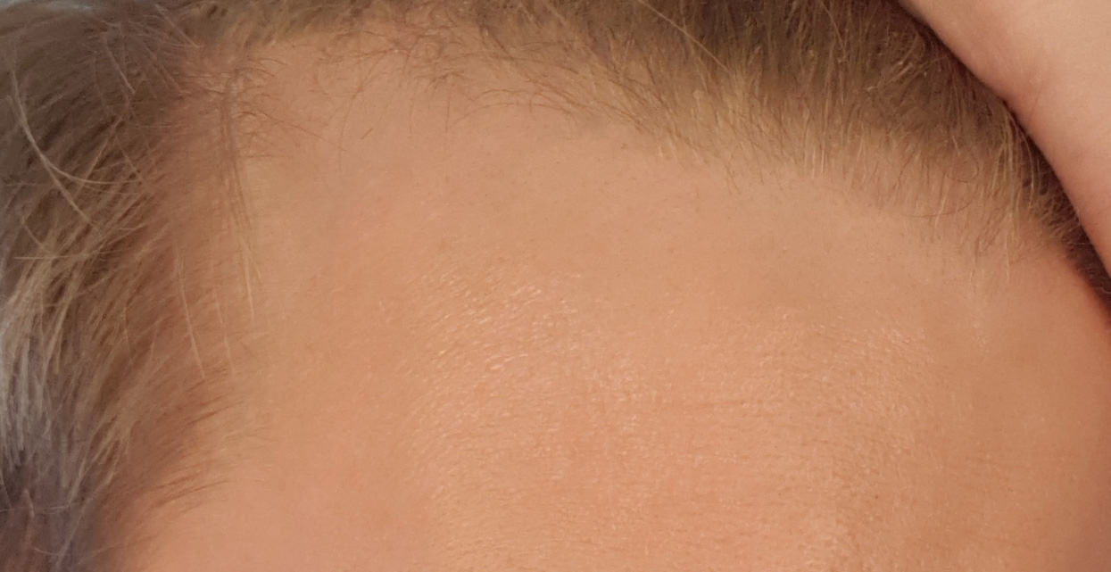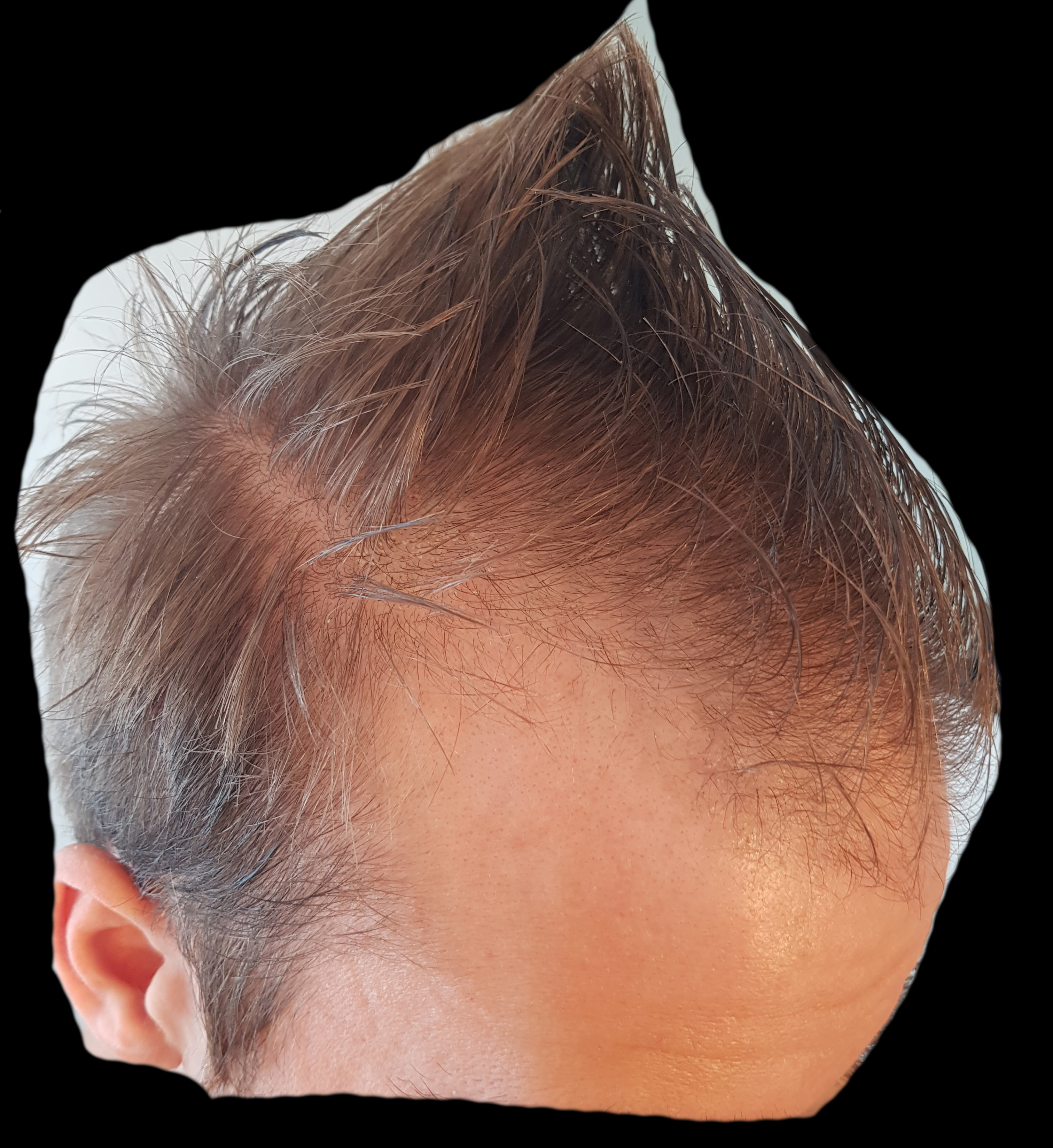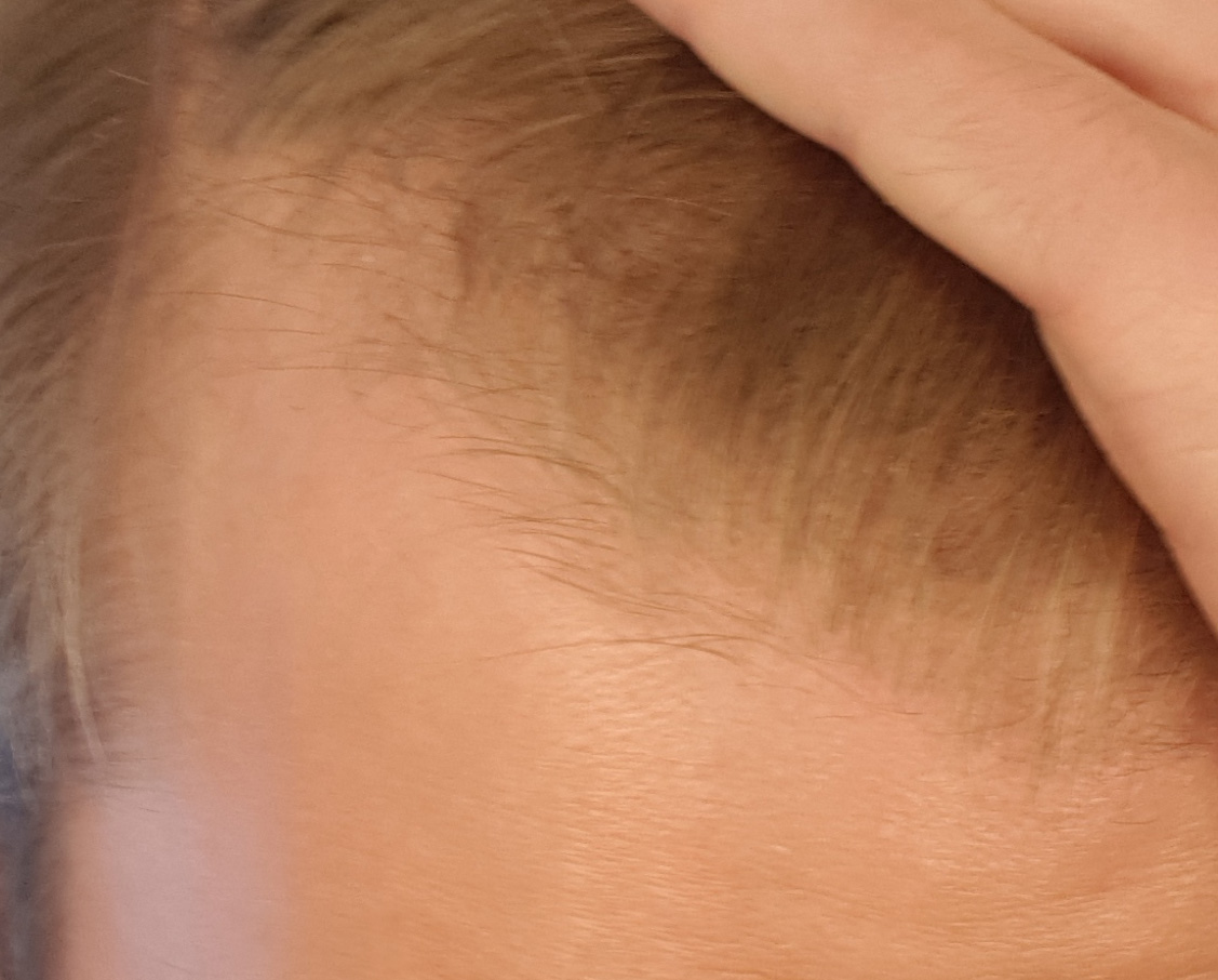 Ziemlich viele kleine Härchen nachgewachsen, auch an den Schläfen. An der rechten GRE sind sie sogar schon richtig lang, da ist ein ganzer Streifen dazugekommen. Die Mitte ist leider nicht wirklich dichter geworden, nur direkt am Ansatz.