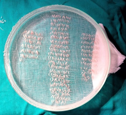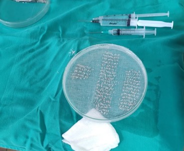 Nach 500 Grafts: Pause! Foto von der Schale. Bin überrascht, das ging dann doch recht schnell. Knappe Stunde vielleicht. Keine Probleme bei der Entnahme "alles normal" laut Dr. Keser.