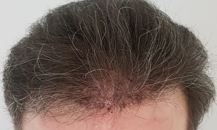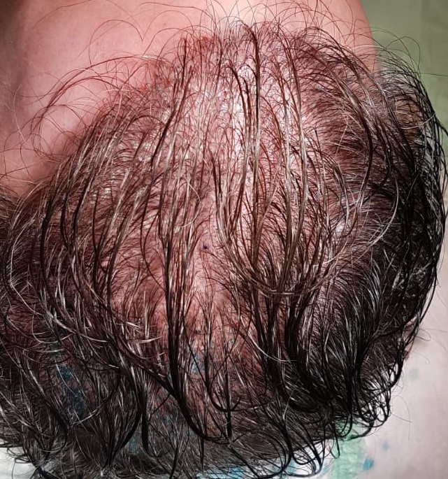 Grundsätzlich sollte man mit Gel/Haarspray noch einige Tage warten, bis die Krusten weg sind und die Heilung abgeschlossen ist, so auch bei dieser HT.