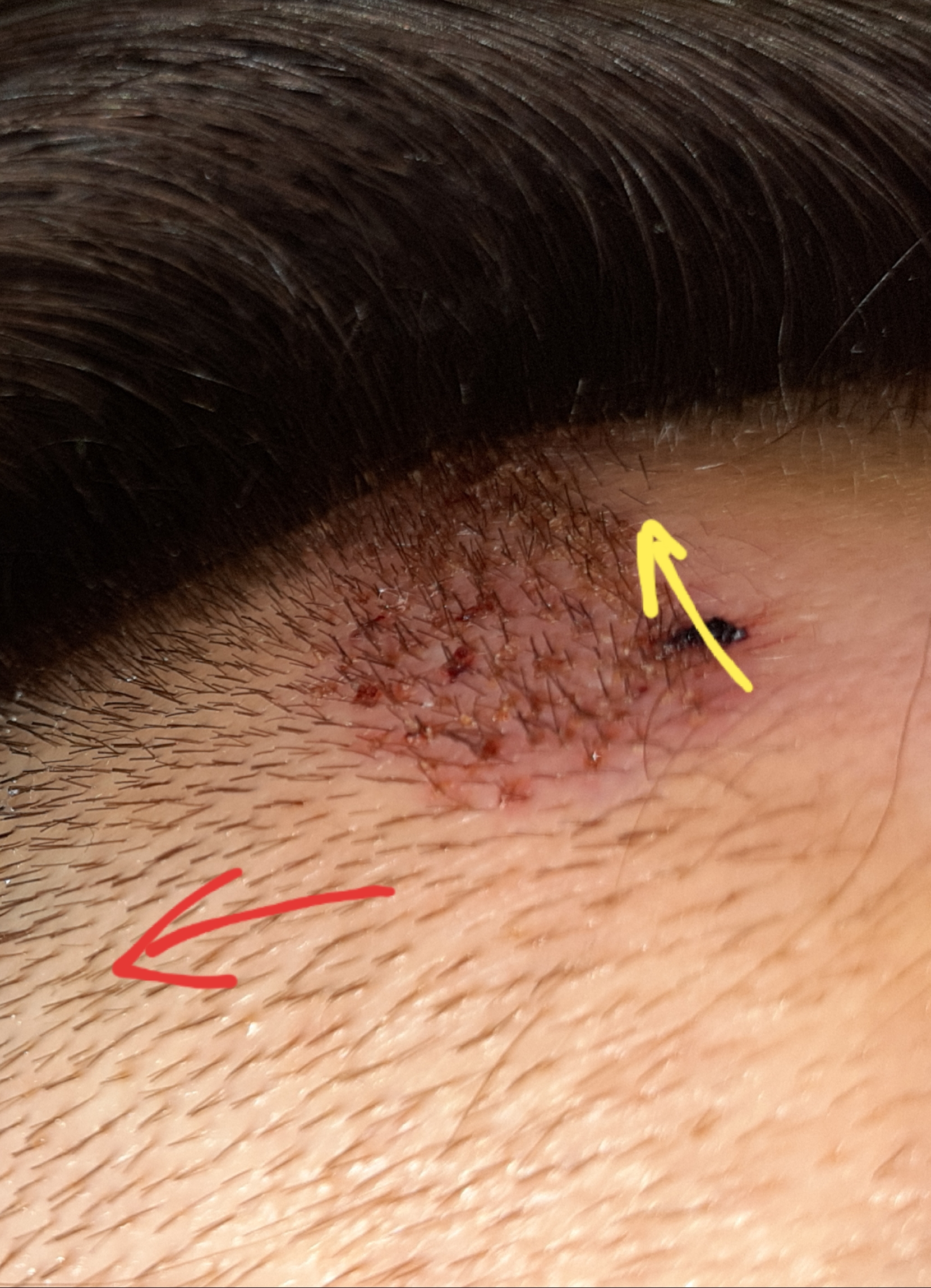 3. Grafts welche in die Temples eingesetzt wurden sind komplett falsch ausgerichtet, die Winkel stimmen überhaupt nicht mit den restlichen Haaren überein was total unnatürlich aussieht! Ich habe ihn am nächsten Tag ein Bild geschickt und er meinte die Grafts wären ordnungsgemäß platziert und ich solle mir keine Sorgen machen. Jeder Amateur sieht dass die Haare nicht richtig ausgerichtet sind.