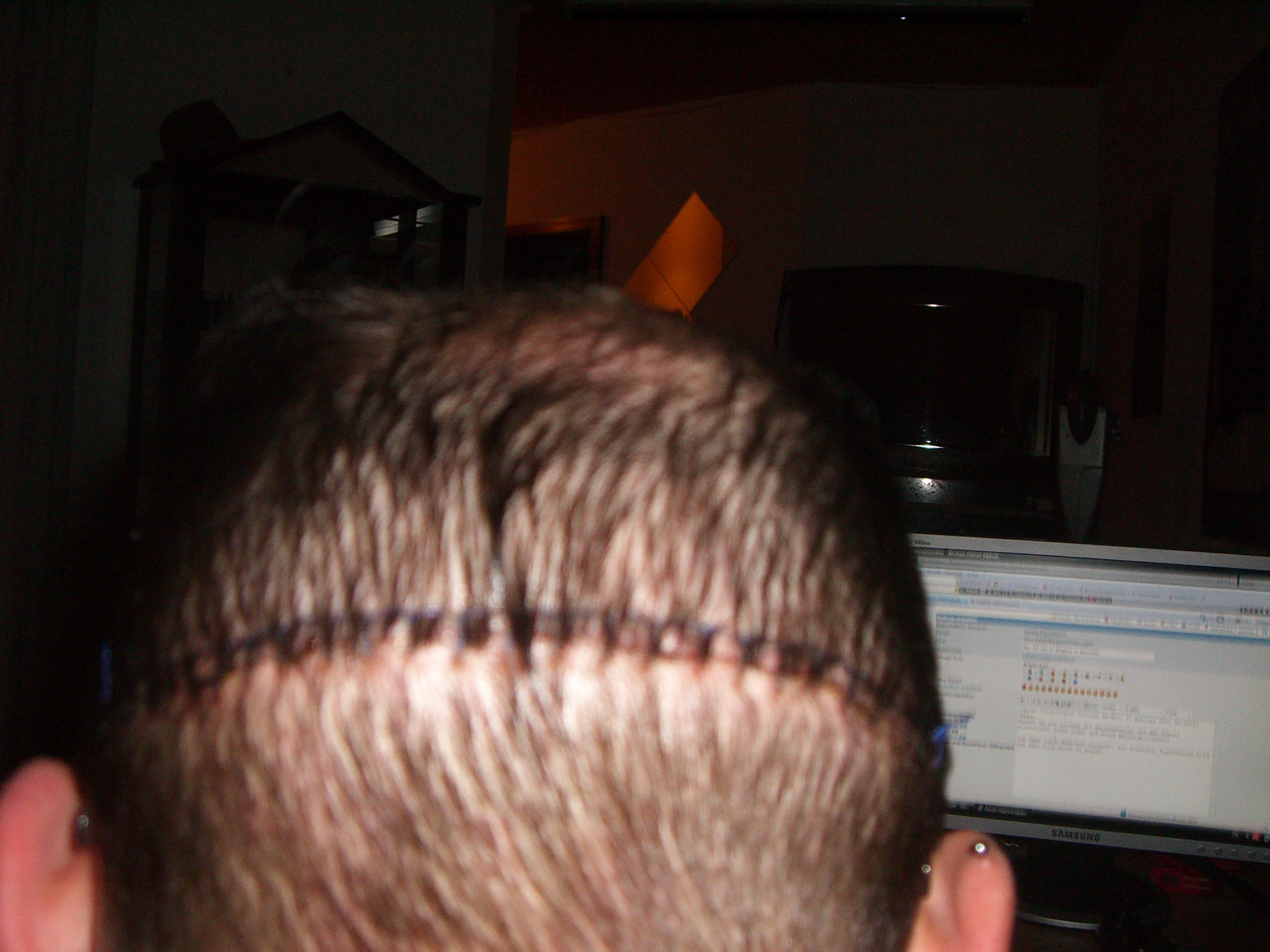 am 10. tag habe ich mir selbst die fäden gezogen. hatte keinerlei schmerzen dabei. narbe scheint ganz "hübsch" zu werden. bis heute sind sehr viele haare ausgefallen. daher nochmal zum vergleich: