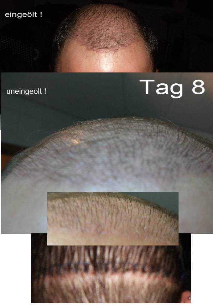 habe ab tag 4 den empfangsbereich mit babyöl eingeschmiert. ich habe seit gestern keinerlei krusten mehr...hier bilder von tag 8 after surgery...diese stoppeln zu fühlen ist ein wirklich schönes gefühl...