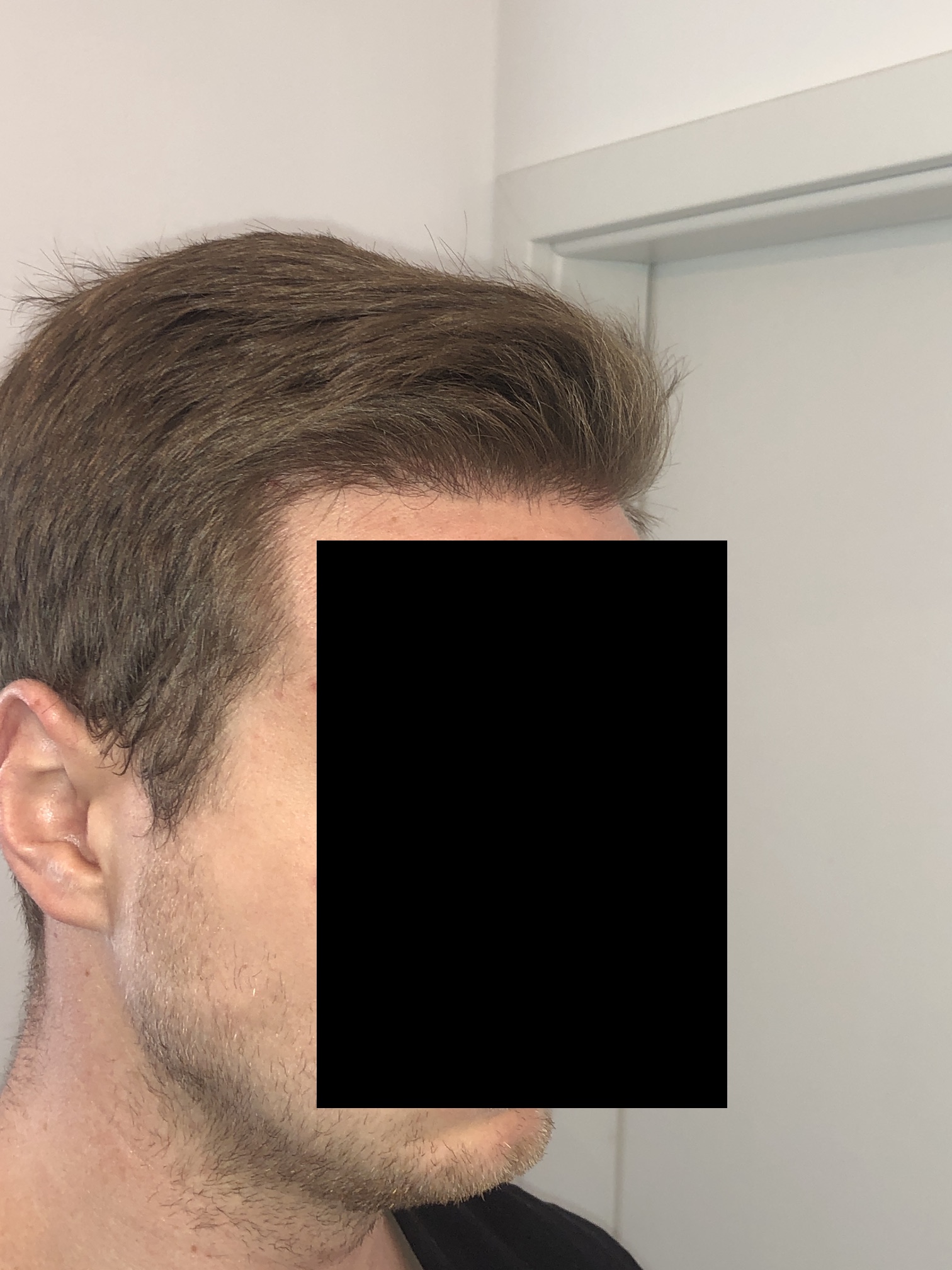 Der Übergang der rechten (von mir aus gesehen) Haarlinie ins Schläfendreieck ist ein bisschen hart und wirkt auf Grund der geraderen Haarlinie im Zusammenspiel mit dem geringer ausgeprägtem Schläfendreieck Gesamtbild etwas "eckig", dies finde ich auf der anderen Seite deutlich harmonischer