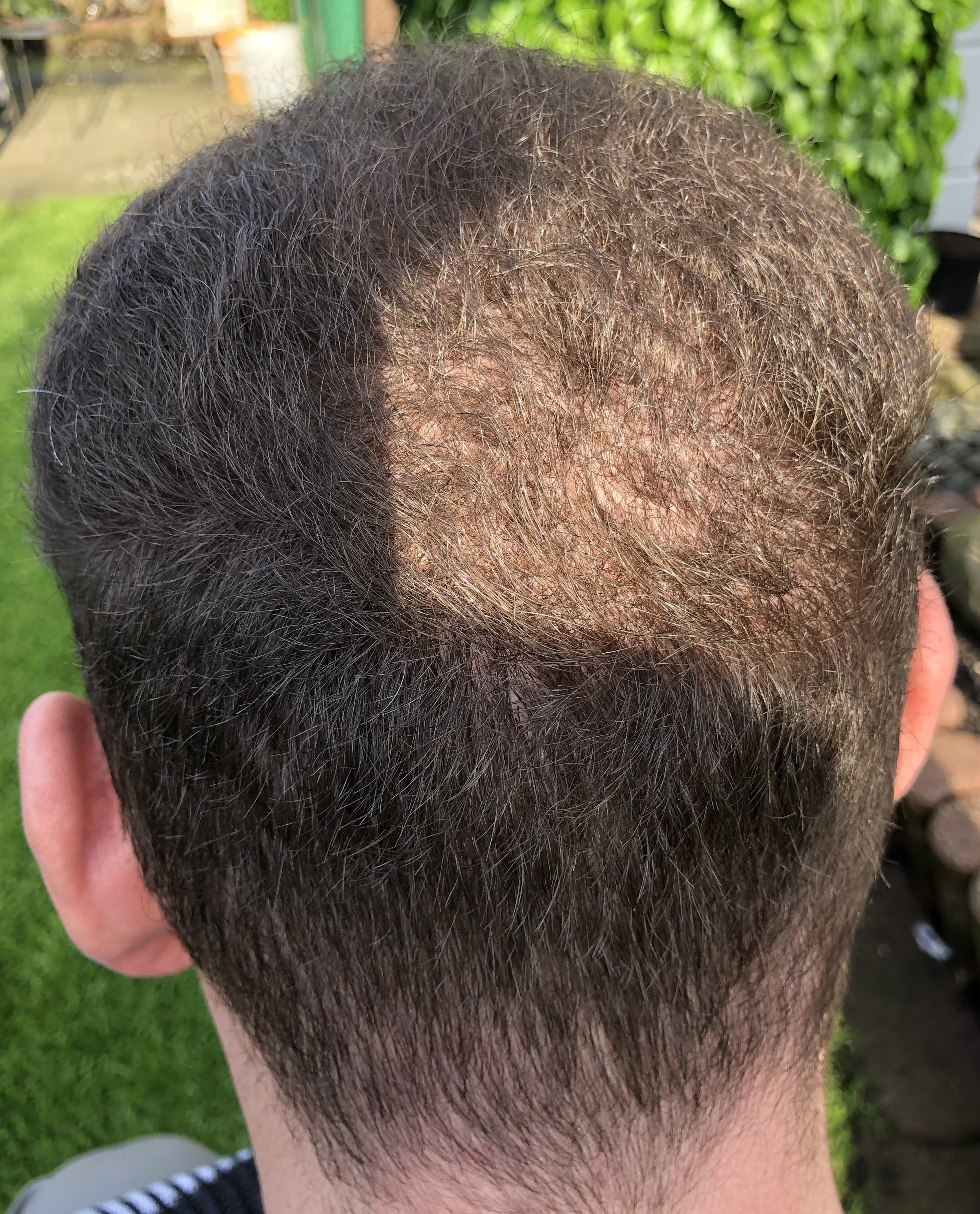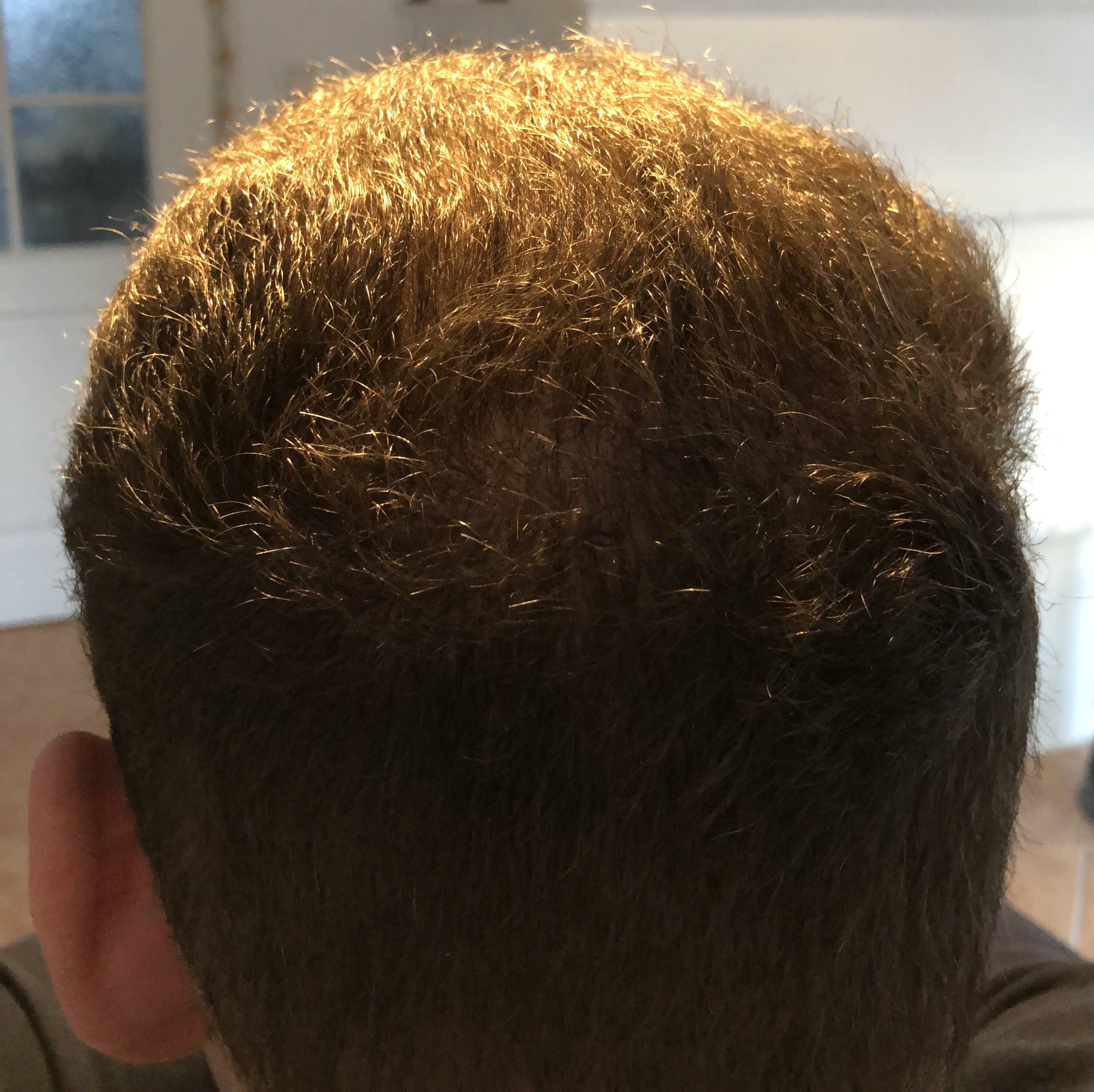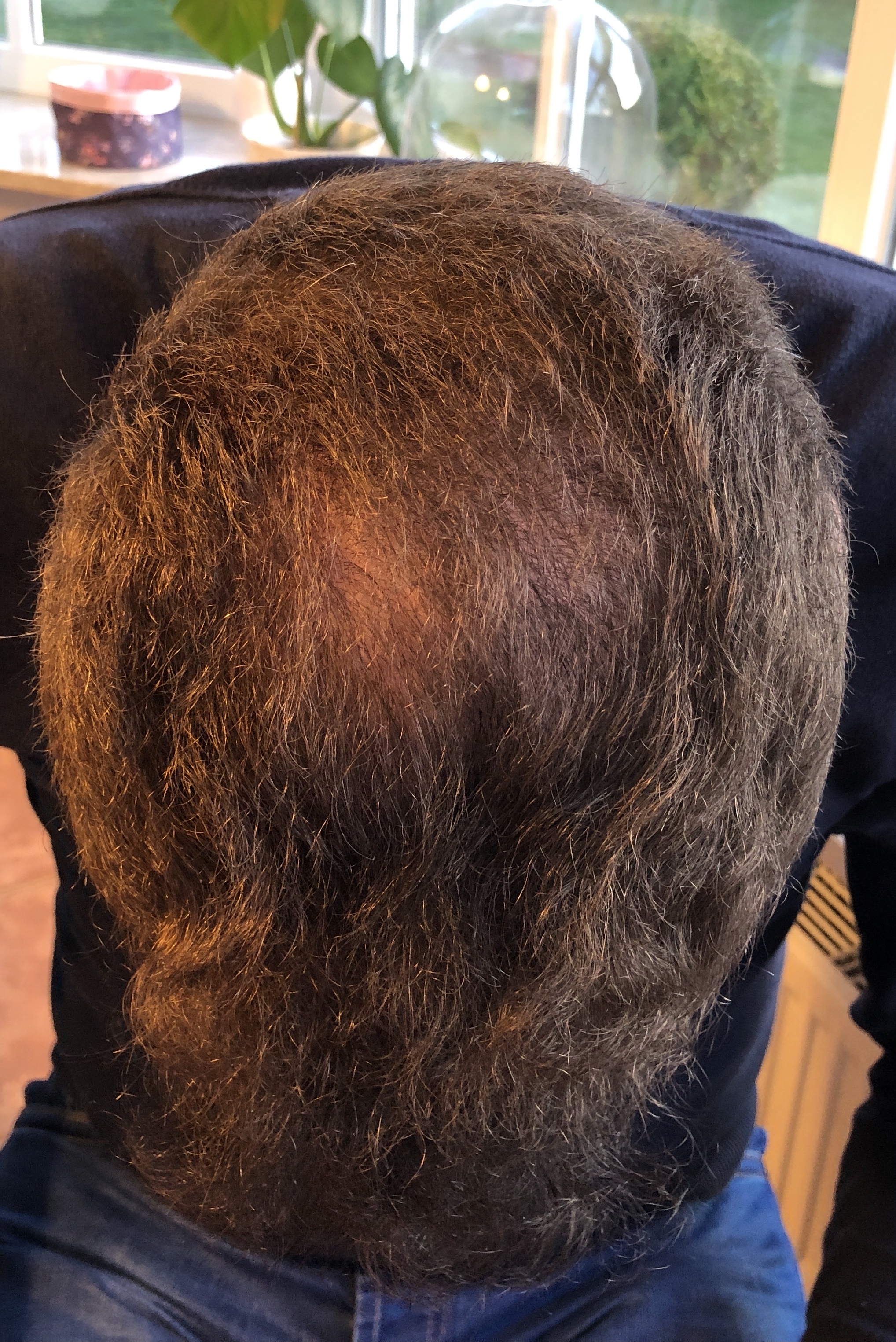 Auf dem Foto von oben wirken die Geheimratsecken nicht ganz dicht, kann aber auch täuschen. Die Tonsur braucht erfahrungsgemäß länger als die Haarlinie, da kann also auch noch was kommen.