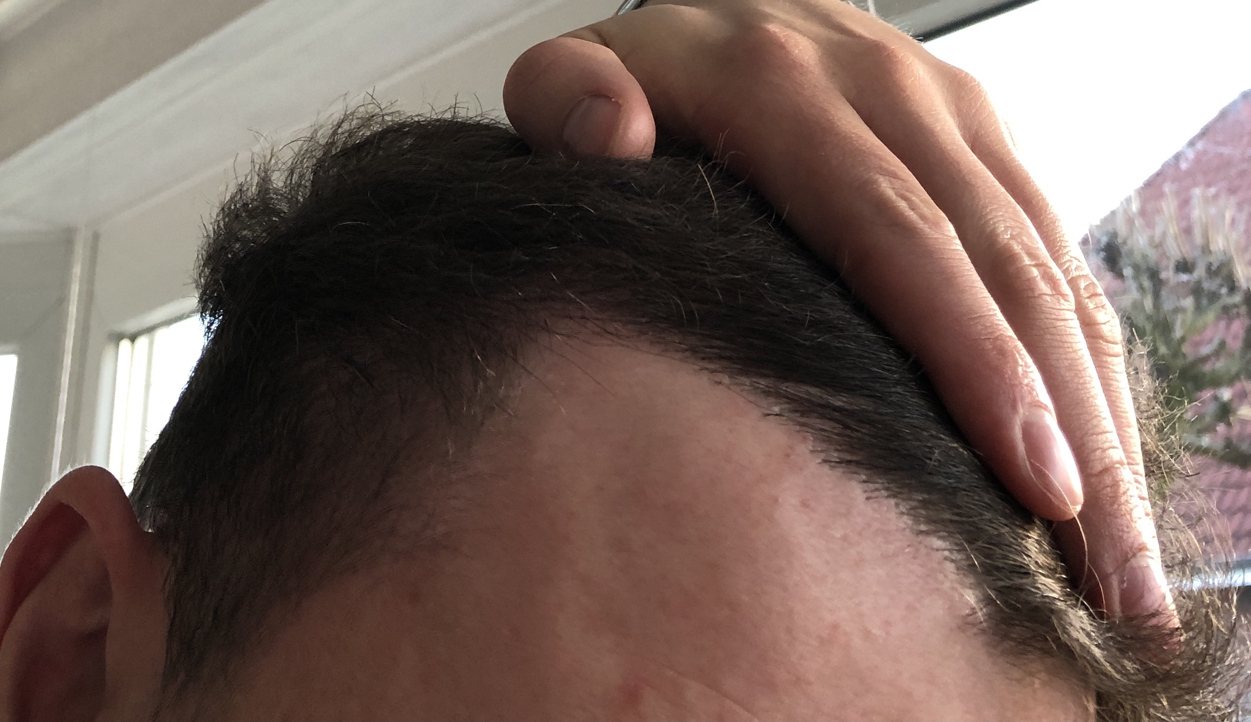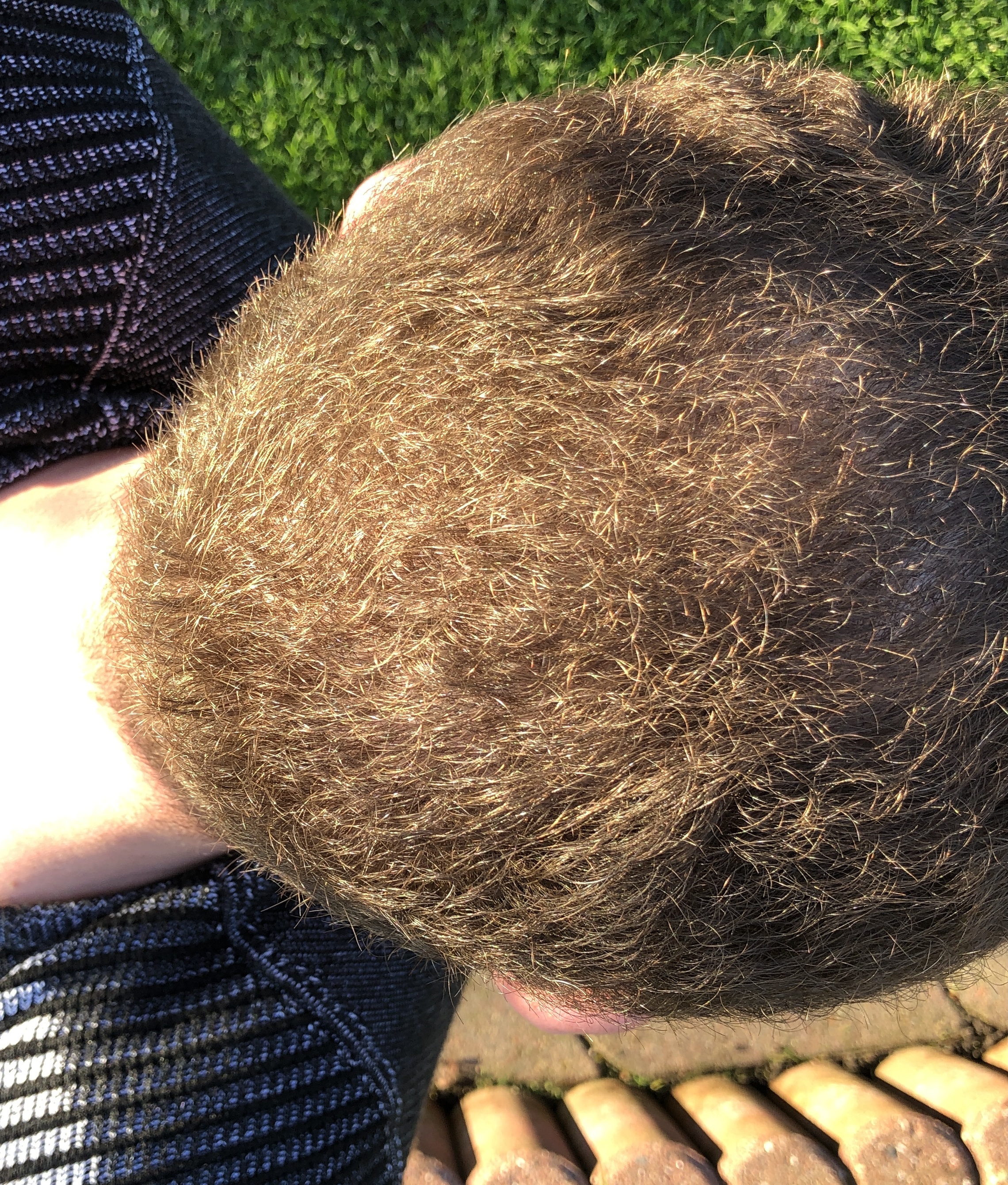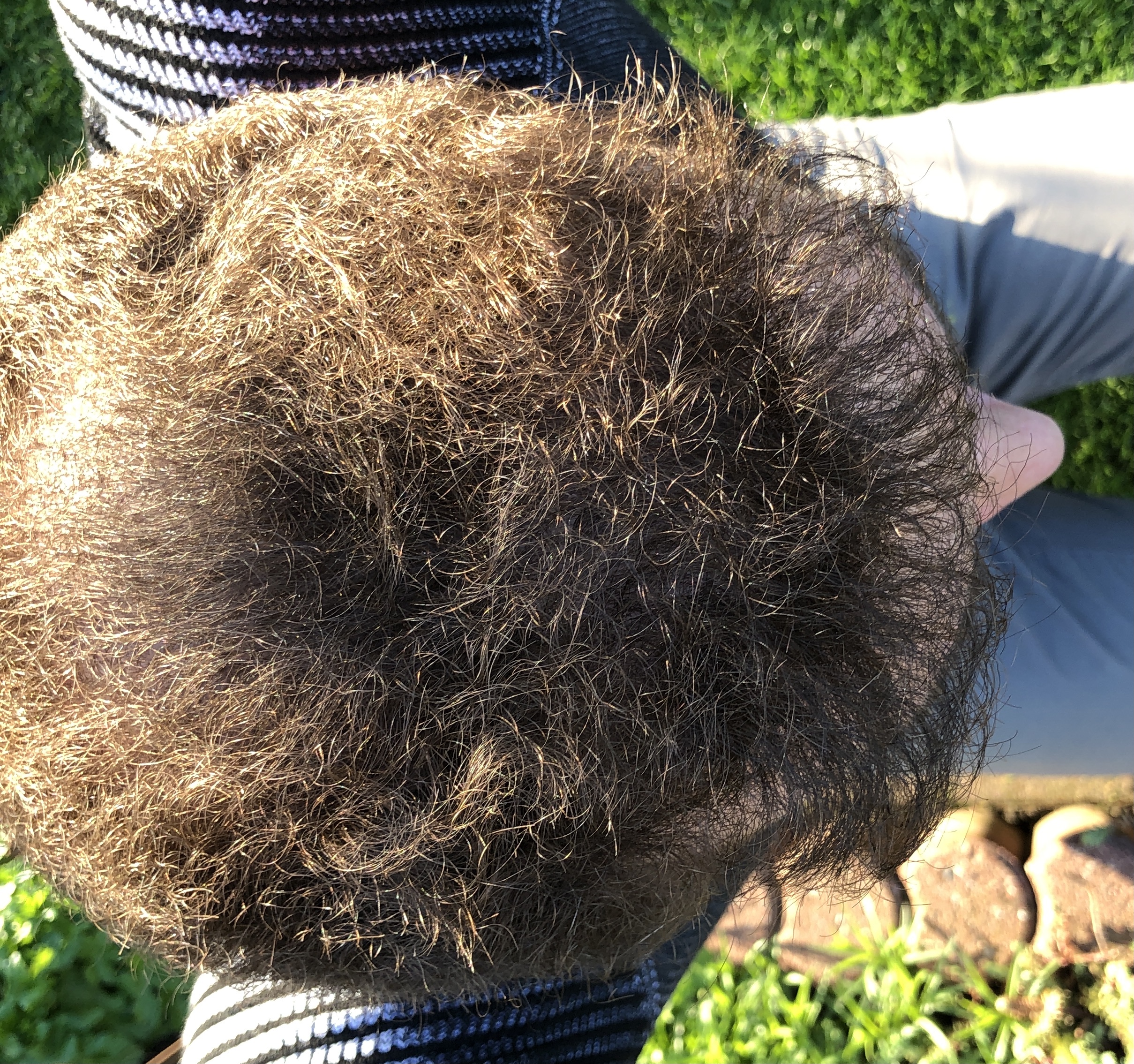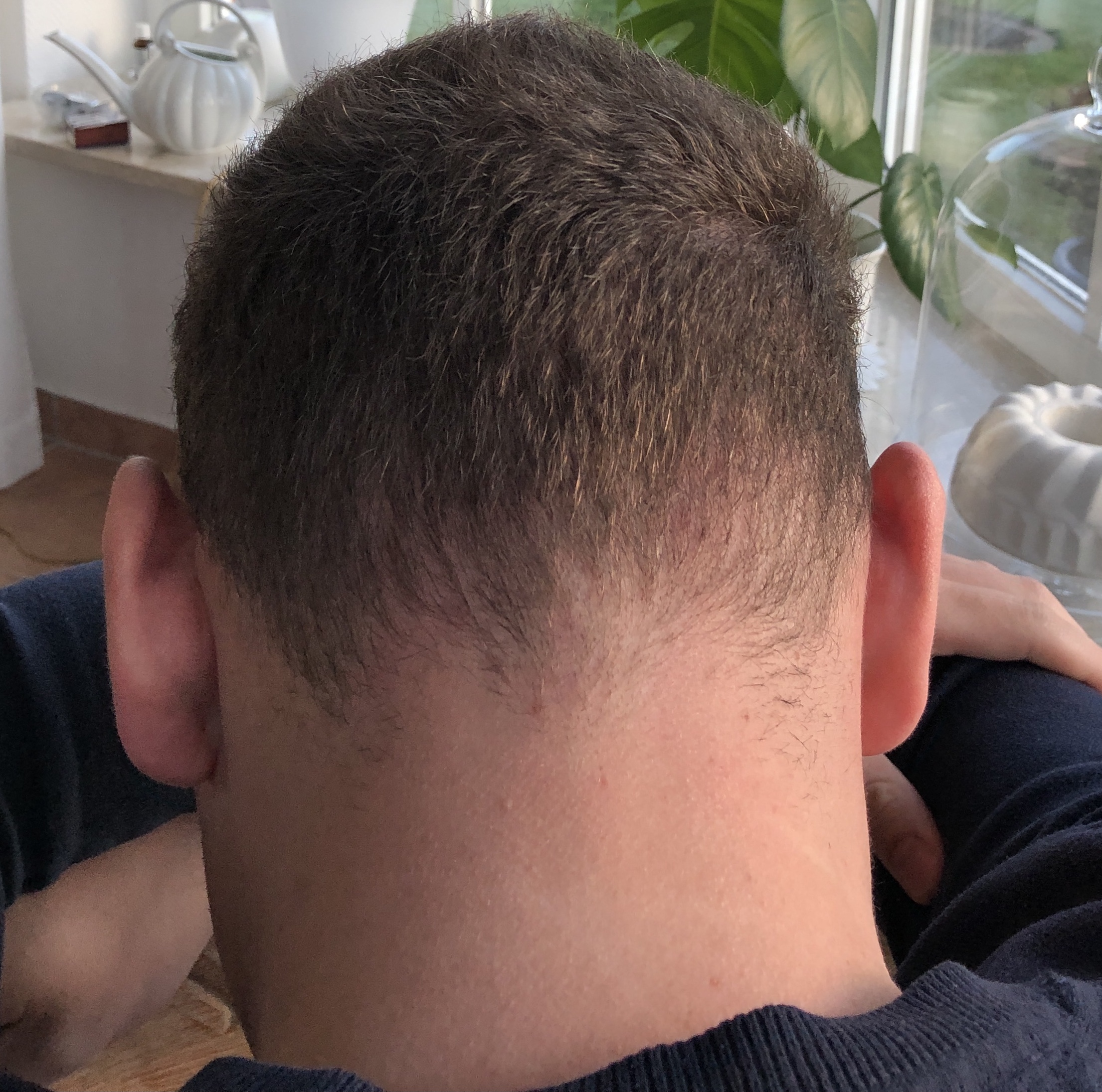 Auf dem Foto von oben wirken die Geheimratsecken nicht ganz dicht, kann aber auch täuschen. Die Tonsur braucht erfahrungsgemäß länger als die Haarlinie, da kann also auch noch was kommen.