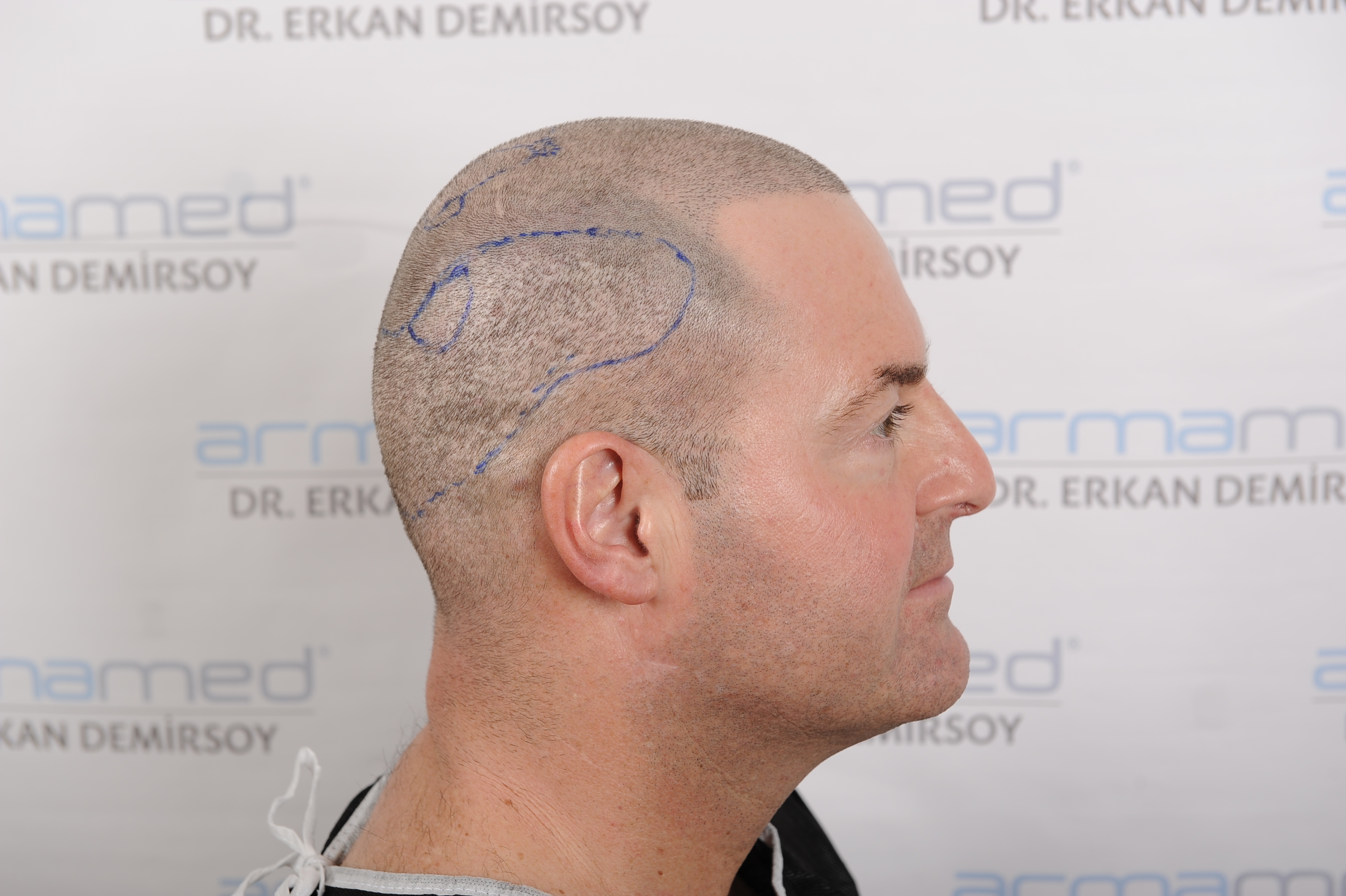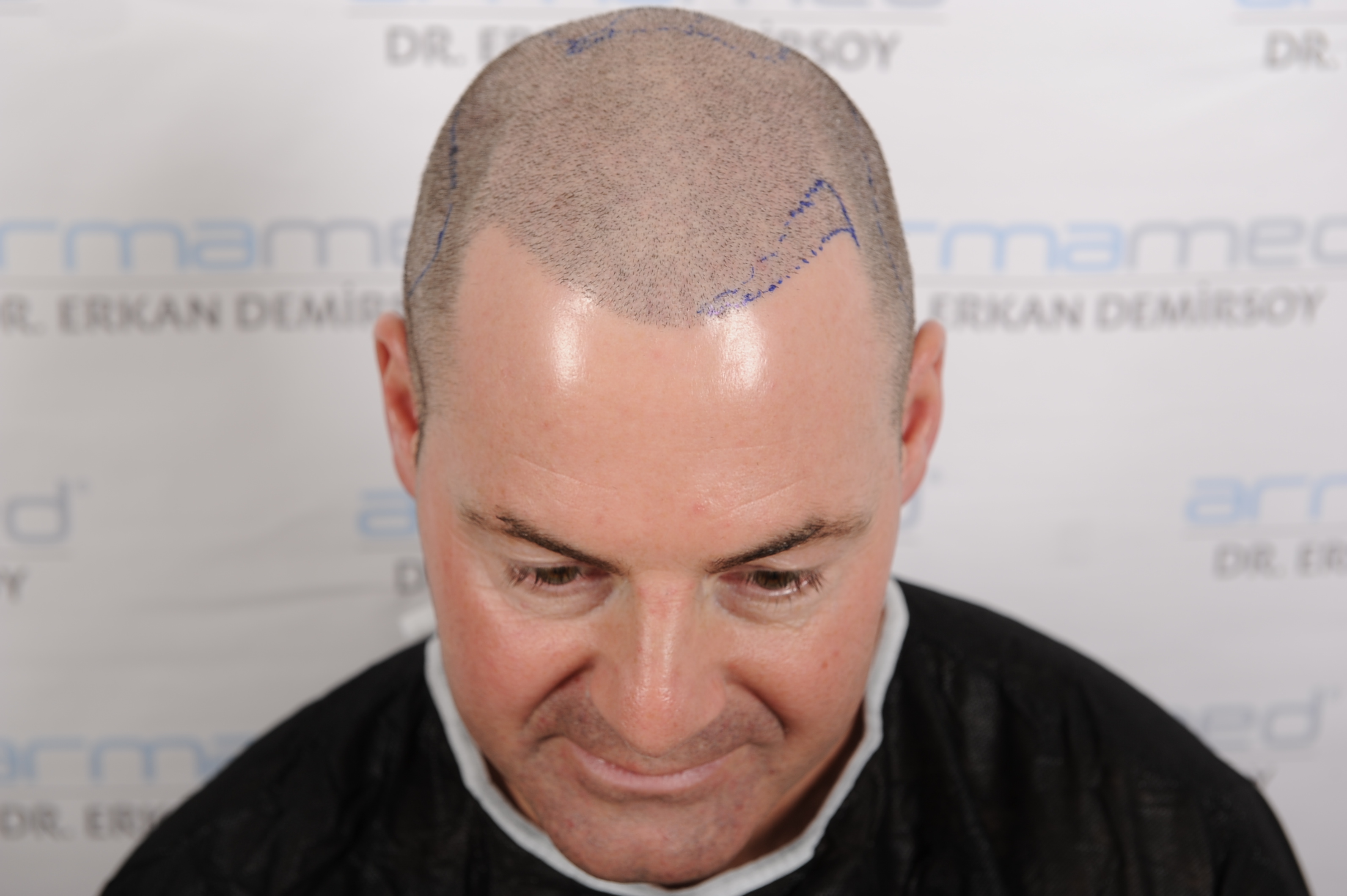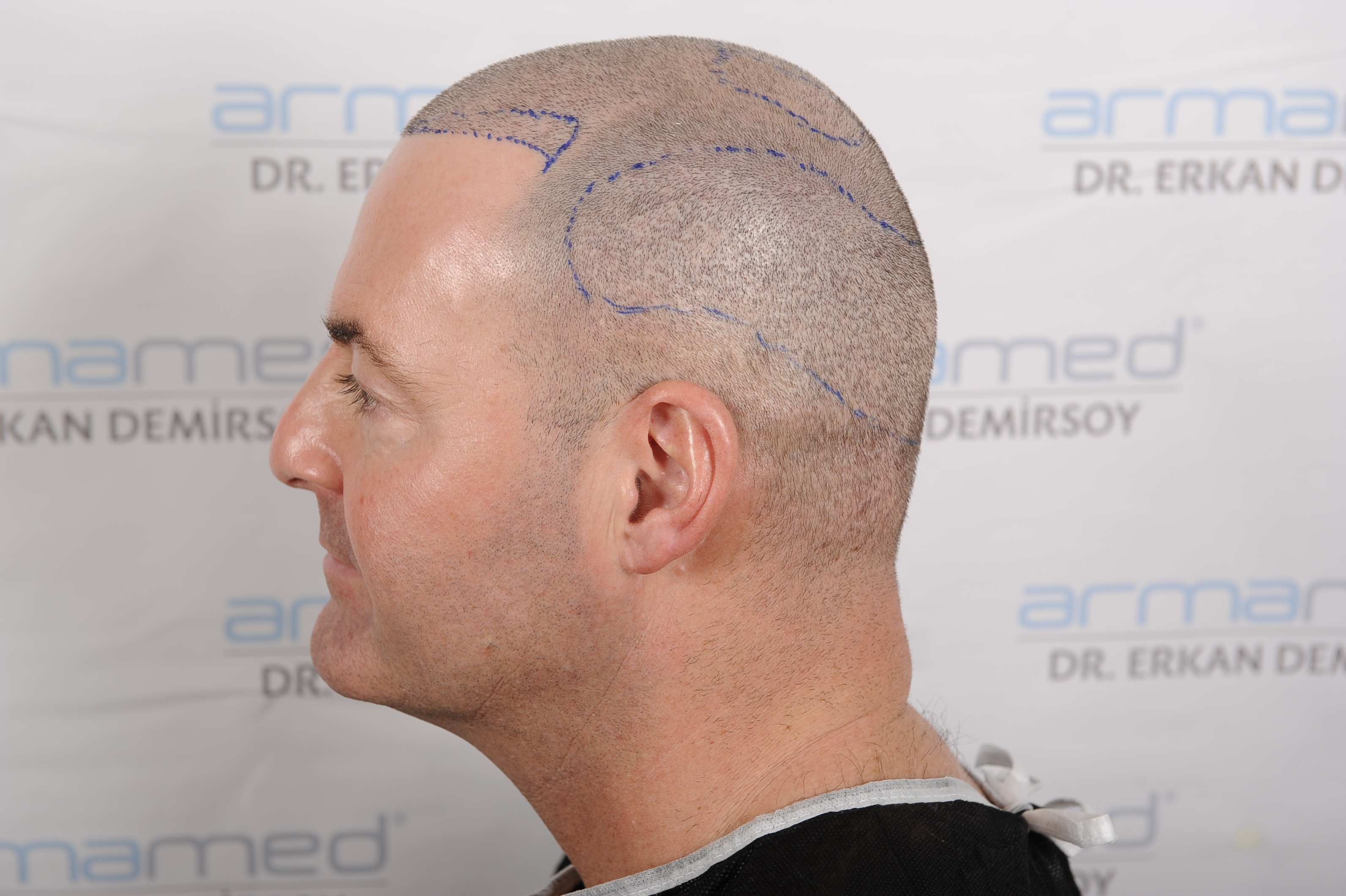 Folgender Patient hatte zum Zeitpunkt der Fotos 2 HTs (FUE) mit insgesamt 7200 Grafts hinter sich.