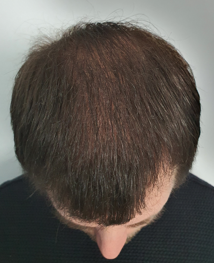 Ich bin 34 Jahre alt und habe braunes Haar. Meine Haare wurde vor 8-9 Jahren hinter dem Haaransatz immer dünner. Am Hinterkopf fing es vor 5 Jahren an, dafür rasanter. Geheimratsecken fingen irgendwann mit Anfang 20 an. Das hat mich aber nicht so sehr gestört, ist halt ein natürlicher Prozess. Schlimmer war der Haaransatz der einer verloren Insel glich.