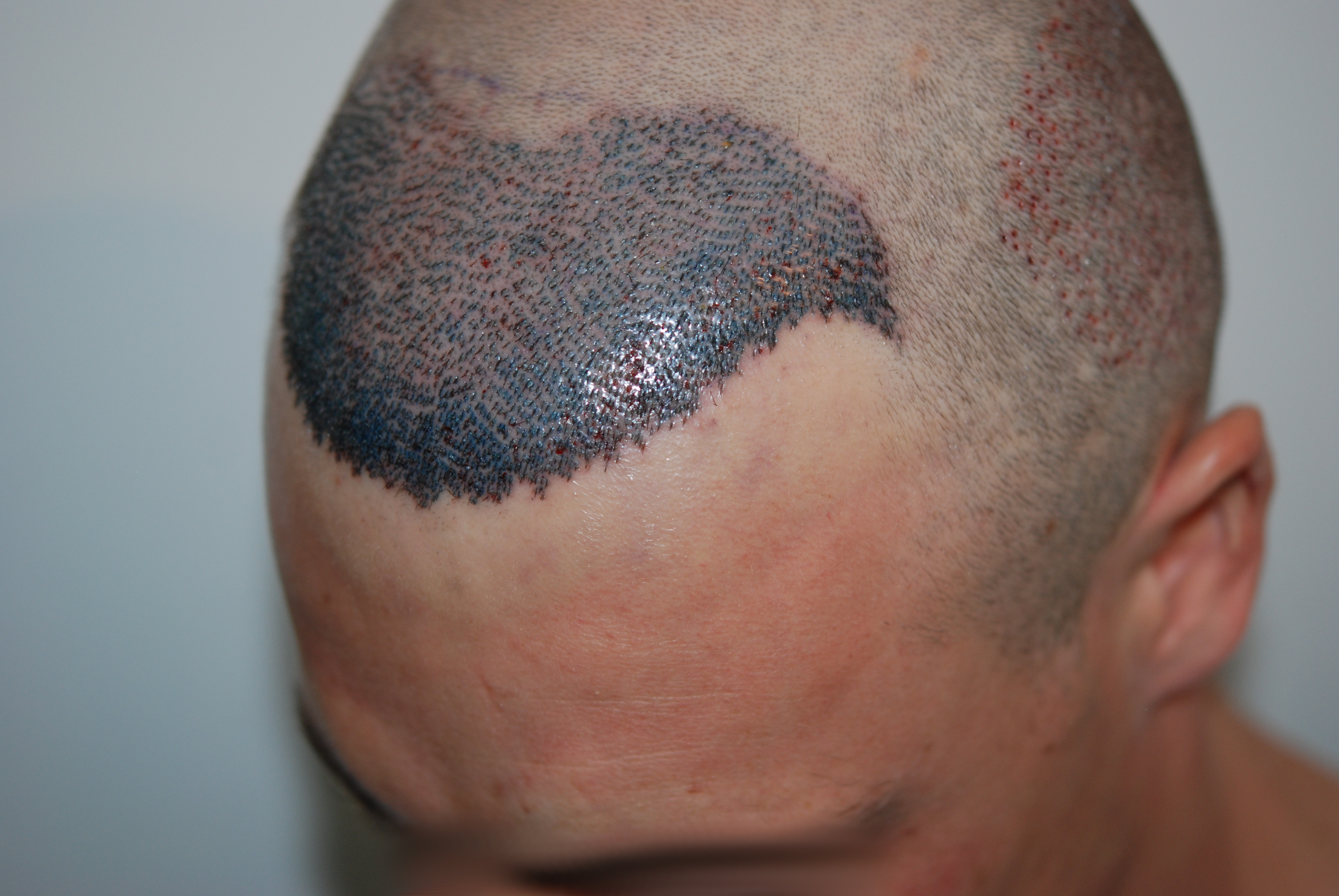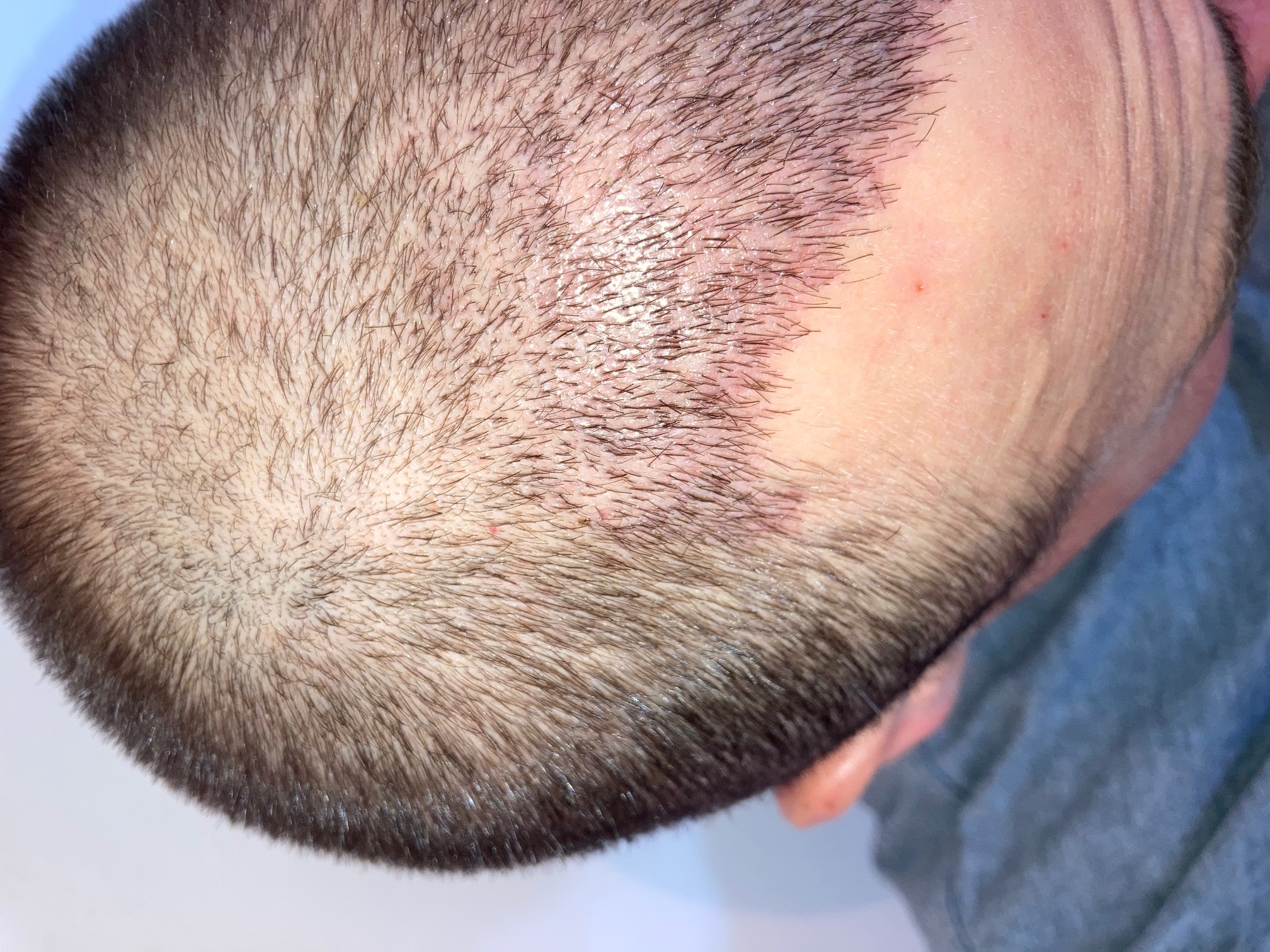 zwei Wochen sind um! Ein bisschen lichtet es sich schon auf dem Kopf. Der Heilungsprozess schreitet gut voran, würde ich sagen. Habe eine Hautirritation auf der rechten Kopfseite, vermute, dass es eher kratz-entzündete Rasierstellen sind als Entnahmestellen - lindere Juckreiz mit Aloe Vera Gel und beobachte mal.