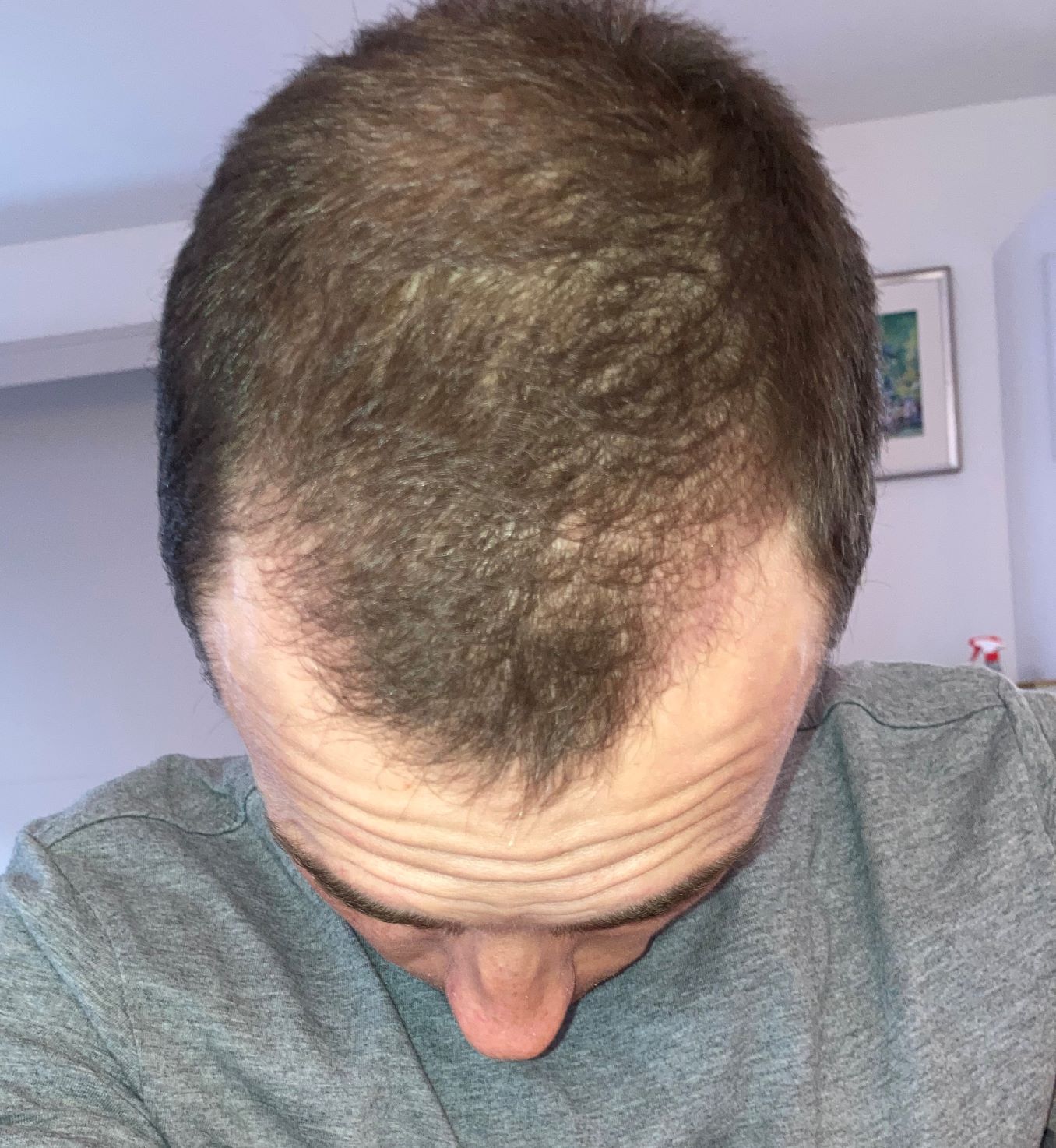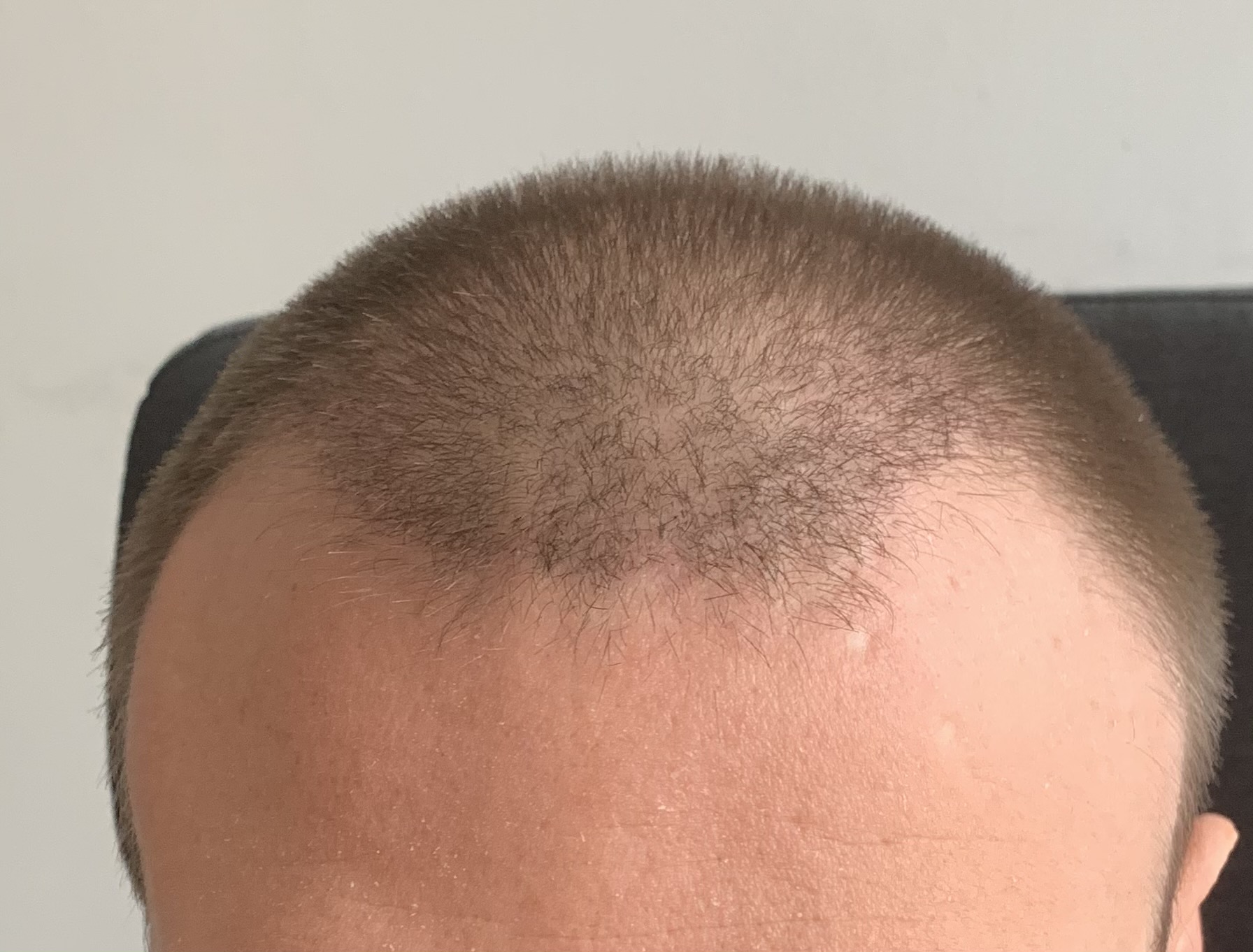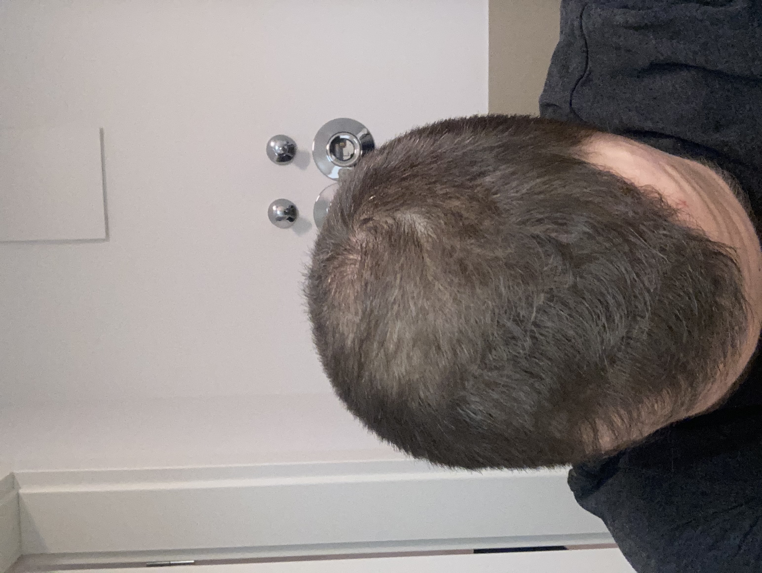 Mir Schneise meine ich, dass mein Oberkopf bei so kurzen Haaren etwas licht wirkt. Es zeichnet sich eben schon eine gewisse Ausdünnung ab, die durch den Kontrast zu den Seiten - vor allem bei schlechtem Licht - noch verstärkt wird. Wollte dem Donor aber noch ein bisschen Ruhe gönnen, bevor ich nachstutzen lasse.