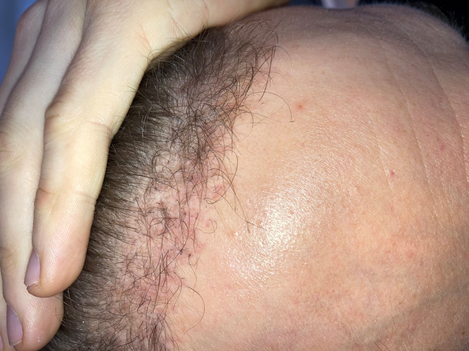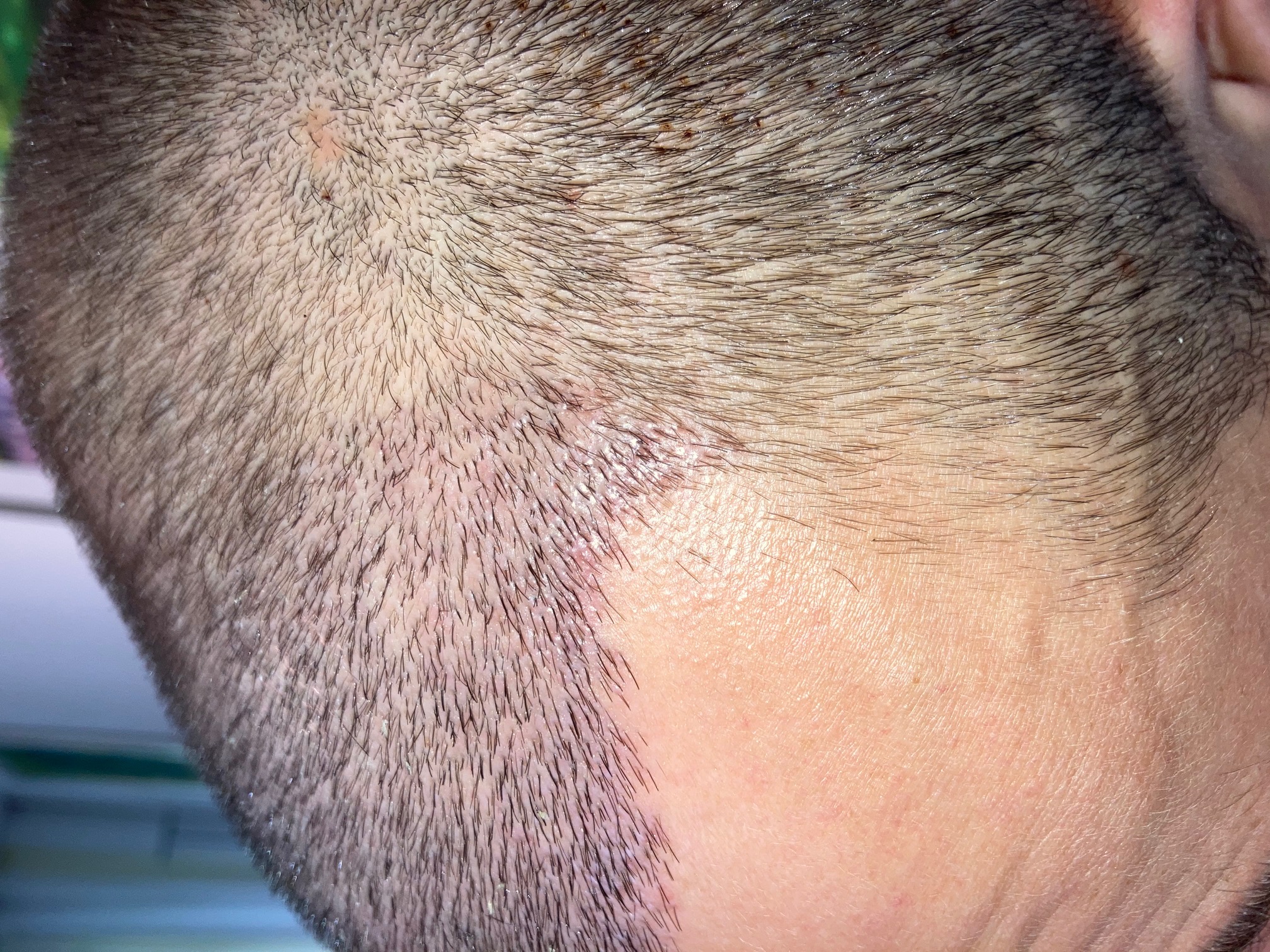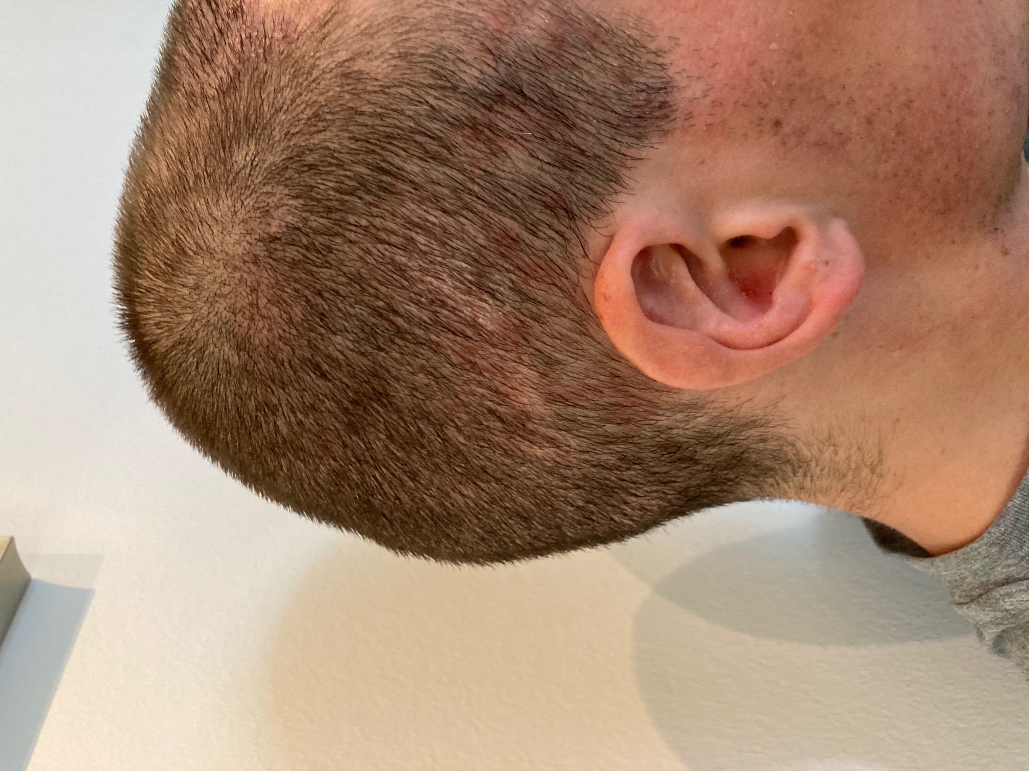 Mir Schneise meine ich, dass mein Oberkopf bei so kurzen Haaren etwas licht wirkt. Es zeichnet sich eben schon eine gewisse Ausdünnung ab, die durch den Kontrast zu den Seiten - vor allem bei schlechtem Licht - noch verstärkt wird. Wollte dem Donor aber noch ein bisschen Ruhe gönnen, bevor ich nachstutzen lasse.