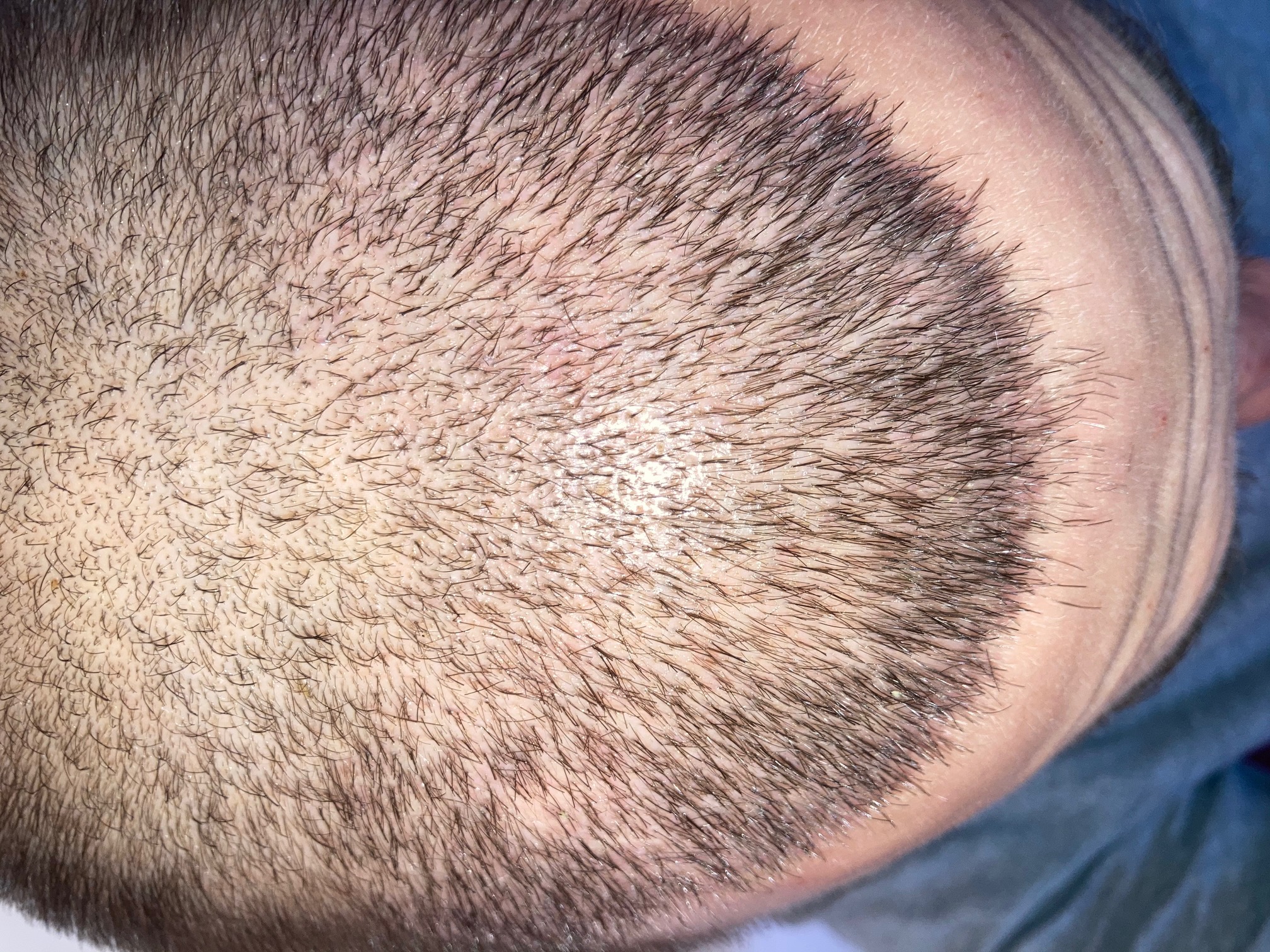 Sieht bei mir genau so aus, bin bei Tag 60. Die einzelnen Follikel, die dort stehen geblieben sind befinden sich ih der Telogenphase: "these FU’s found themselves in the telogen phase after transplantation. But these will indeed continue to shed. If they bother you, try rubbing with a bit more pressure during your next hair wash to get rid of them." -Feriduni info.