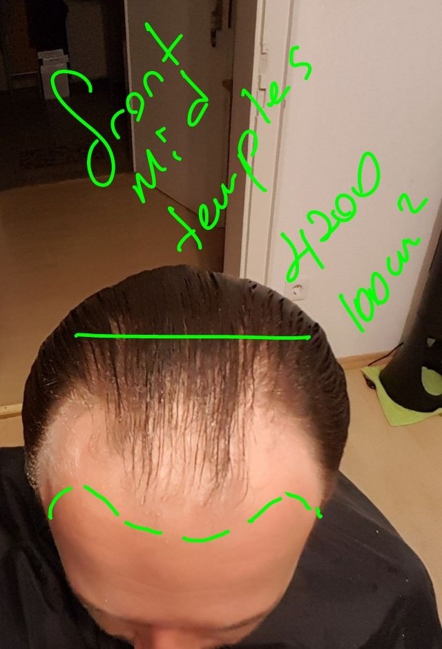 Step 1 war dann die Auswertung meiner gesandten Fotos durch Dr. Koray und ein entsprechendes Angebot. Ich hab' meinen Friseur missbraucht, um Bilder machen zu lassen. Auch wenn er von mir die nächsten Monate keinen Auftrag erhält Wink Das Foto, dass zum einzeichnen durch Dr. Koray genutzt wurde war ein ganz tolles... Ich hatte mir die Haare glätten lassen und war selbst erstaunt, wie wenig Haare ich eigentlich hab... Die eingezeichnete Linie sollte nur der Transplantationsbereich sein, die Haarlinie dann später im persönlichen Gespräch erstellt werden.