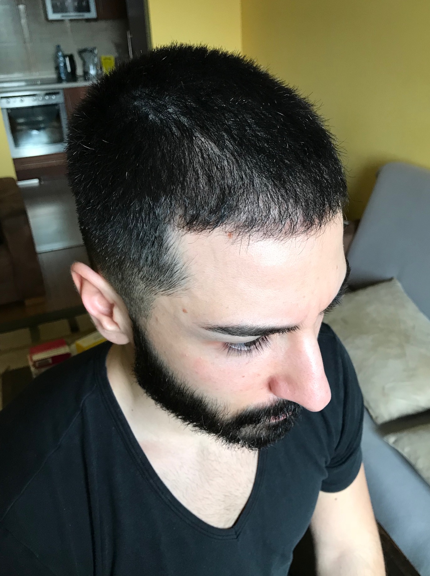 ja, da ist noch ein bisschen Nachwuchs zu erkennen. Wenn ich am Spiegel ganz nah ran gehe und mit dem iPhone Licht draufleuchte, kann ich an ein paar Stellen noch Haare erkennen, die gerade erst am wachsen sind. Zudem waren der Großteil der transplantierten Haare Multigrafts. Einige Grafts zeigen schon multis, aber einige sind erst als einzelne Haare zu erkennen. Hier hoffe ich, dass die "restlichen" Haare noch nachkommen.