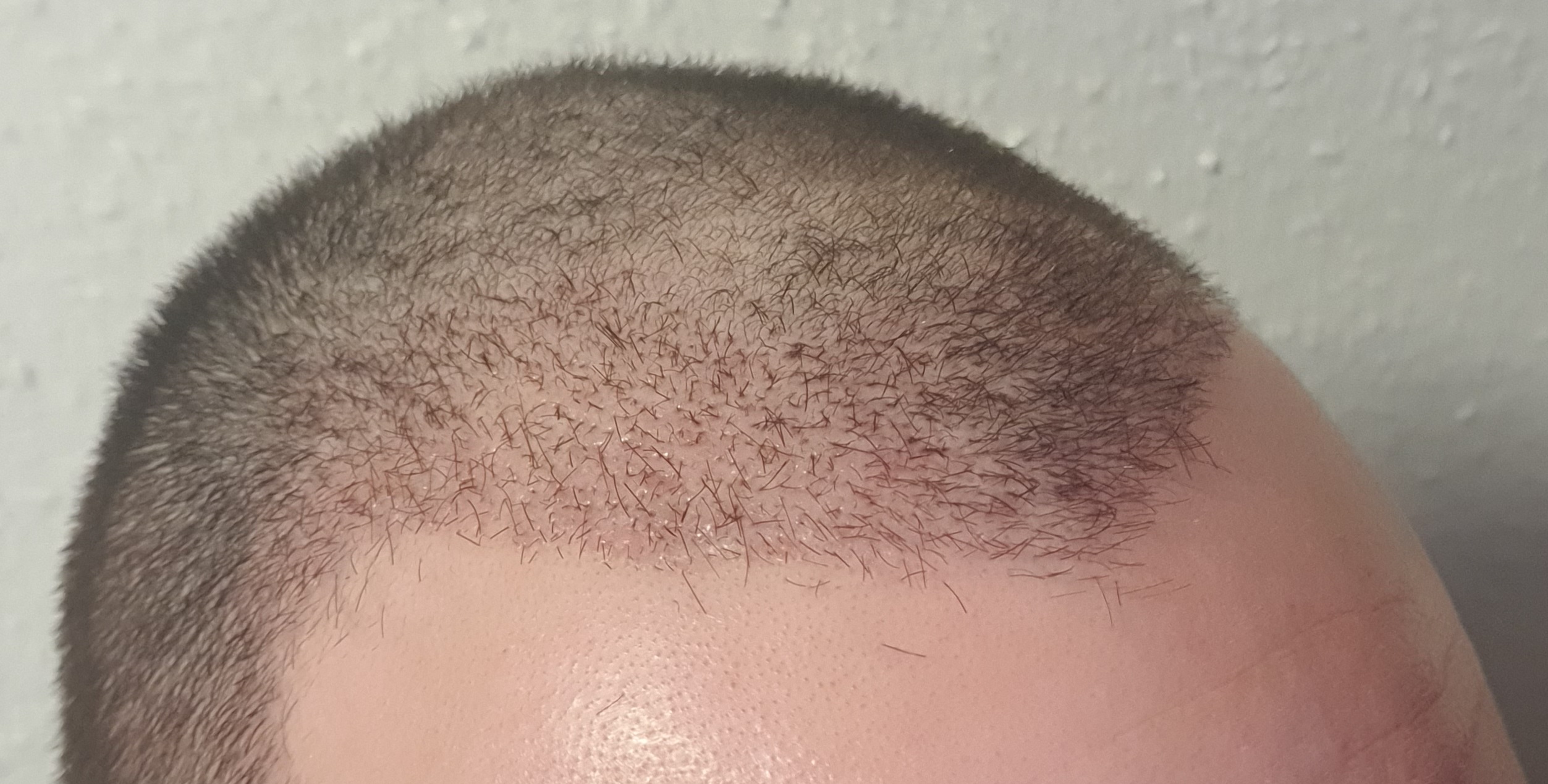Man erkennt immer noch einen unterschied zwischen dem transplantieren Bereich und meinem Echthaar, dass lässt sich aber kaschieren. Gefühlt würde ich sagen, dass es 70% weniger Haare sind. Ich hoffe jetzt, dass da in den nächsten Monat noch ein bisschen mehr kommt.