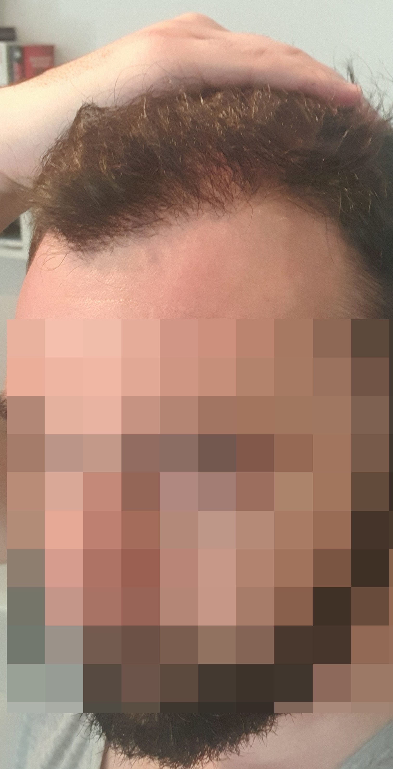 Alle eingesetzten Haare sind mittlerweile ausgefallen und zurück geblieben sind nur noch vereinzelte Haare. Die Haut ist noch ganz leicht gerötet, aber es ist kaum ein Unterschied zu erkennen. Ab und zu ist die Haut noch leicht Sensibel, aber alles ohne Schmerzen oder Juckreiz.
