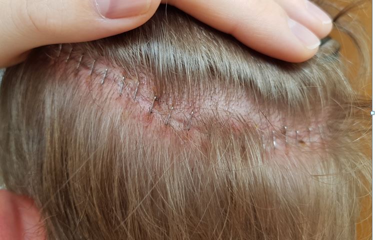 Die Narbe und der Shockloss haben noch einen guten Verlauf genommen. Die markantesten Stellen der Narbe betragen 3 mm aber lassen sich soweit gut verstecken. Auch die Haare sind um die Narbe herum nachgewachsen und das ist erfreulich.