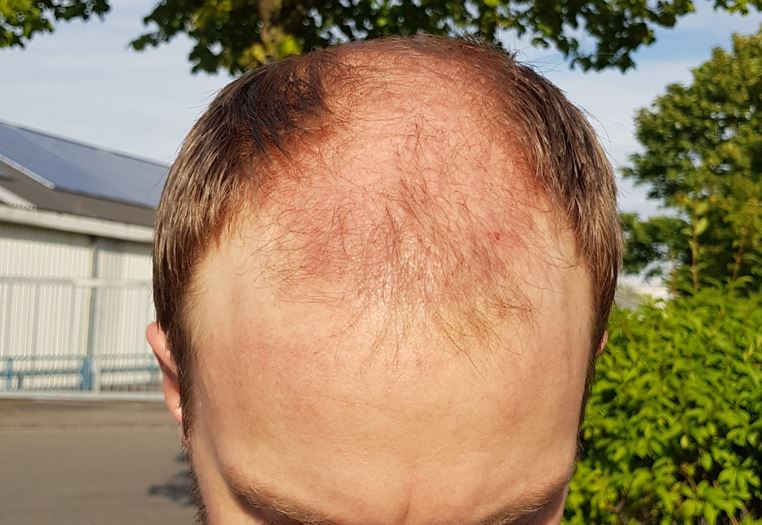 Empfangsbereich: Hier ist bisher nicht viel passiert. Die Haut ist allerdings immer noch rot. Ich trage daher immer eine Baseballcap um die Zone vor der Sonne zu schützen. Mit der aktuellen Gesamterscheinung durch Rötung, Pickel und dem wenigen Resthaar, trage ich die Cap eigentlich immer wenn ich draußen oder auf der Arbeit bin. Ich vermute, dass etwa 10-20 % der Implantate mit dem nativen Haar durchgehend gewachsen sind. Auf der Kopfhaut ist an manchen Stellen immer noch so ein gelbes hartnäckiges Zeug. Das habe ich auch schon direkt nach der OP gehabt und Herr Muresanu meinte es wäre so etwas wie Plasma. Damals hat man es mir während der Haarwäsche in Schaffhausen entfernt. Allerdings geht es eher durch Abkratzen weg, als wie durch die einfache Wäsche mit der Hand.