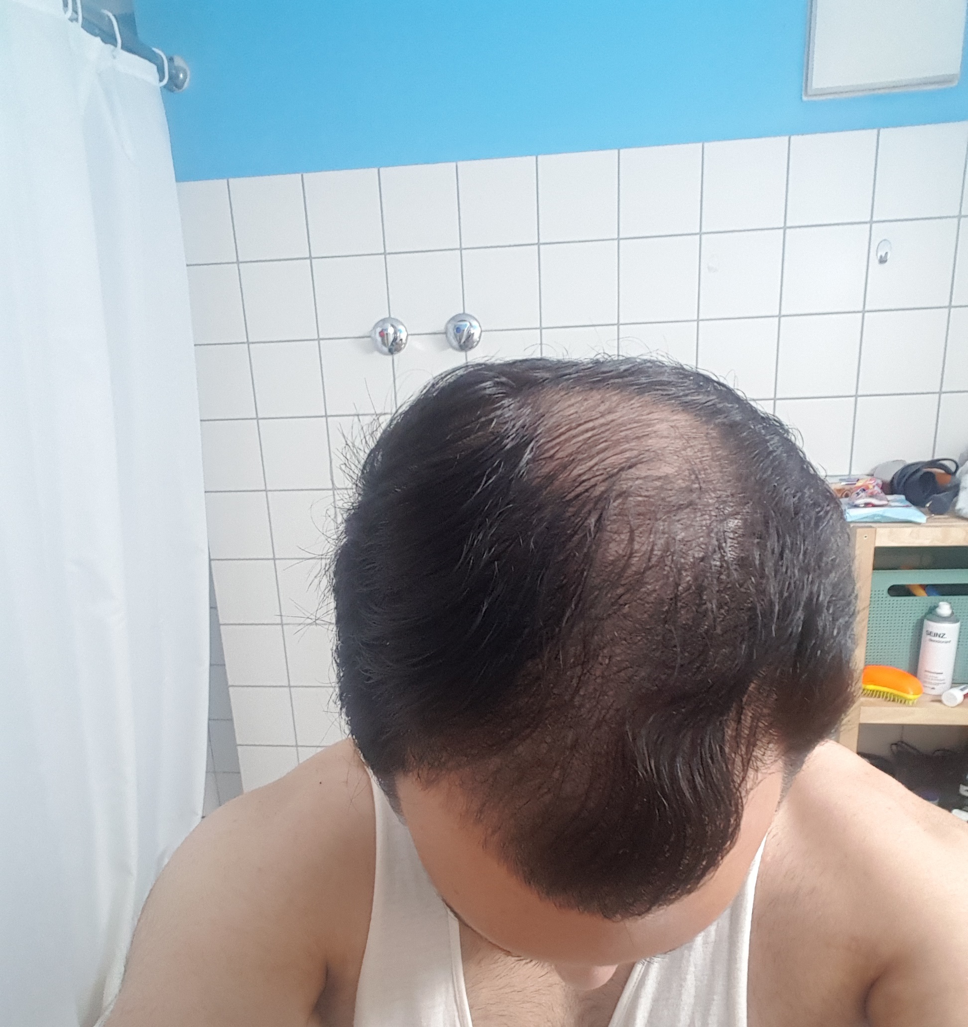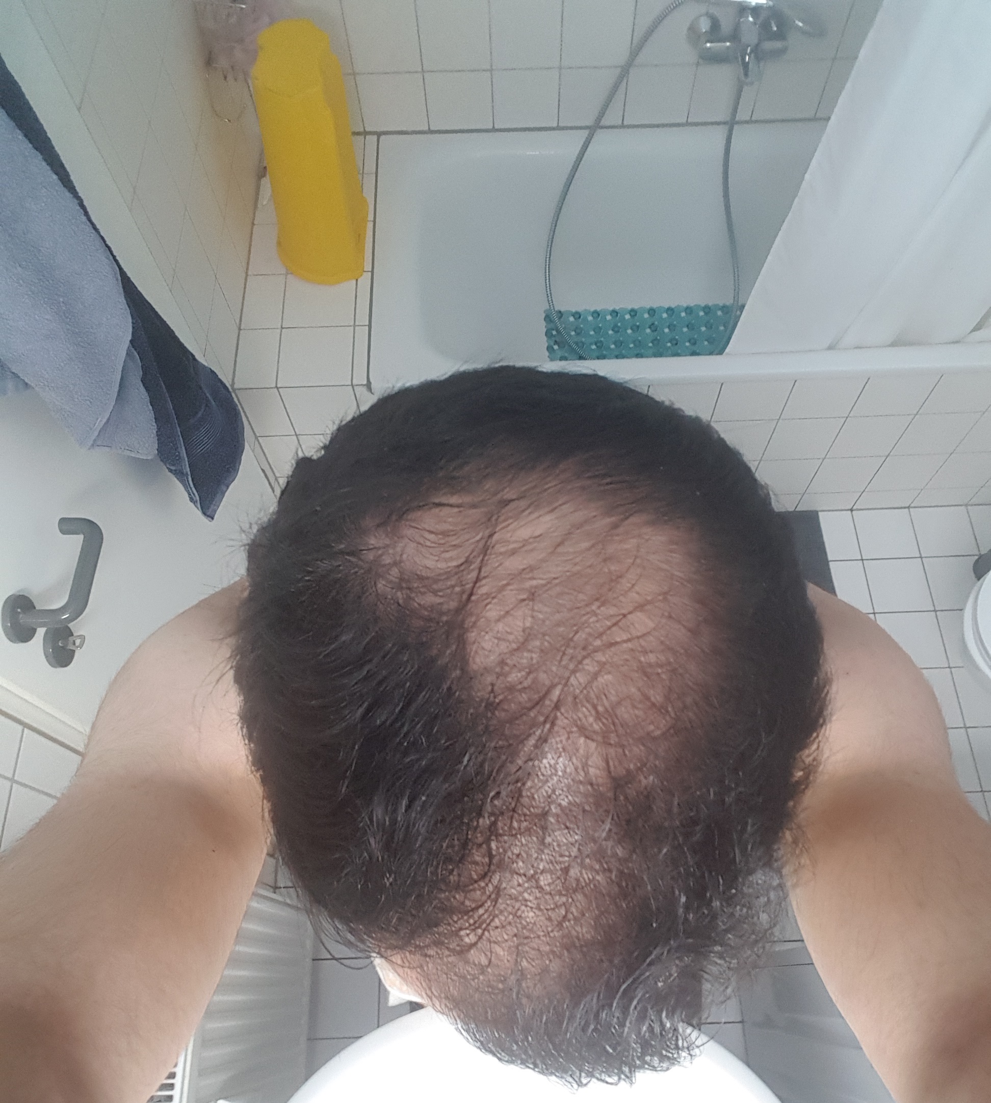 * Haarstatus in der Familie (Eltern/Großeltern): Vater hat mit fast 60 Geheimratsecken und leichten Haarausfall im Tonsurbereich. Problematischer Haarstatus eher mütterlicherseits: Mein Onkel hatte in meinem Alter den selben Haarstatus, wenn nicht sogar fortgeschrittener.