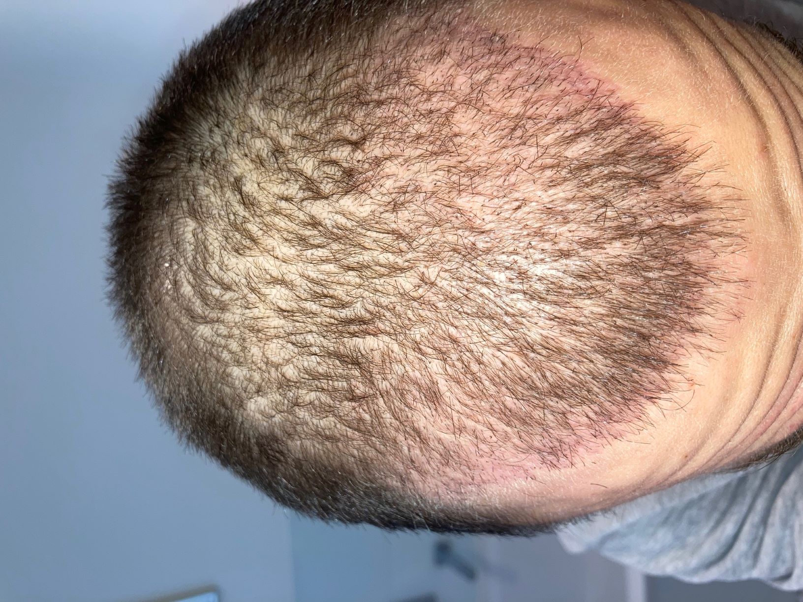 zwei Wochen sind um! Ein bisschen lichtet es sich schon auf dem Kopf. Der Heilungsprozess schreitet gut voran, würde ich sagen. Habe eine Hautirritation auf der rechten Kopfseite, vermute, dass es eher kratz-entzündete Rasierstellen sind als Entnahmestellen - lindere Juckreiz mit Aloe Vera Gel und beobachte mal.