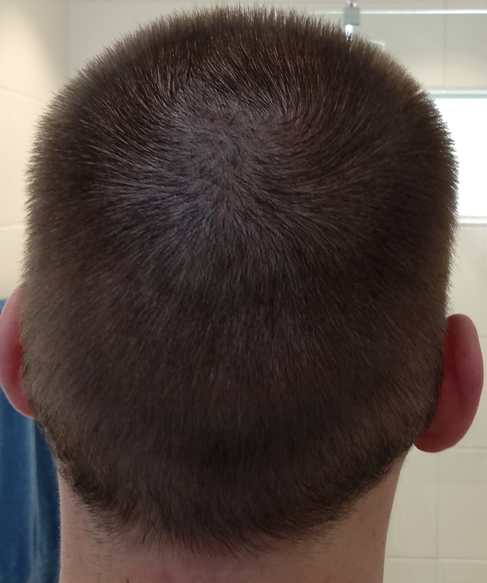 Meine Haare stehen im Moment noch in die Höhe, weil sie so kurz sind. Ich hoffe in den nächsten Wochen, dass sie sich niederlegen und somit die Kopfhaut verdecken. Ansonsten sieht man auf den Bildern, wie licht es ist. Generell würde ich sagen, dass ich von Shockloss verschont geblieben bin, allerdings sieht man bei dieser Länge, dass die Tonsur die nächste Baustelle werden wird.