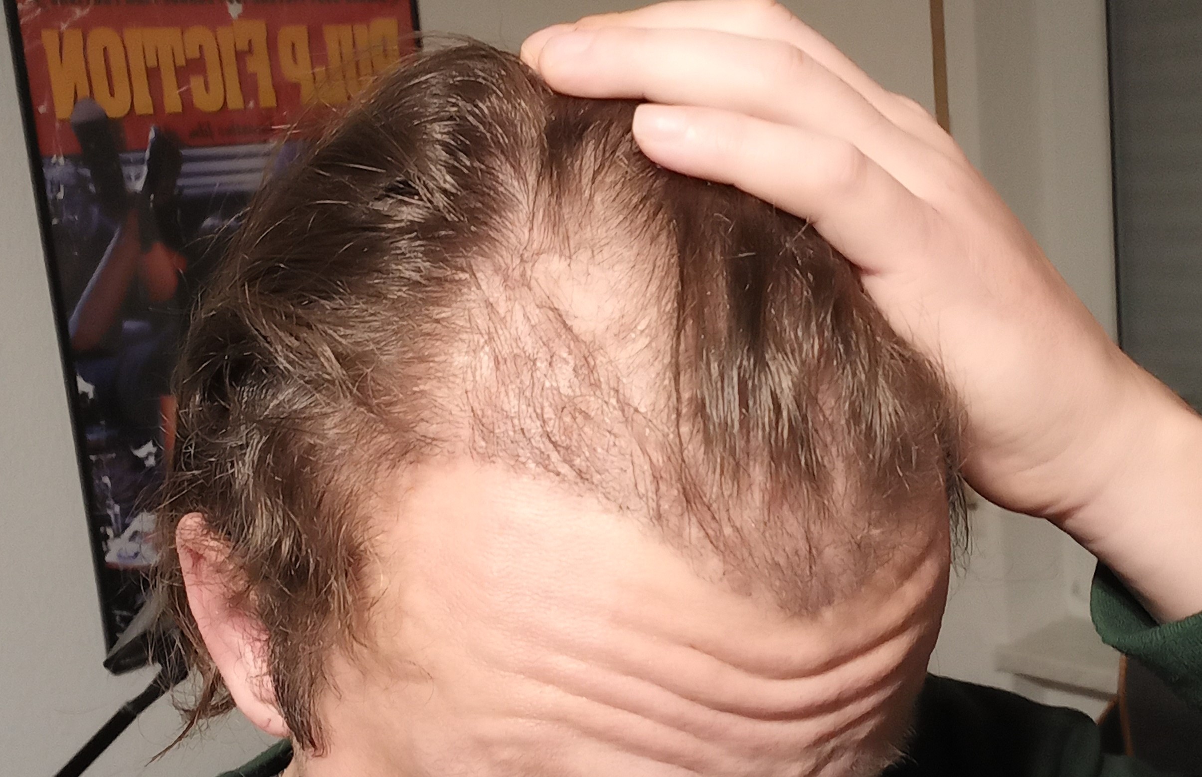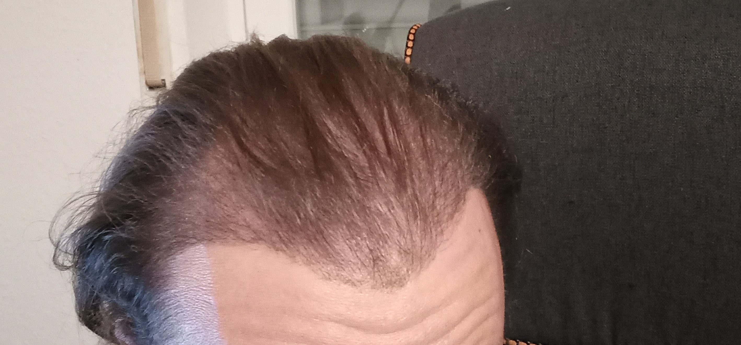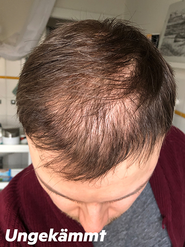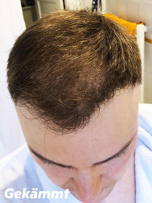 Wenn ich die Haare seitlich kämme, sieht es natürlich besser aus, da die vorhandenen Haare länger werden und die kahlen Stellen verdecken, aber wir sind natürlich noch weit davon entfernt, über ein zufriedenstellendes Ergebnis zu sprechen.