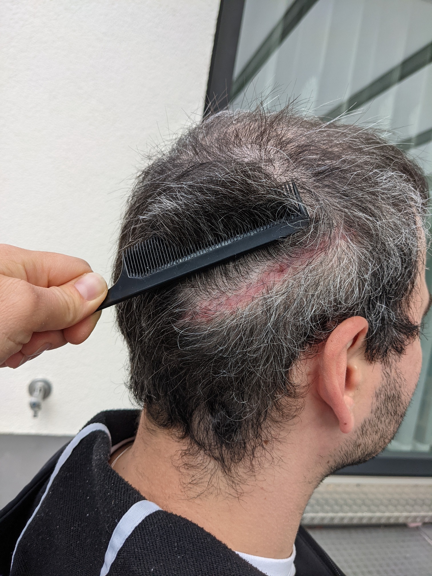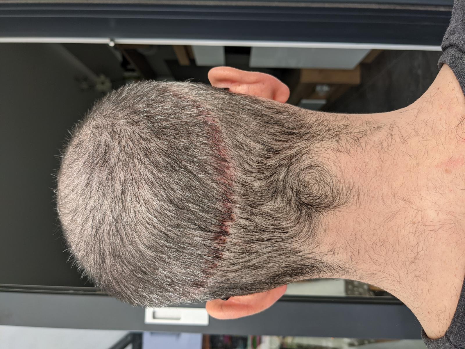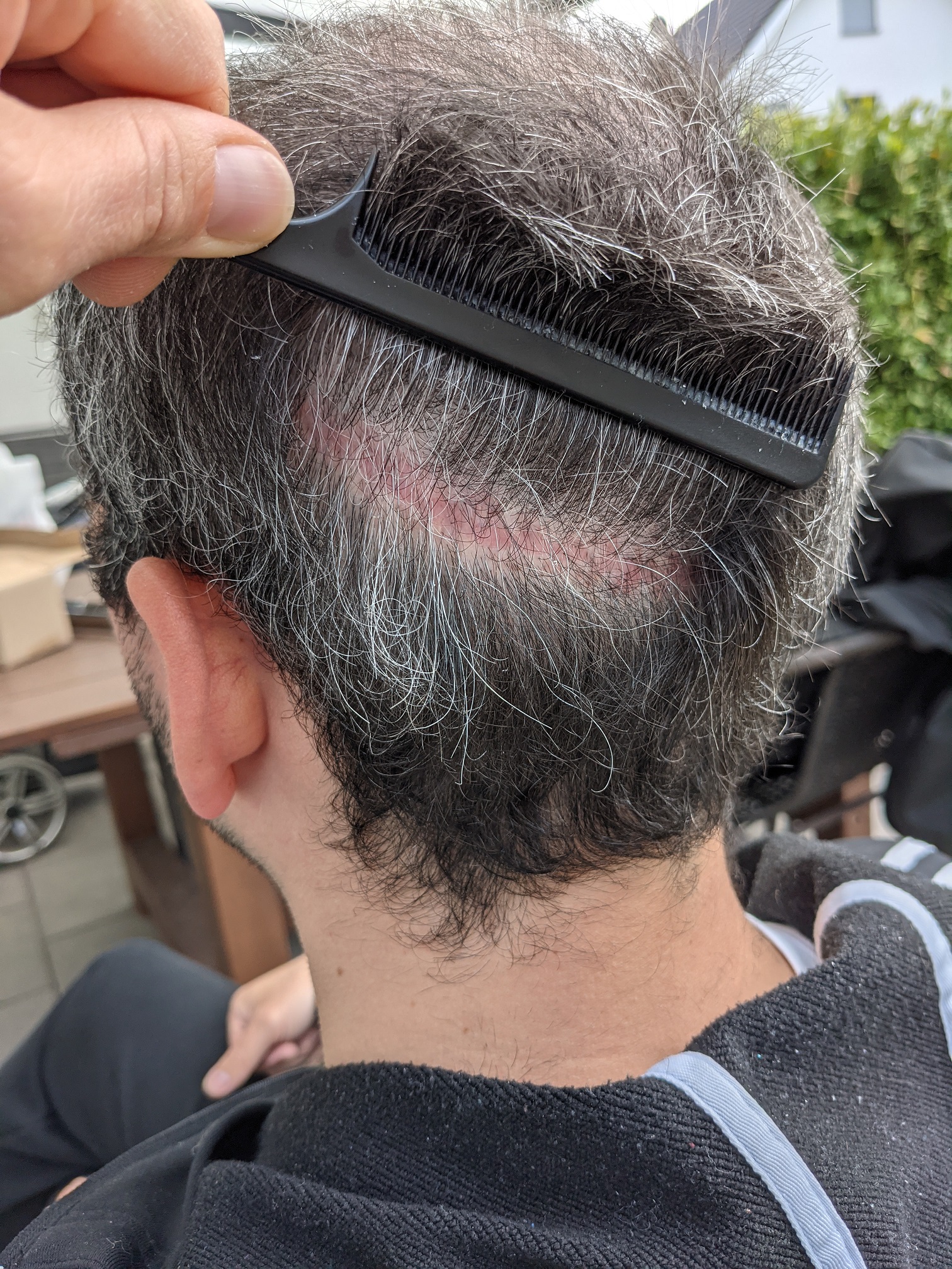 Wie ihr seht ist mein Donor Bereich sehr ausgedünnt. Deswegen hatte eine SMP im Donor Bereich machen lassen. Ich hatte gehofft durch SMP die Harre kurz tragen zu können (1-3mm) ohne das man die Narbe sieht. Leider ist die Narbe trotz SMP immer noch stark sichtbar.