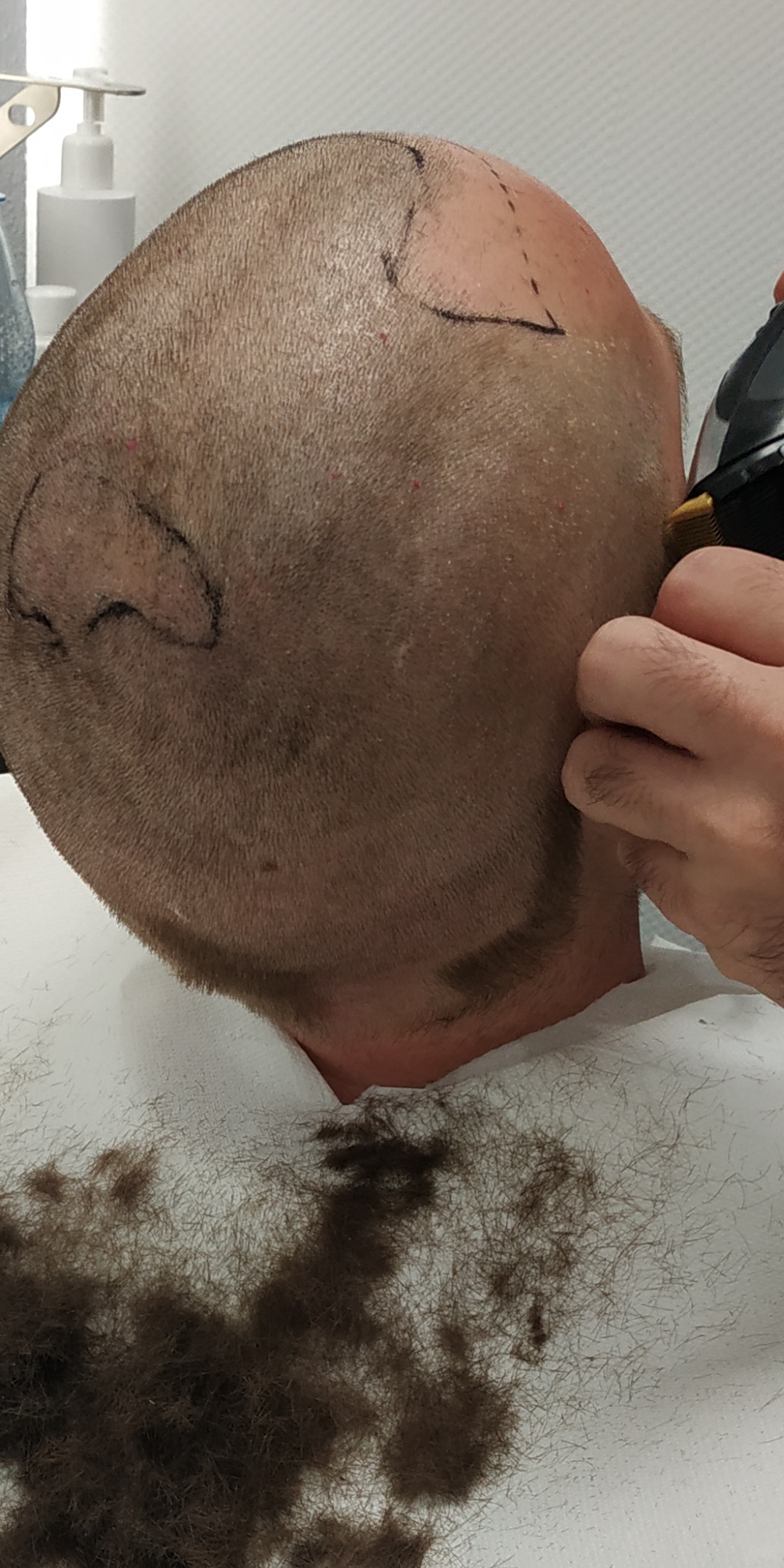 Dann wurde im mir im nächsten Schritt die Haare auf 2mm runterrasiert, die Linie eingezeichnet, in der die Grafts später eingesetzt werden und dann in den Behanlungsraum gebracht.