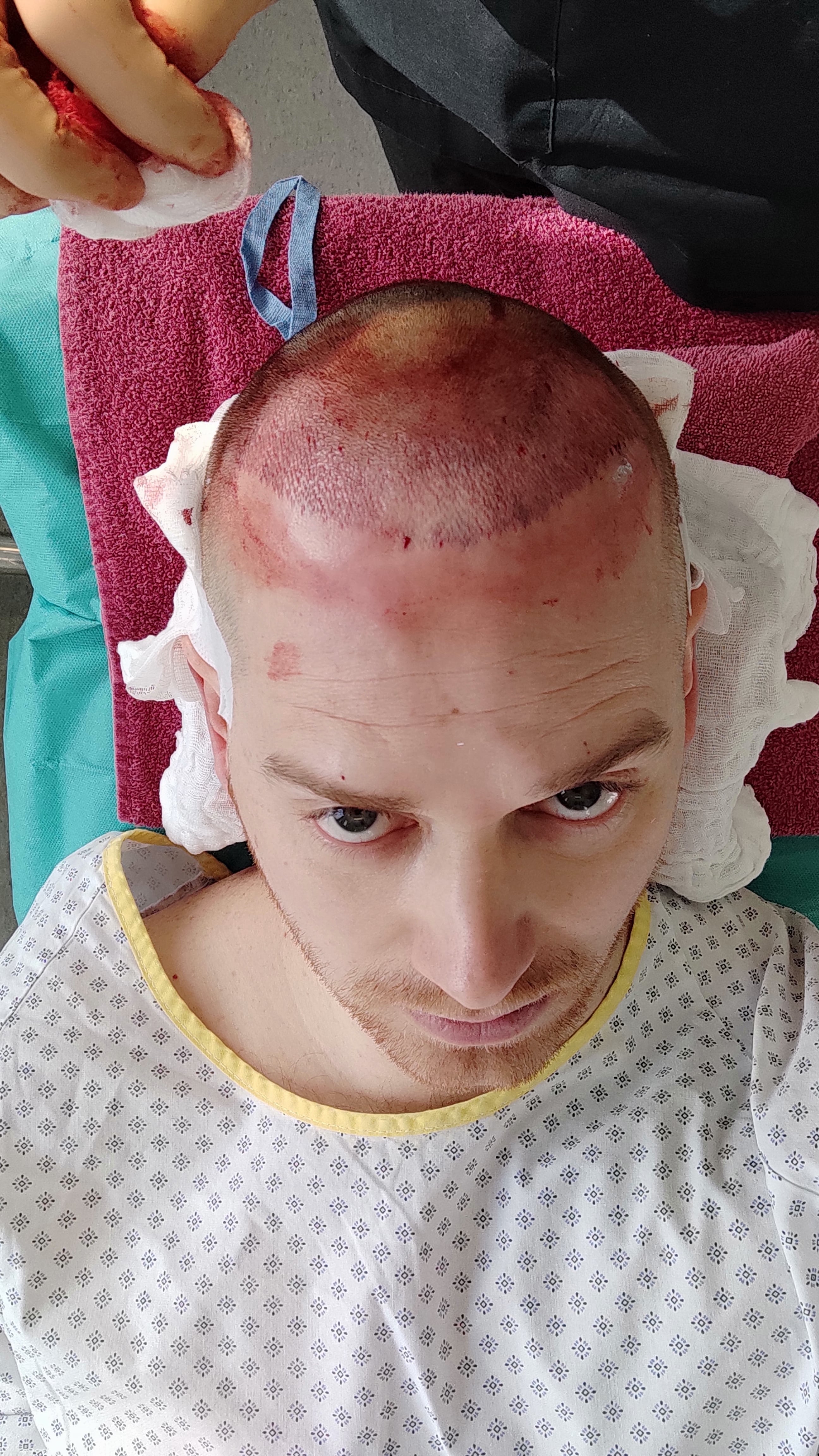 Anbei findet ihr ein paar Bilder von vorher, während der Behandlung als die Schlitze und Grafts gesetzt werden und von danach.