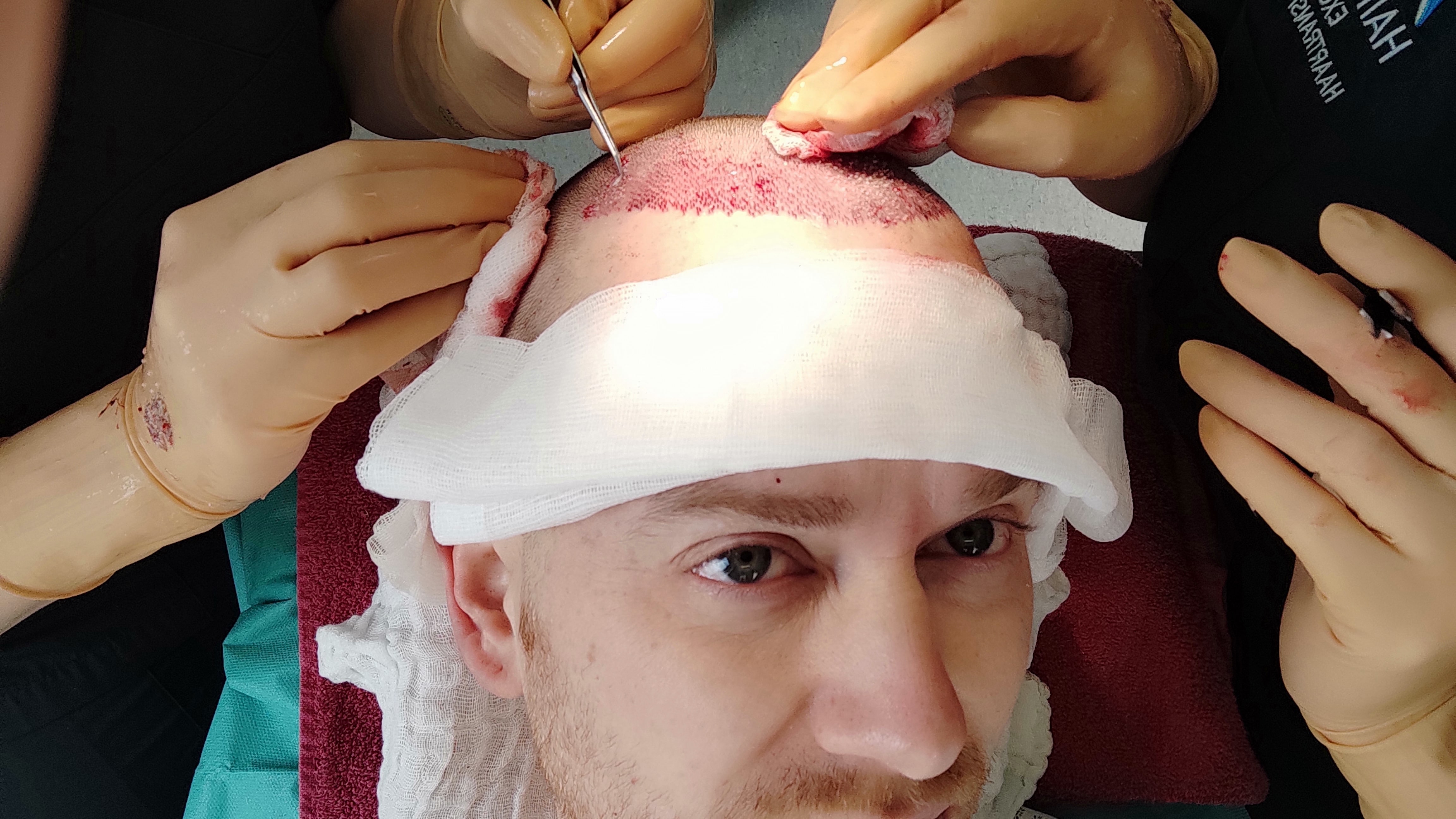 Danach kamen wieder die Mädels dran, die mir mit viel Geduld die Grafts in die Hautschlitze setzten.