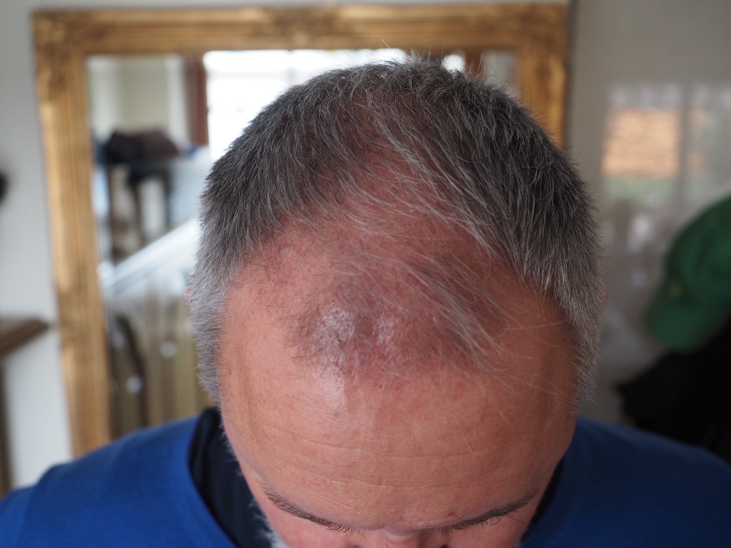 Zufrieden bin ich mittlerweile mit dem Umstand, dass mein Haar wieder eine Länge erreicht hat, dass es flach anliegt und die kahlen Stellen abzudecken beginnt, so wie es vorher war.