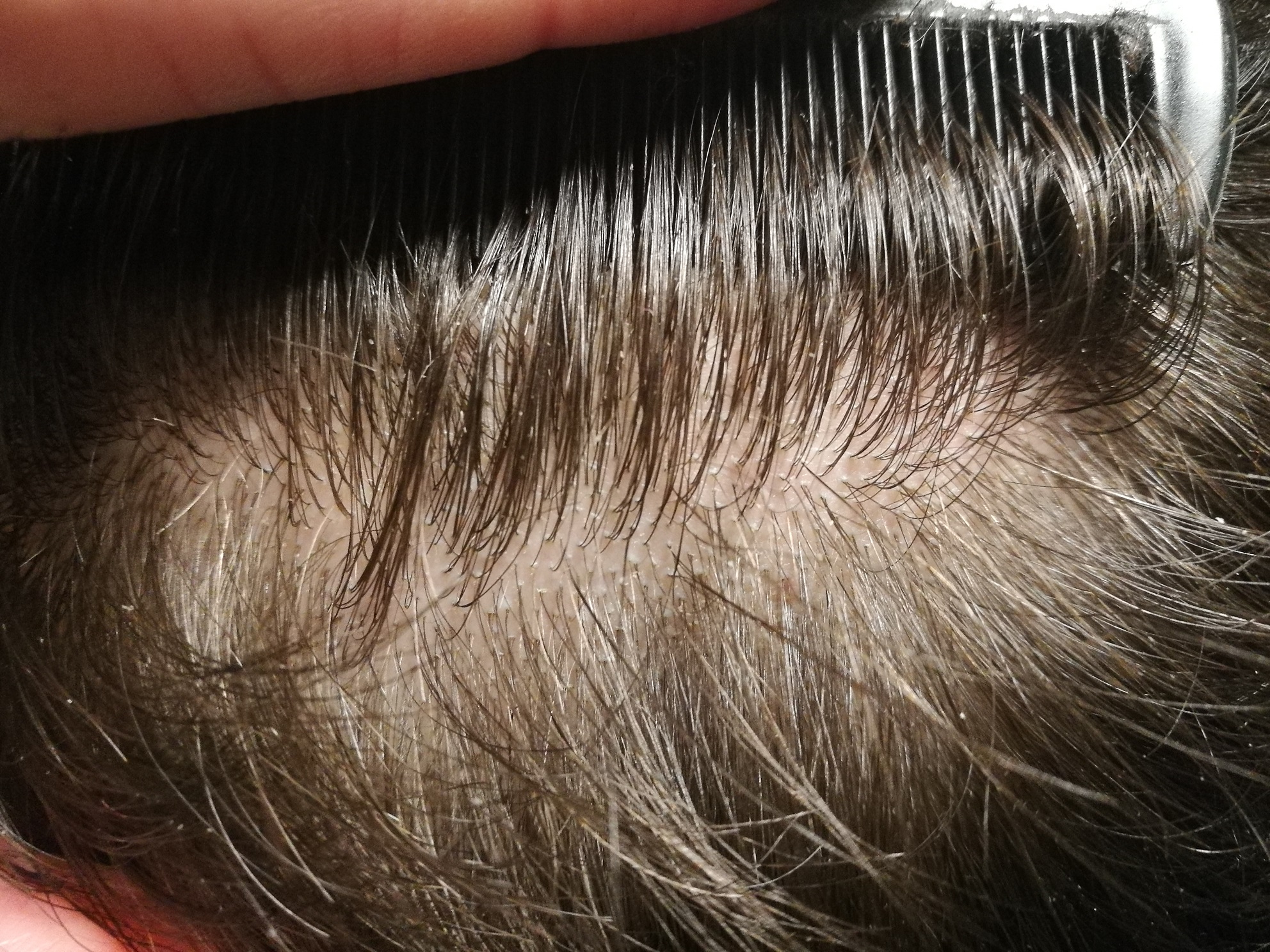 Nebenbei, rasier dir einfach mal die Haare ab, es juckt keinen Hund. Maschine kurz und dann mit Nass Rasur alles weg.