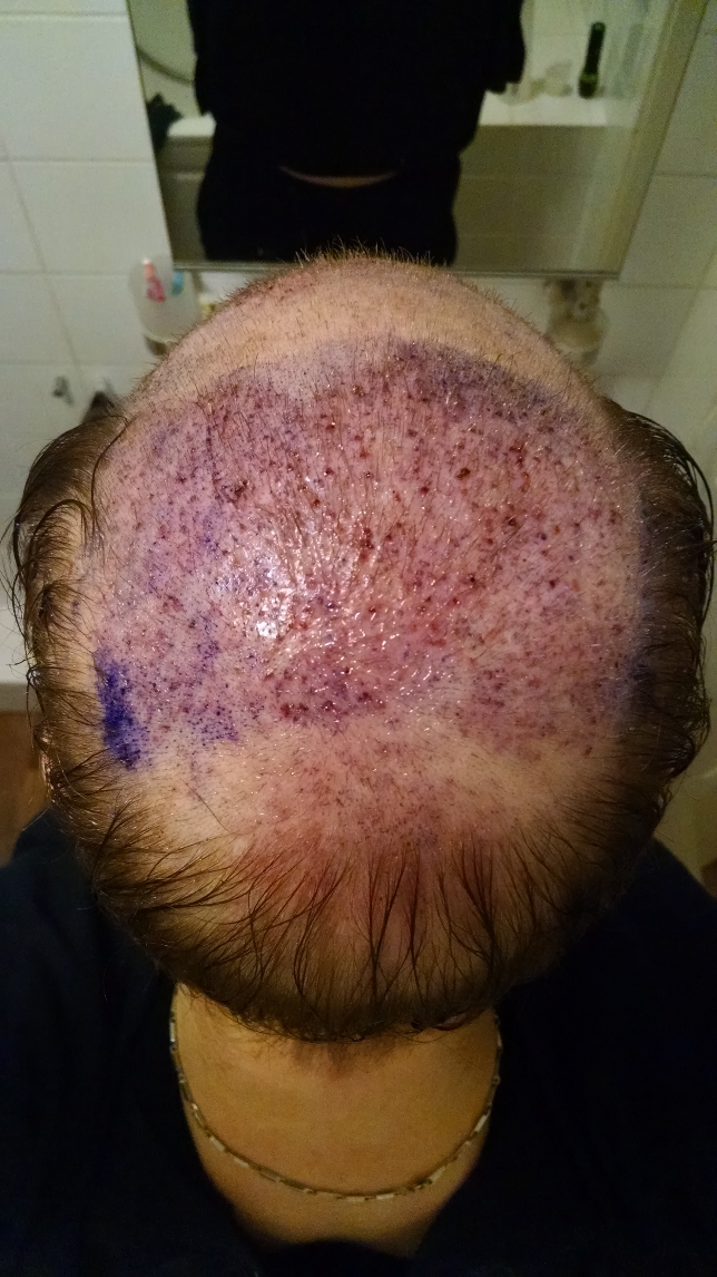 Deswegen sollte jeder genau überlegen. Man hört immer das FUT veraltete Technik ist. Aber das ist es überhaupt nicht. Man sollte schauen in welcher Norwood Skala man sich befindet. Und nach meiner Meinung ist ab Norwood 5 eine Kombination aus FUT und zum Schluss FUE die beste Strategie um am meisten Grafts aus seinem Spender rauszuholen. Der Fokus bei meiner zweiten OP lag bei der Tonsur (ca 1700 Grafts ) und dazu eine Verdichtung der Haarlinie ( 800 Grafts ) und die Schläfen ( jeweils 300 Grafts ) die leicht ausgedünnt waren wieder verdichtet wurden. Somit sind es jetzt in Summe mit zwei FUT OP´s bei Hattingen 8661 Grafts geworden und habe noch 2000 Grafts FUE Reserven weil mein Spender was FUE ja jungfräulich ist.
