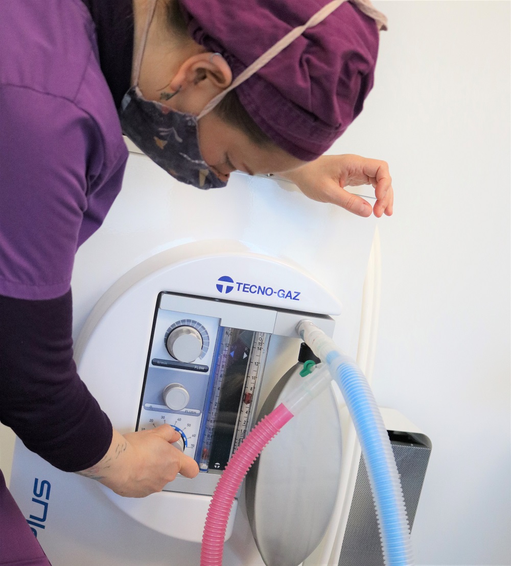 Lachgas wird von der dr. um dem Patienten ein angenehmes Gefühl zu geben, bevor er mit den lokalen Injektionen beginnt.