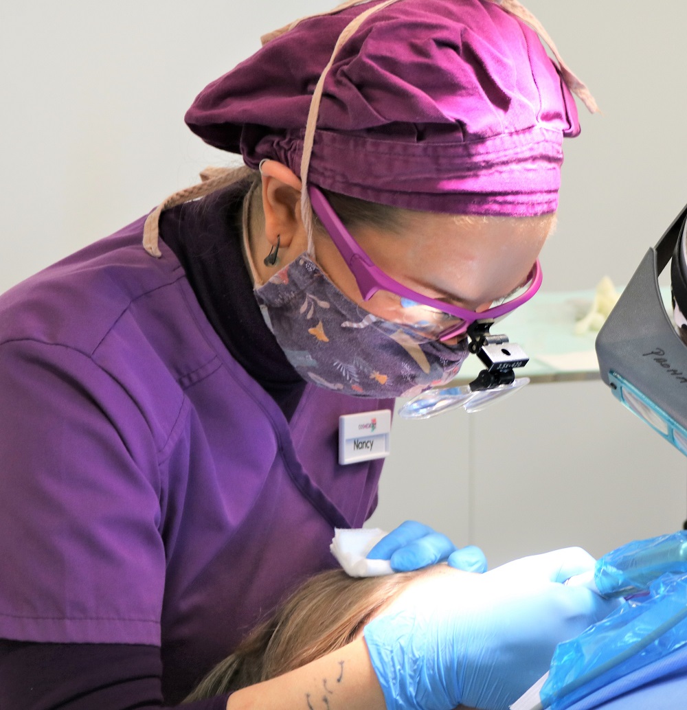 Lokalanästhetika werden von der Dr. Eine Krankenschwester hilft mit einem Vibrationsgerät, um die Nerven abzulenken, was wiederum dem Patienten während der Injektion zugute kommt.