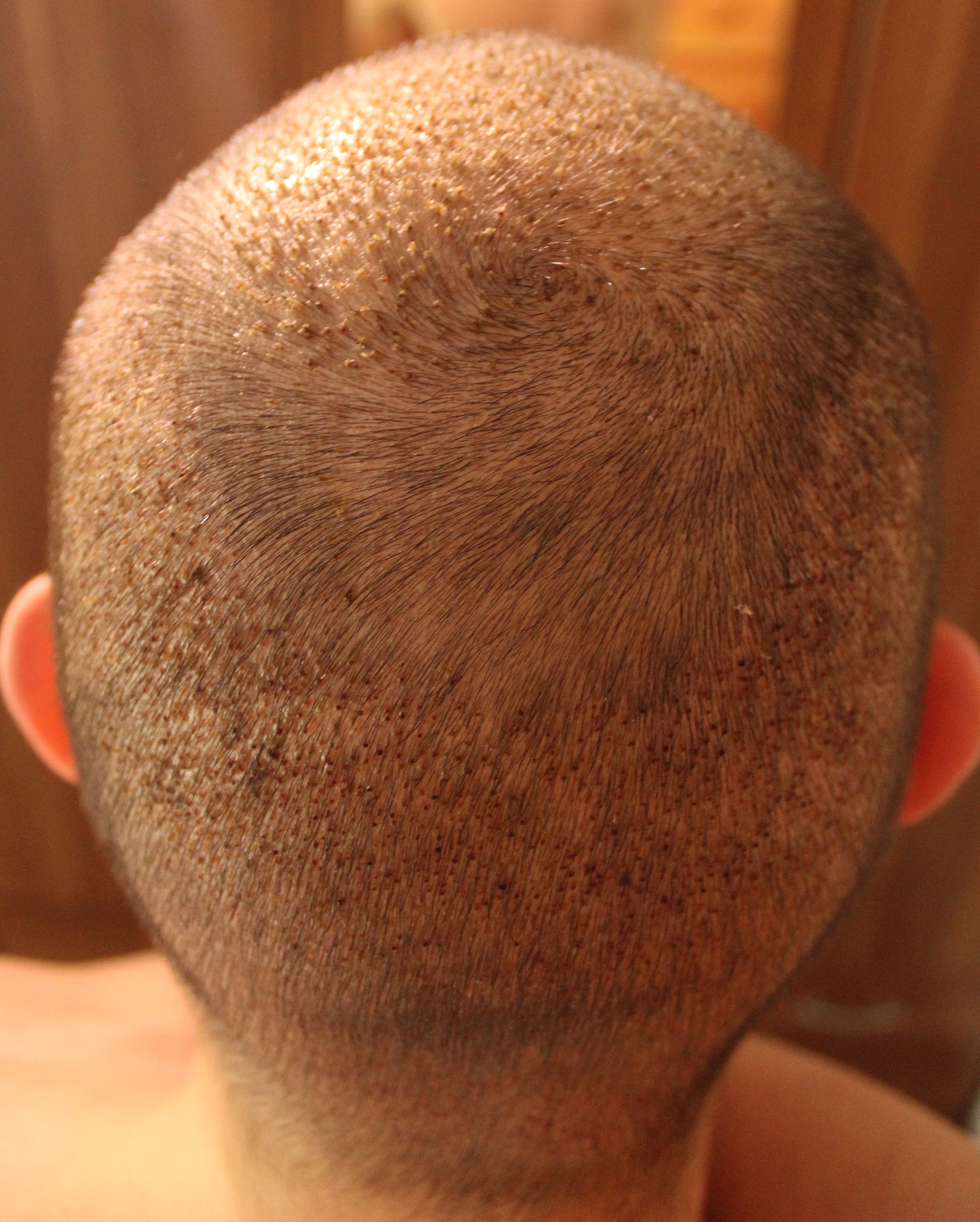 die ersten beiden Bilder entstanden am vierten Tag nach dem Eingriff, die letzten drei Bilder 15 Tage nach dem Eingriff. Laut der Dr. Serkan Aygin Clinic ist es nicht ungewöhnlich, dass die Krusten auch 18 Tage nach der HT noch vorhanden sind. Allerdings sollten die Krusten sich dann doch allmählich durch die Waschvorgänge lösen. Mir wurde gesagt, dass ich jetzt auch mit etwas Shampoo und Lotion nachhelfen soll.