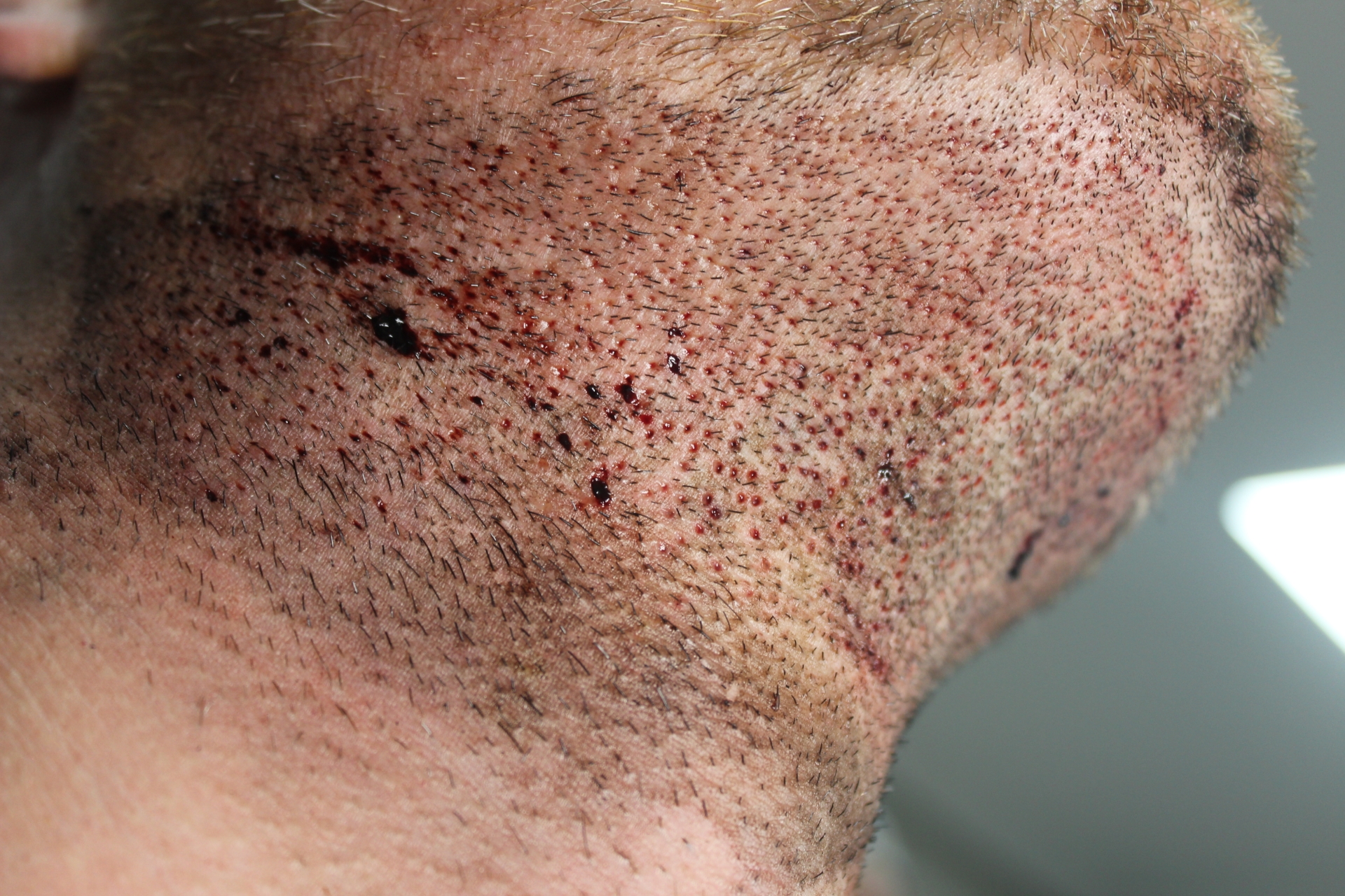 In der Klinik angekommen an Tag1: Beratungsgespräch mit Dr. Pekiner, Einigung auf gewünschte Haarlinie und Präferenzen im Bezug auf die Dichte in bestimmten Regionen, dann Vollrasur und erste Graft-Entnahme-Session. Die Verabreichung der Lokal-Anästhesie in Donor- und Empfängerbereich war etwas schmerzhafter, als ich es erwartet hätte, aber wir haben immer wieder kleine Pausen eingelegt. Ganze OP-Stimmung sehr transparent und kompetent. Habe mir die lange Liegezeit während der OP mit in-ear Kopfhörern + Audiobüchern erträglicher gemacht – kann ich jedem empfehlen. Dann im Prinzip drei 3 Tage lang dasselbe Prozedere, Graft-Entnahme-Sessions gefolgt von Einpflanze-Sessions, dazwischen Mittagspause mit exzellent gekochtem Essen. An den Abenden Verband am Kopf, Antibiotika prophylaktisch, hatte kaum Schmerzen und konnte gut schlafen.