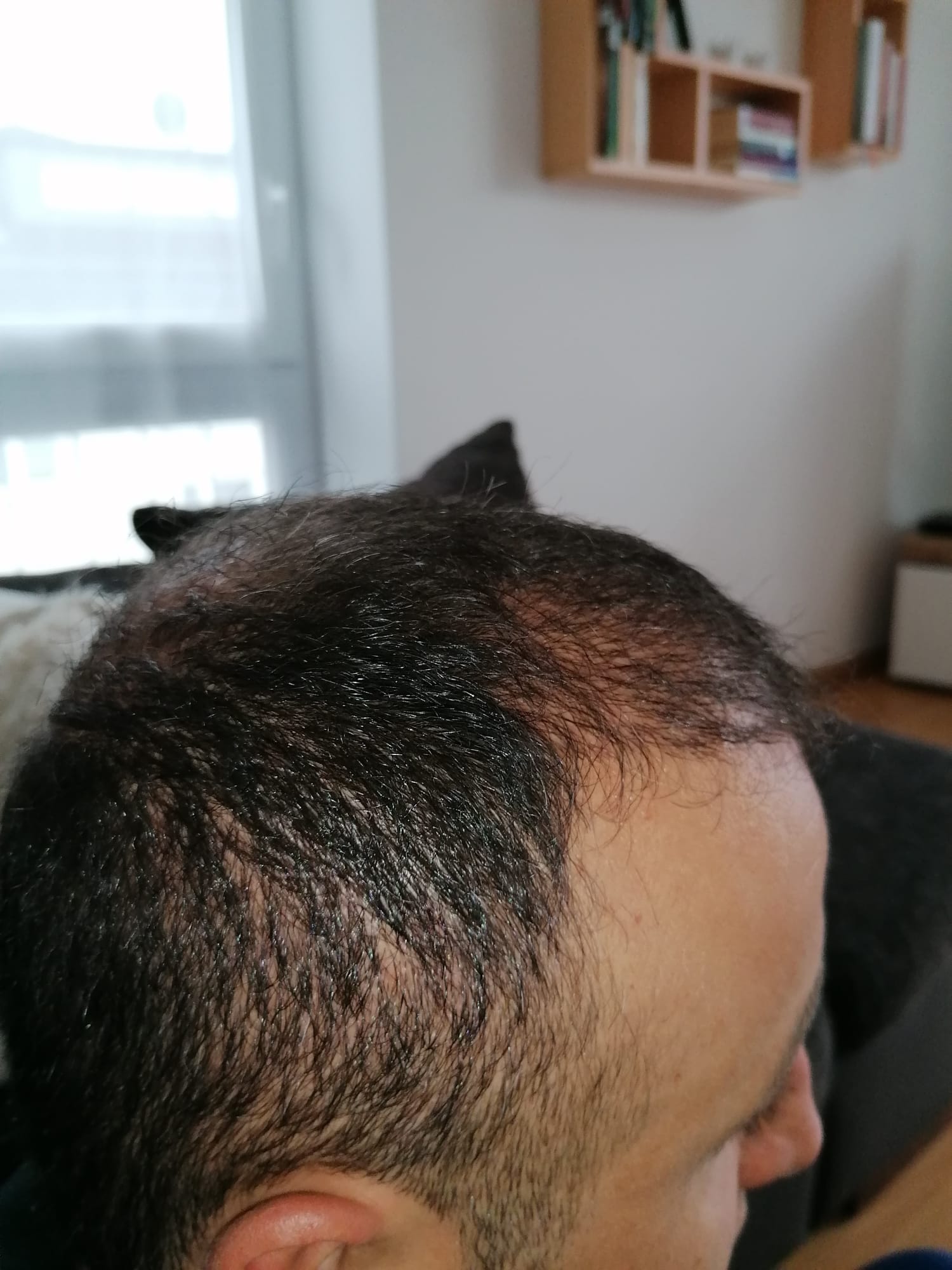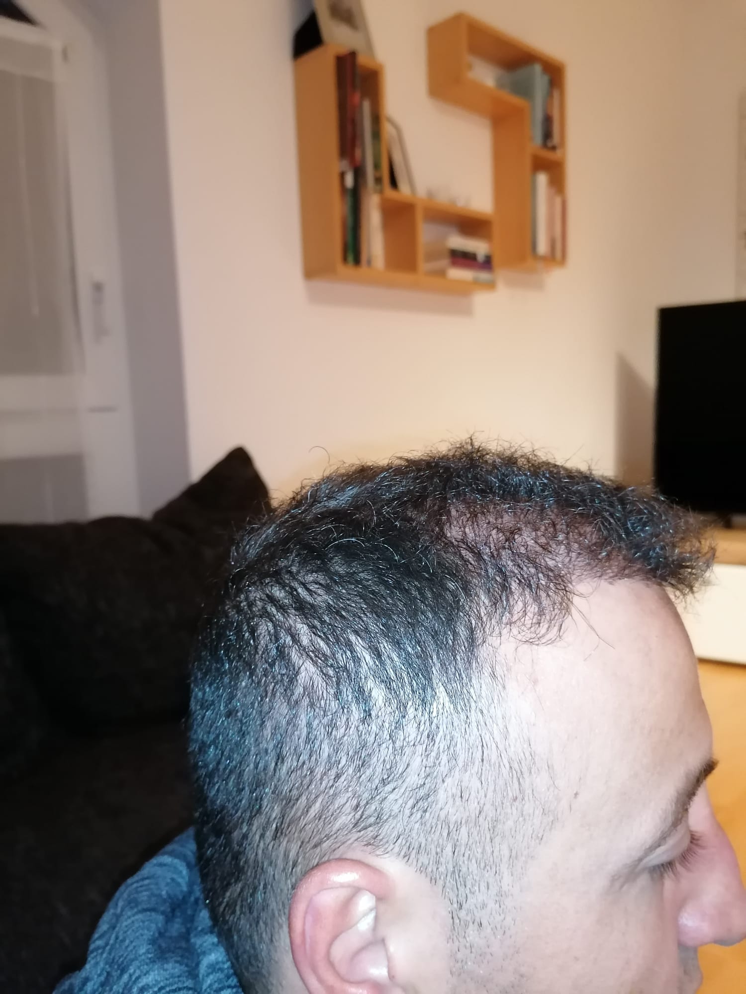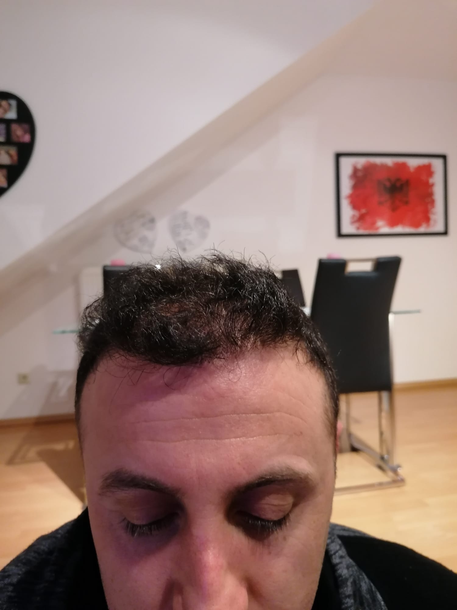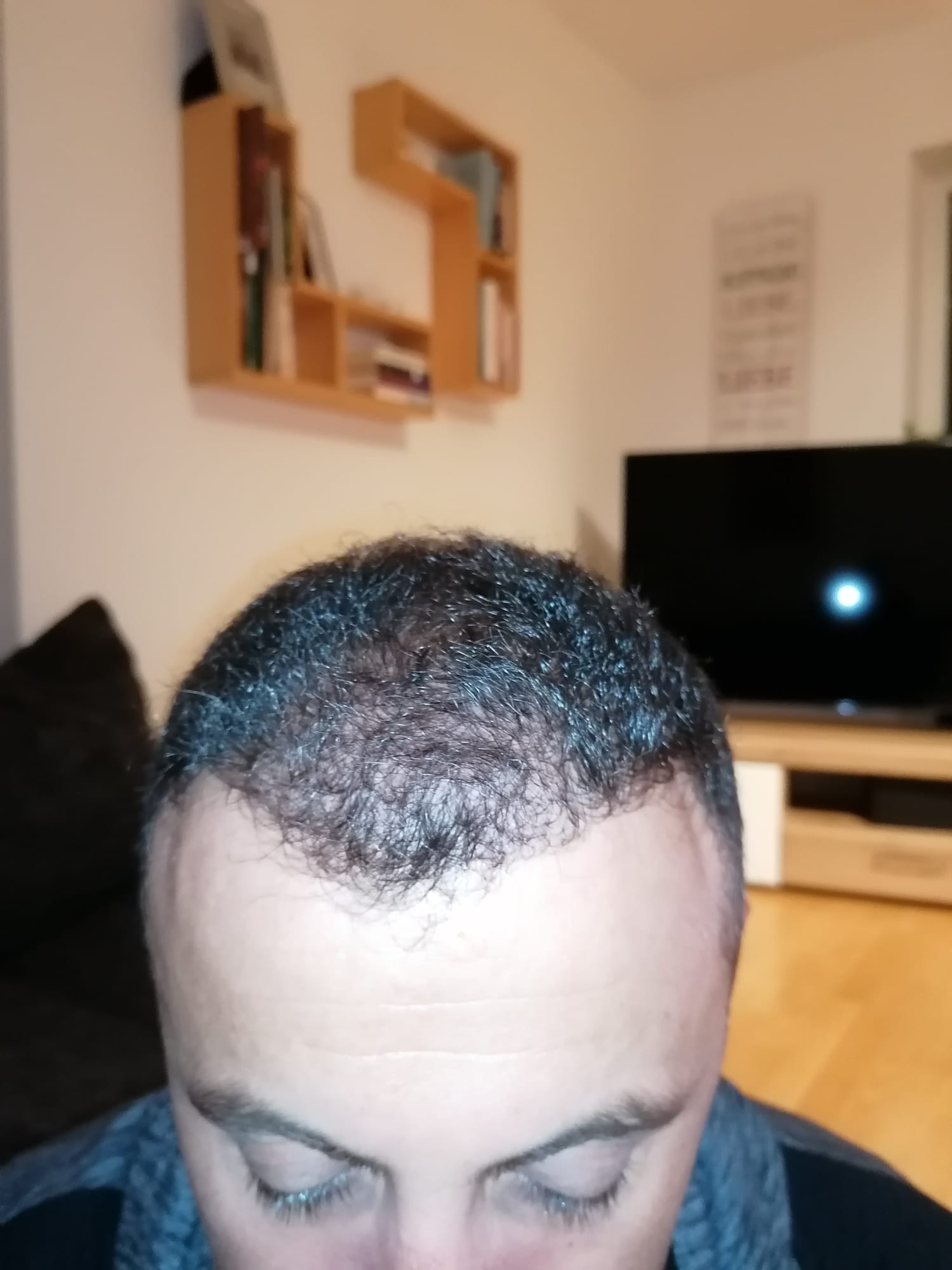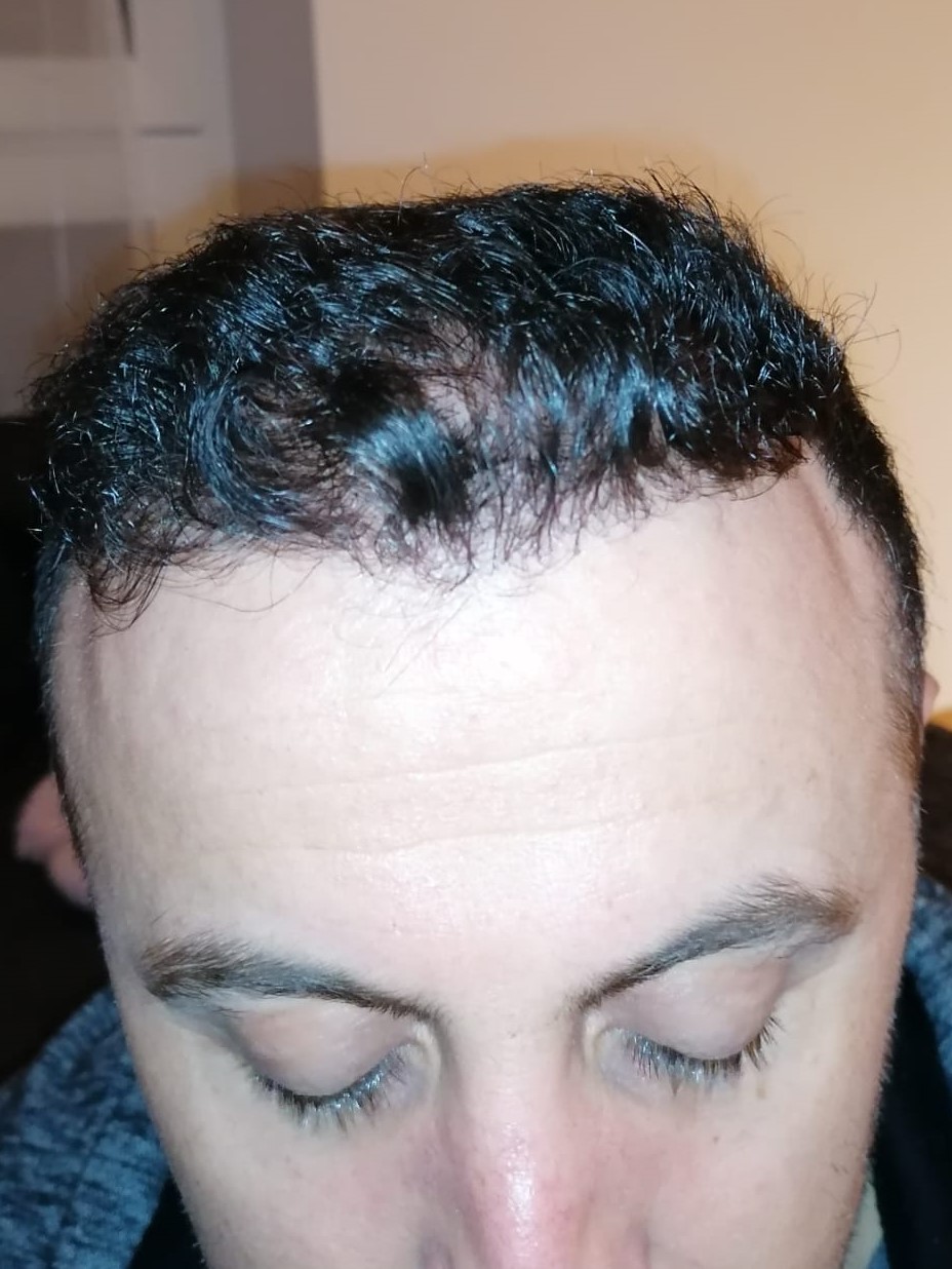 Hallo, mir geht es sehr gut. Das Jucken im vorderen Bereich ist teilweise noch da, gerade wenn ich schwitze. Aber ich habe keine Beschwerden oder Schmerzen. Nach 6 Wochen darf ich auch wieder meine Haare unter der Dusche waschen, was schon eine Erleichterung ist. Wie auf den Bildern zu sehen ist, wachsen die Haare auf dem Hinterkopf. Am Vorderkopf fallen die Haare im Moment stark aus. Das ist aber normal, wurde mir gesagt. In 14 Tagen gibt es neue Infos. Bei Fragen gerne schreiben