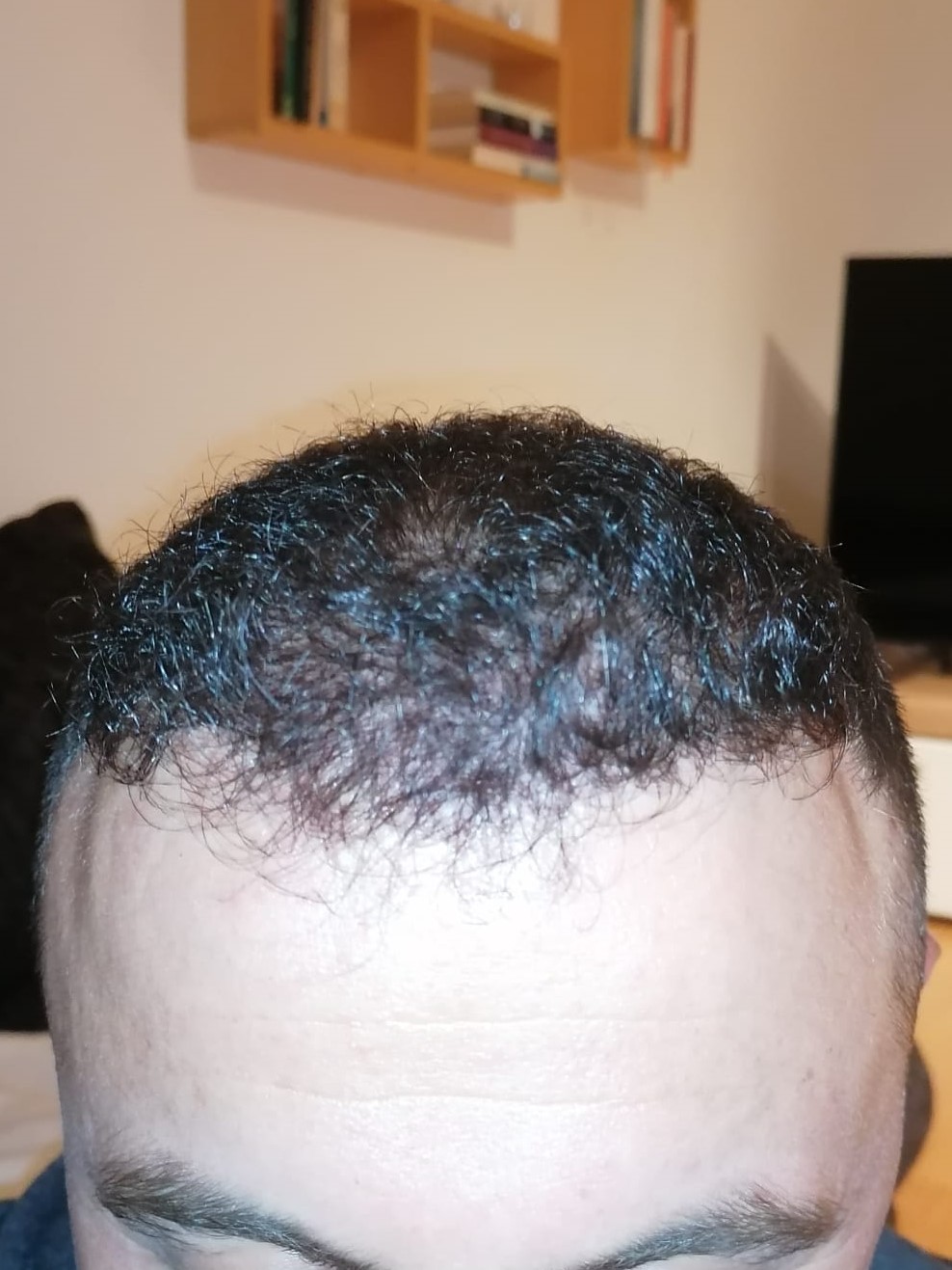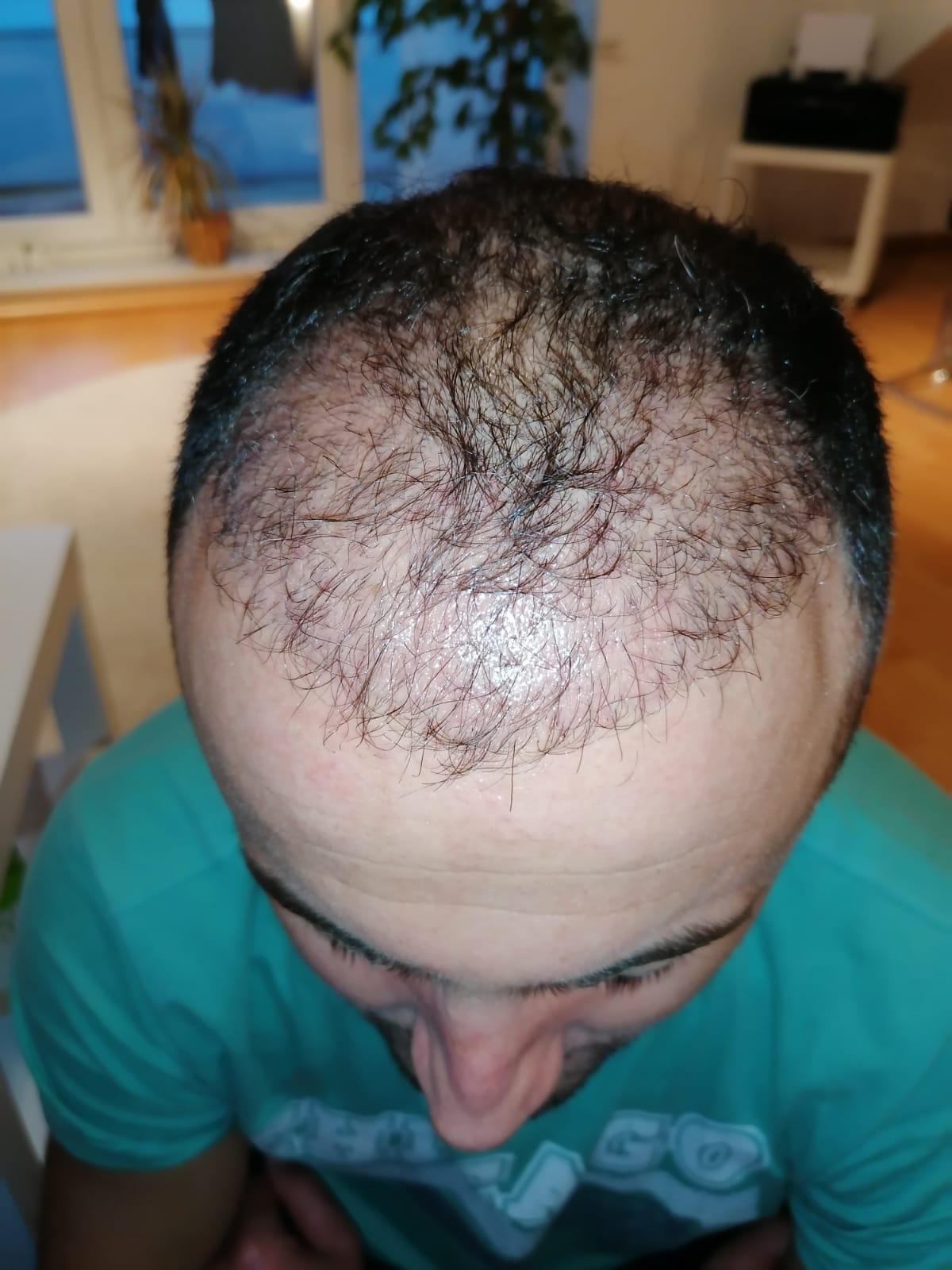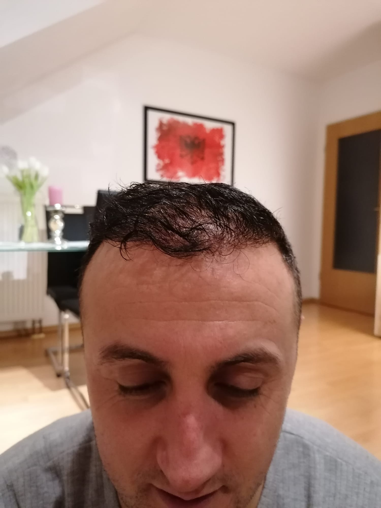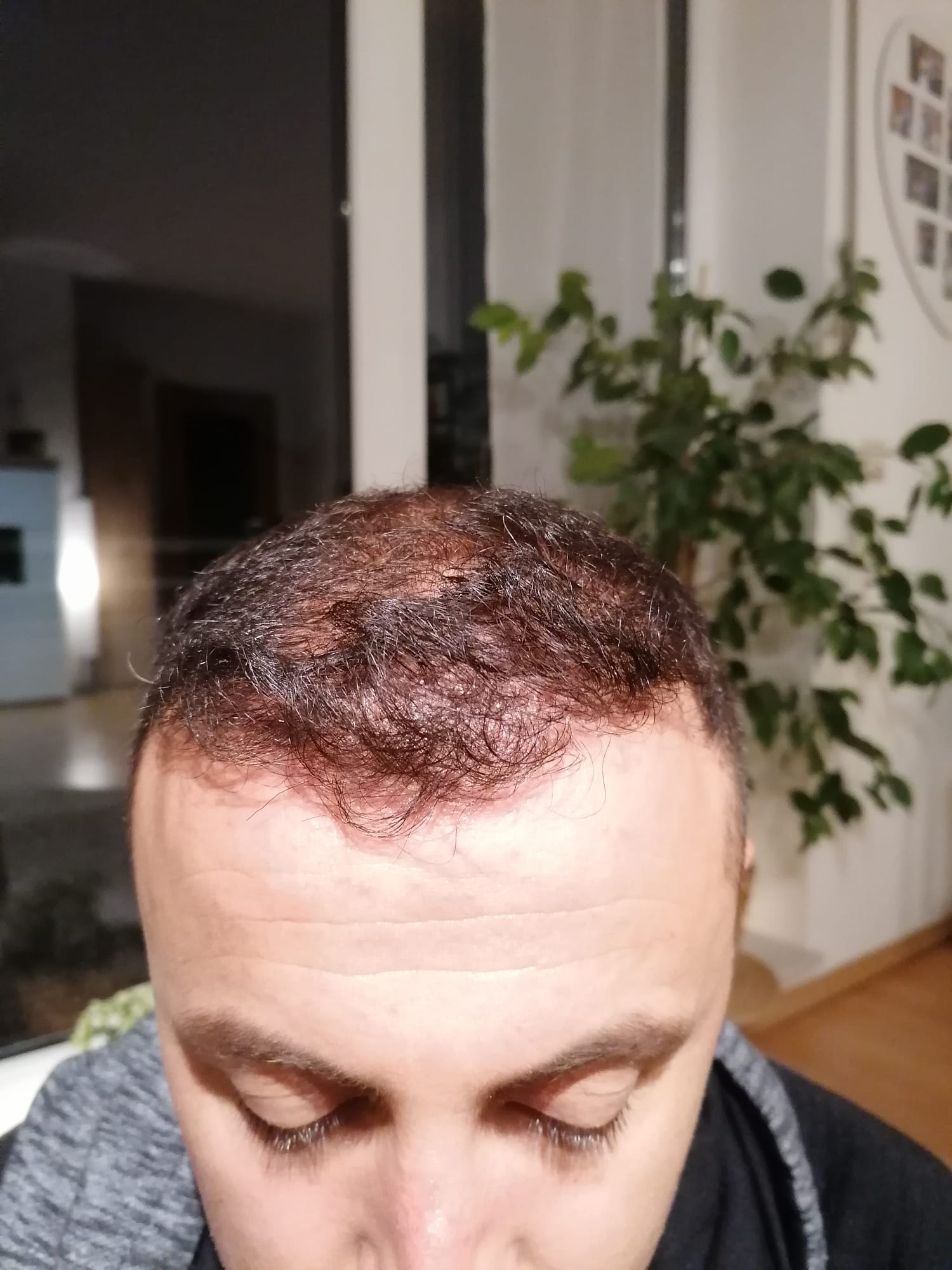 Hallo, mir geht es sehr gut. Das Jucken im vorderen Bereich ist teilweise noch da, gerade wenn ich schwitze. Aber ich habe keine Beschwerden oder Schmerzen. Nach 6 Wochen darf ich auch wieder meine Haare unter der Dusche waschen, was schon eine Erleichterung ist. Wie auf den Bildern zu sehen ist, wachsen die Haare auf dem Hinterkopf. Am Vorderkopf fallen die Haare im Moment stark aus. Das ist aber normal, wurde mir gesagt. In 14 Tagen gibt es neue Infos. Bei Fragen gerne schreiben