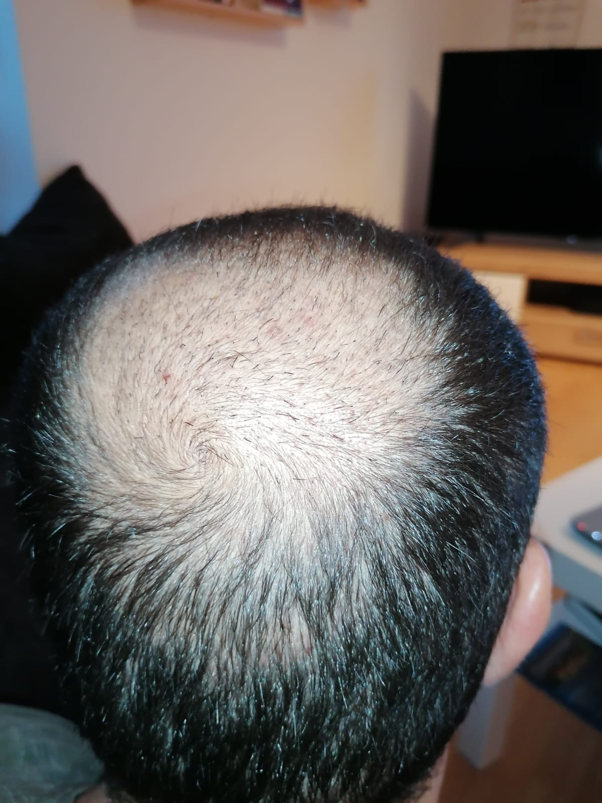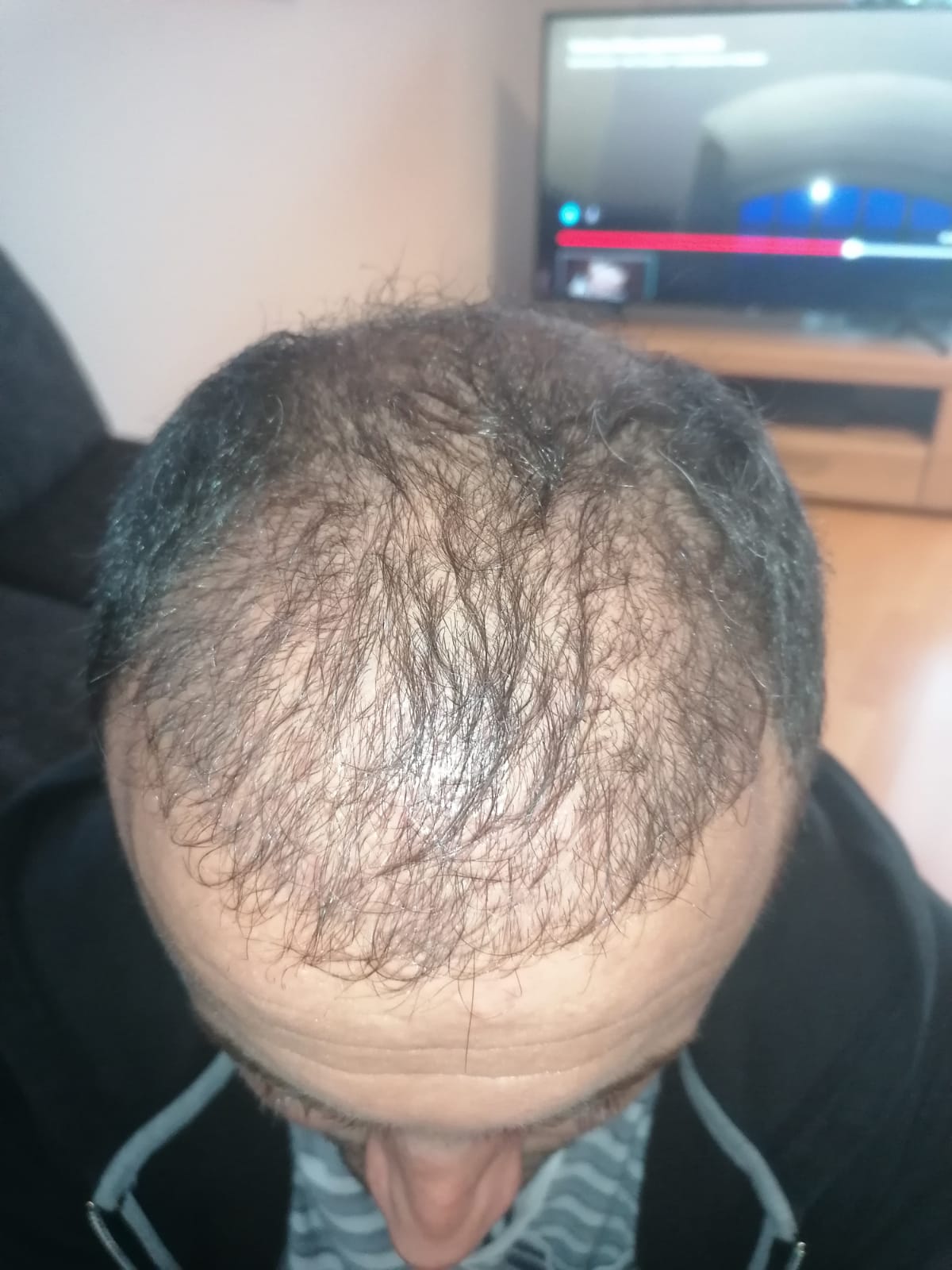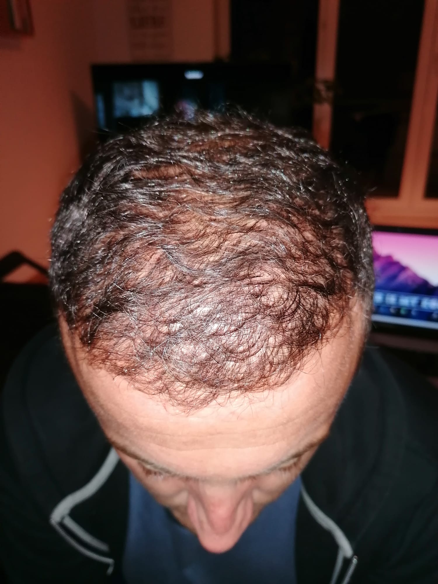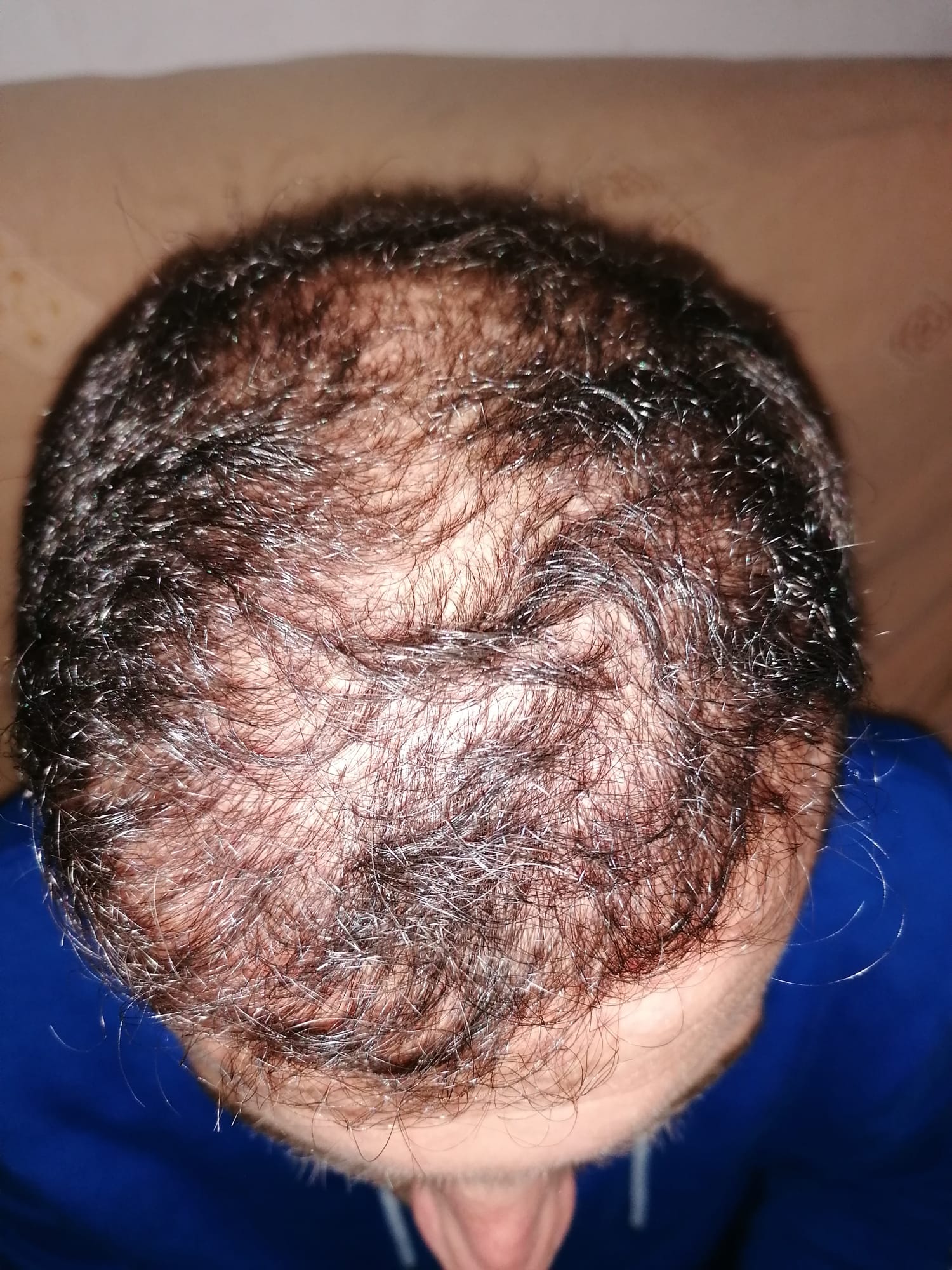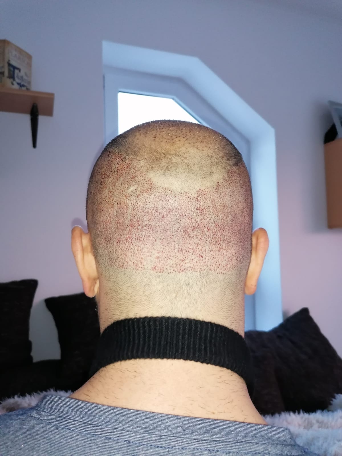 Hallo, mir geht es sehr gut. Das Jucken im vorderen Bereich ist teilweise noch da, gerade wenn ich schwitze. Aber ich habe keine Beschwerden oder Schmerzen. Nach 6 Wochen darf ich auch wieder meine Haare unter der Dusche waschen, was schon eine Erleichterung ist. Wie auf den Bildern zu sehen ist, wachsen die Haare auf dem Hinterkopf. Am Vorderkopf fallen die Haare im Moment stark aus. Das ist aber normal, wurde mir gesagt. In 14 Tagen gibt es neue Infos. Bei Fragen gerne schreiben