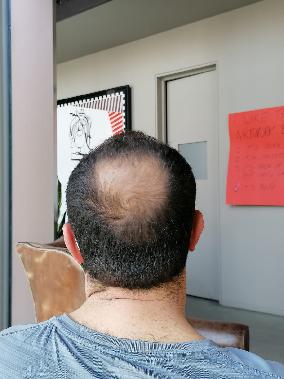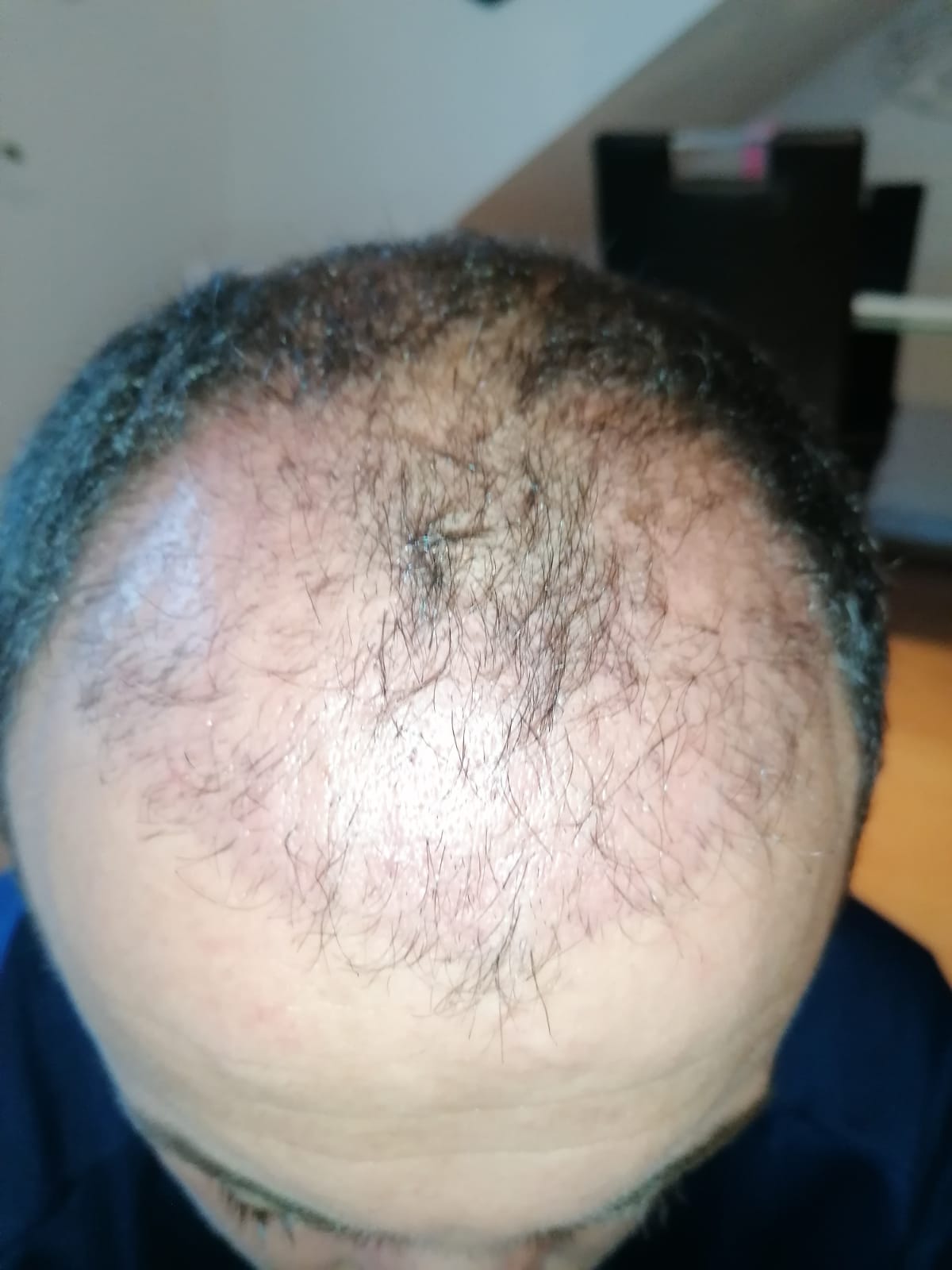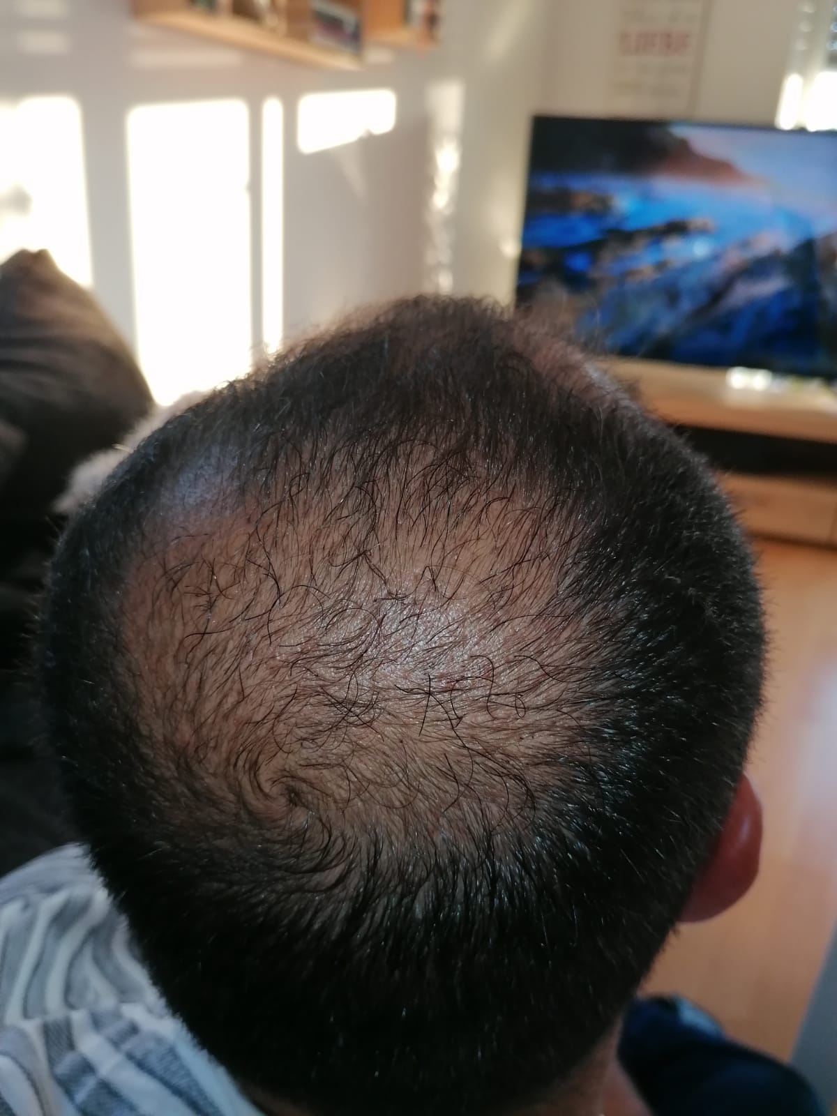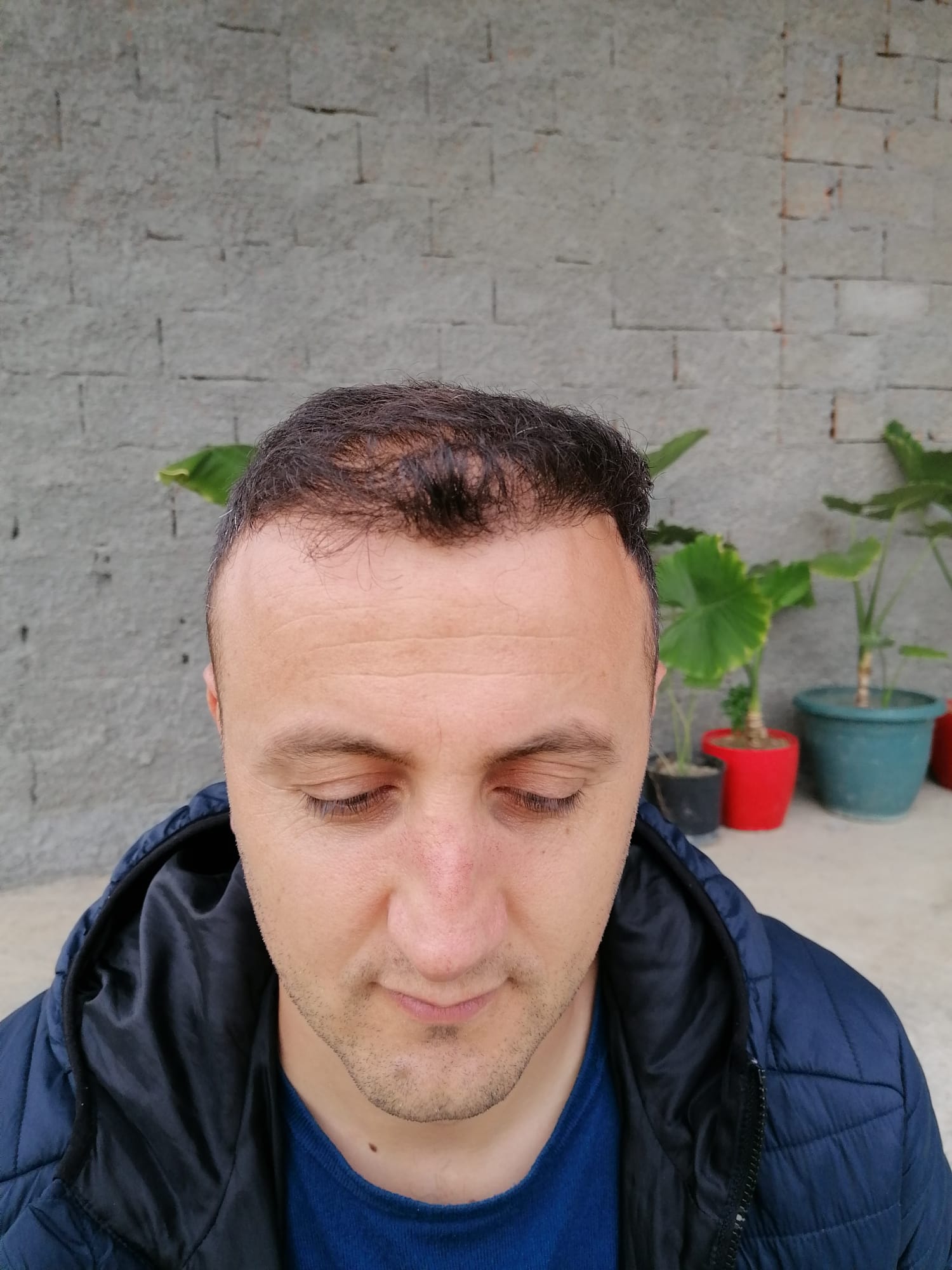 Hallo, mir geht es sehr gut. Das Jucken im vorderen Bereich ist teilweise noch da, gerade wenn ich schwitze. Aber ich habe keine Beschwerden oder Schmerzen. Nach 6 Wochen darf ich auch wieder meine Haare unter der Dusche waschen, was schon eine Erleichterung ist. Wie auf den Bildern zu sehen ist, wachsen die Haare auf dem Hinterkopf. Am Vorderkopf fallen die Haare im Moment stark aus. Das ist aber normal, wurde mir gesagt. In 14 Tagen gibt es neue Infos. Bei Fragen gerne schreiben