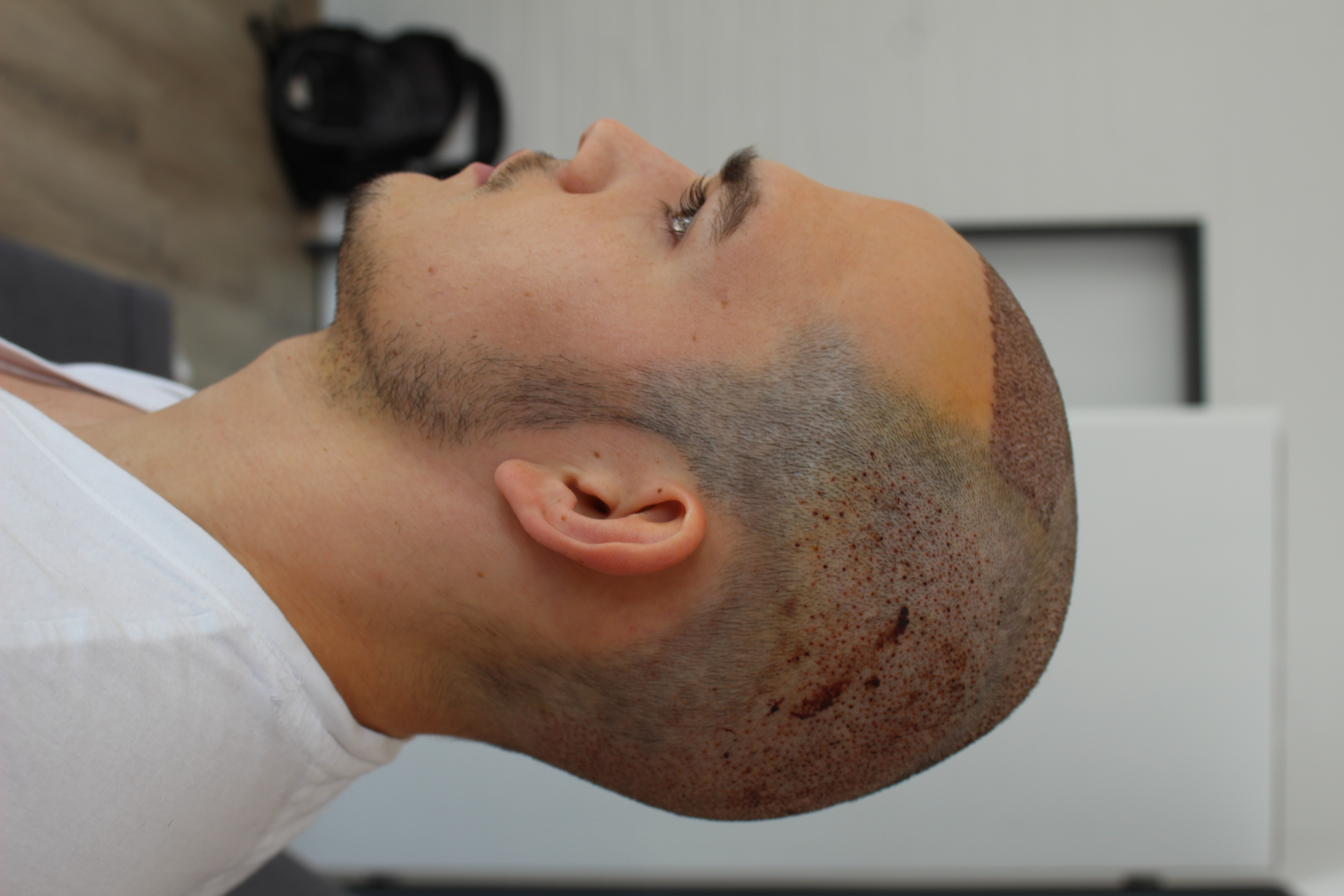 Nachdem der Eingriff erfolgreich durchgeführt wurde, wurden erneut Fotos zur Protokollierung gemacht. Abschließend bekam ich noch eine warme Mahlzeit und eine kurze Einweisung hinsichtlich der Medikamenteneinnahme und des weiteren Ablaufs. Die kommende Nacht konnte ich überraschend gut schlafen. Am nächsten Morgen wurde noch mein Verband entnommen und die Laserbehandlung zur Verbesserung des Heilungsprozesses durchgeführt. Die kommenden Tage waren die Schwellungen und Rötungen durch den Eingriff noch deutlich zu sehen. Alles in allem fühlte ich mich jedoch nie unwohl. Inzwischen - 7 Tage später - ist die Schwellung bereits vollständig verschwunden. Auch meine Kopfhaut sieht schon bedeutend besser aus und die ersten Krusten fallen nach und nach ab.