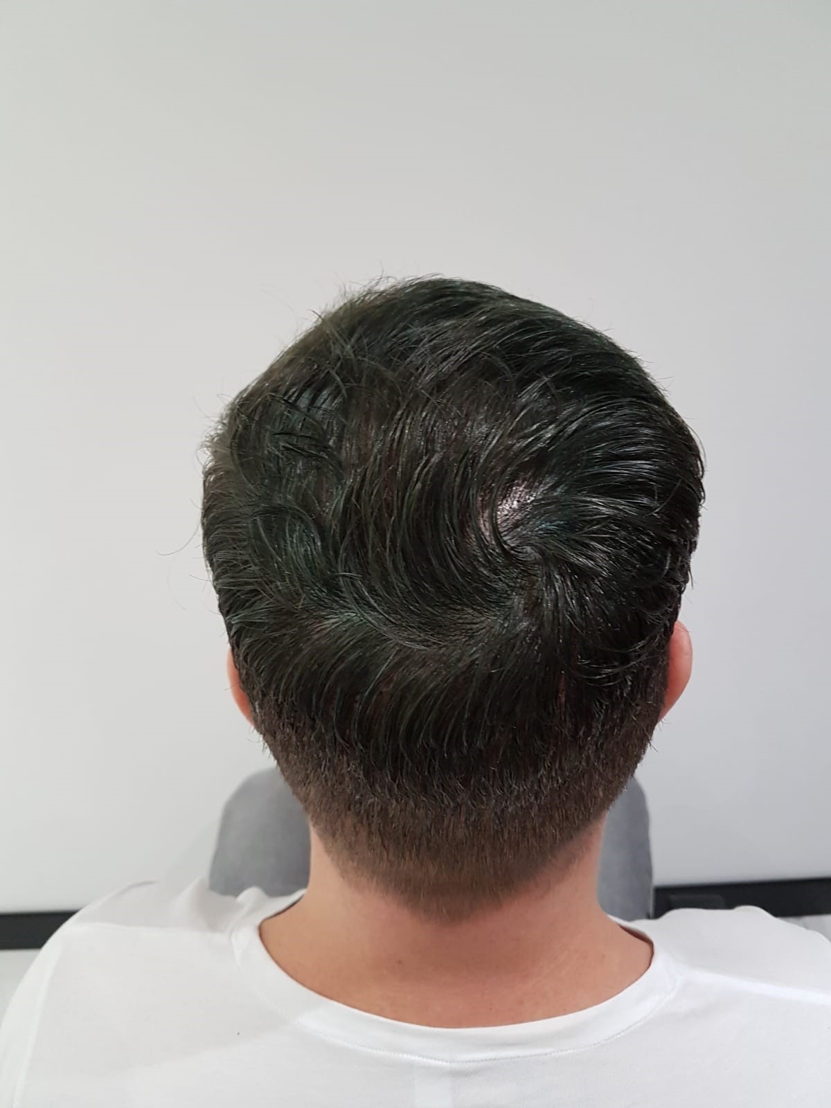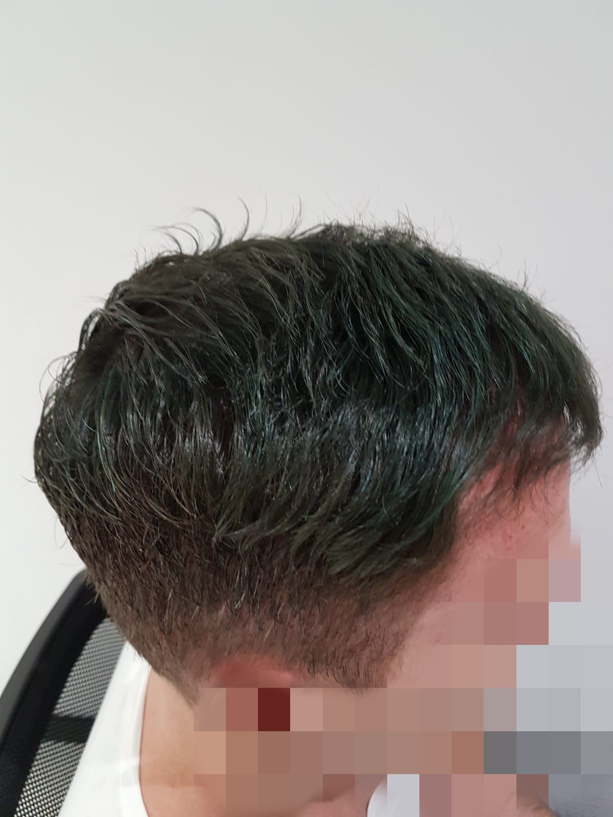 Bei der Haarwäsche nahm sich Dr. Harun persönlich Zeit, mich wieder so gesellschaftsfähig wie möglich zu machen, indem alle Krusten im Bereich des Donors abgewaschen wurden und die Haare des Oberkopfes kalt geföhnt und vorsichtig gekämmt wurden. Von der Entnahme sah man in meinem Fall gar nichts. Vorne und hinten wurden die Haare entsprechend so geföhnt das man ebenfalls nichts vom Eingriff sehen konnte. Meine Haarfarbe hatte lediglich einen leichten Grünstich, da für das Einsetzen der Grafts ein Farbmittel für die Arzthelfer benutzt wurde, damit diese die Kanäle besser sehen können in dem ganze Haar-Gewühl.