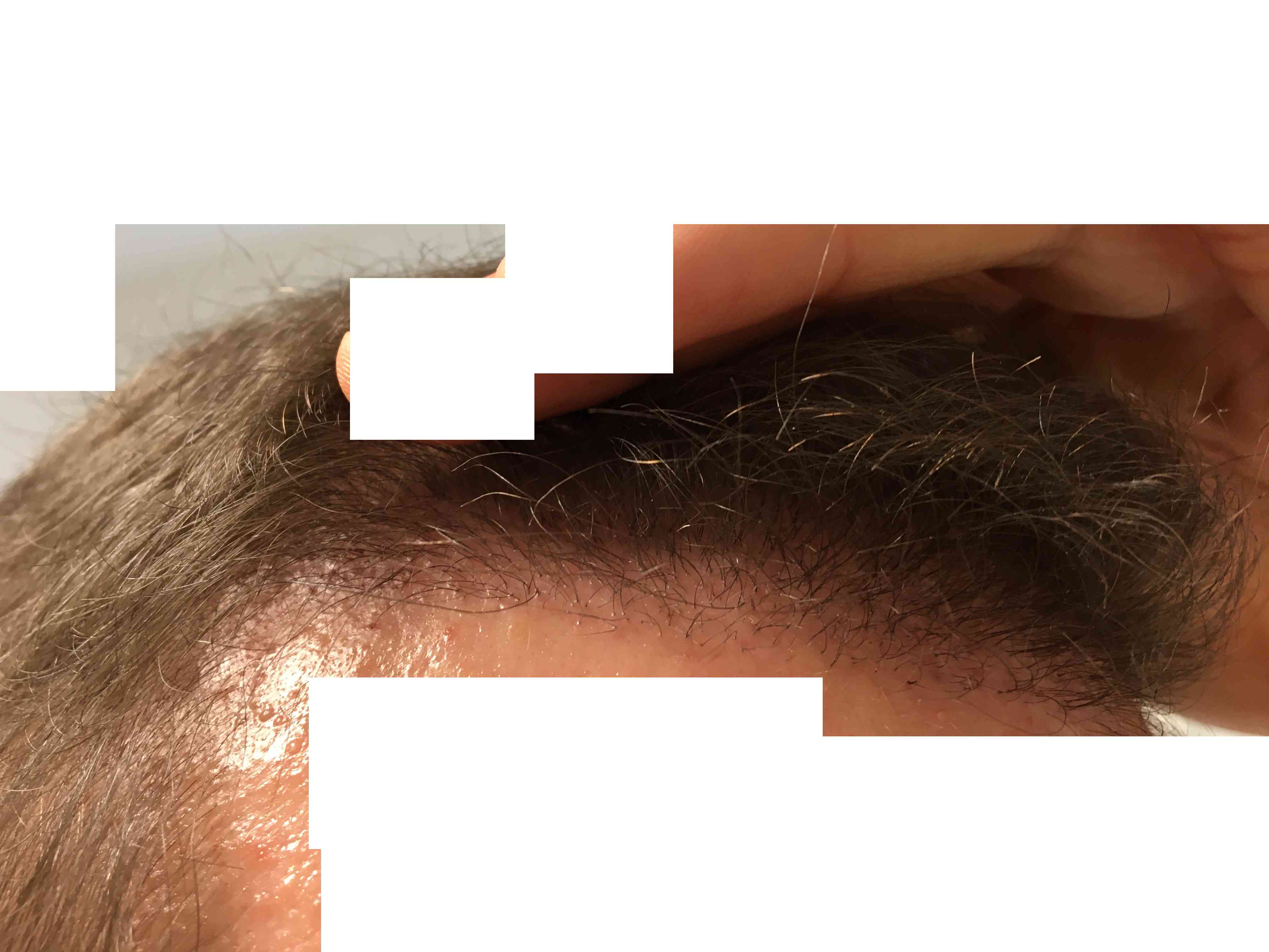 Hier war für mich nun interessant zu sehen, dass der Schock-Loss nicht vollständig ist. Ich dachte, dass alle transplantierten Haare ausfallen. Dem war aber nicht so. Es war die heruntergesetzte Haarlinie nie kahl. Es gab kahle Stellen, aber überwiegend war auf dem Großteil der Fläche Haare, wenn auch dünn besiedelt.