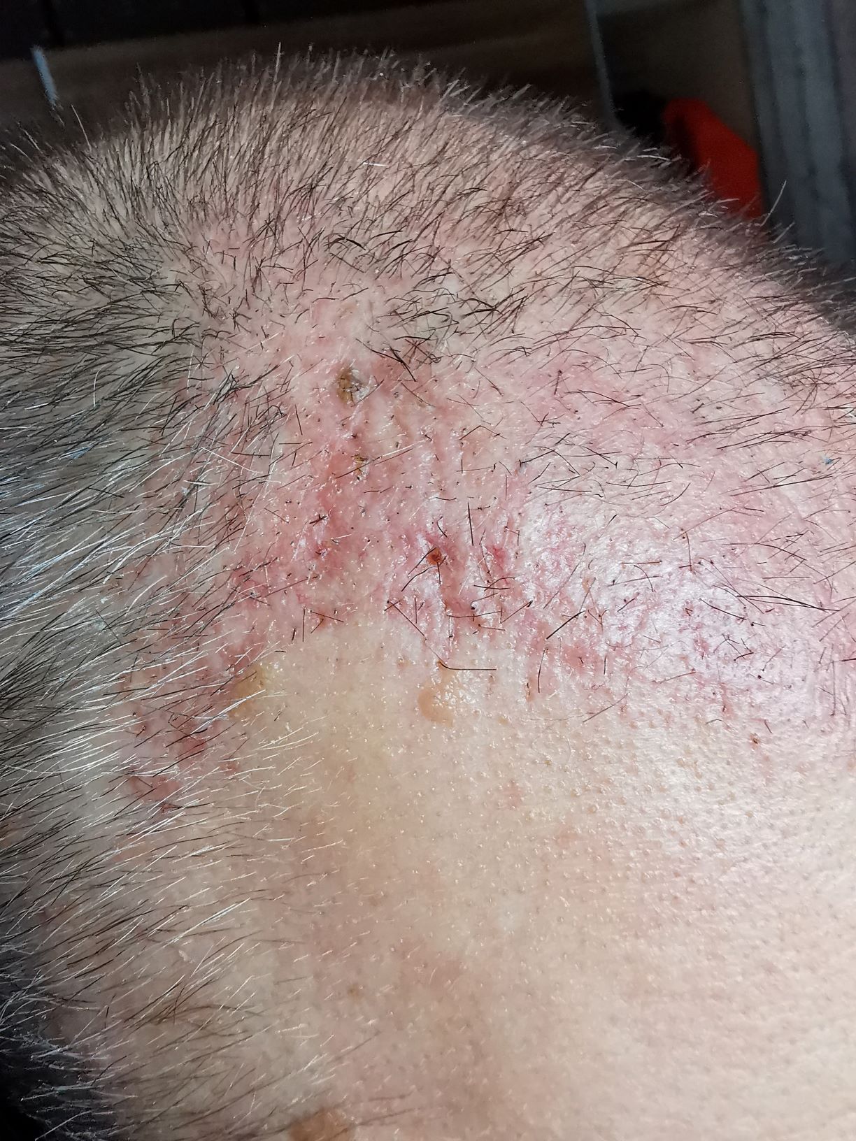 ich bin jetzt 4 Wochen nach meiner HT (3800 Grafts) und frage mich wie bei Euch so das Heilungsverhalten war. Bei mir gab es Stellen im Empfängerbereich, die stärker geblutet haben als die anderen und bei denen die Krusten erst am Tag 14-15 (also vor ca. 2 Woche) abgefallen sind. Diese Bereiche sehen nun so aus wie auf dem Bild - die Unebenheiten sind deutlich zu sehen und zu spüren.