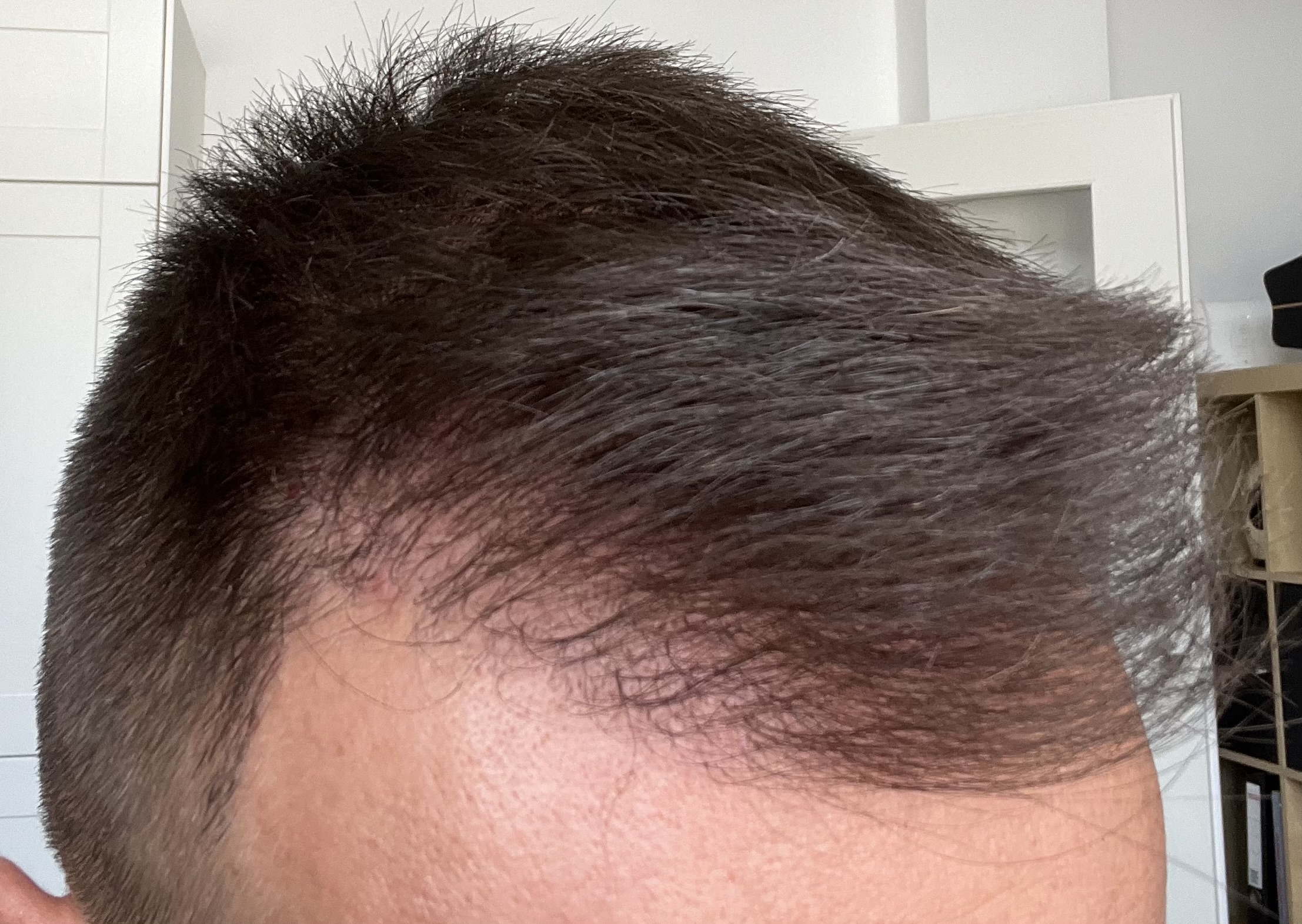 Nach wie vor ist Links meine schwache Seite. Natürlich sehe ich auch hier noch Haare die nach wachsen müssen und hoffentlich noch ein wenig kräftiger werden. Dennoch erwarte ich hier keine Wunder mehr. Aber der Trend ist durchaus positiv. Weiteren Haarausfall beobachte ich Gott sei dank keinen. Ich hoffe dabei bleibt es